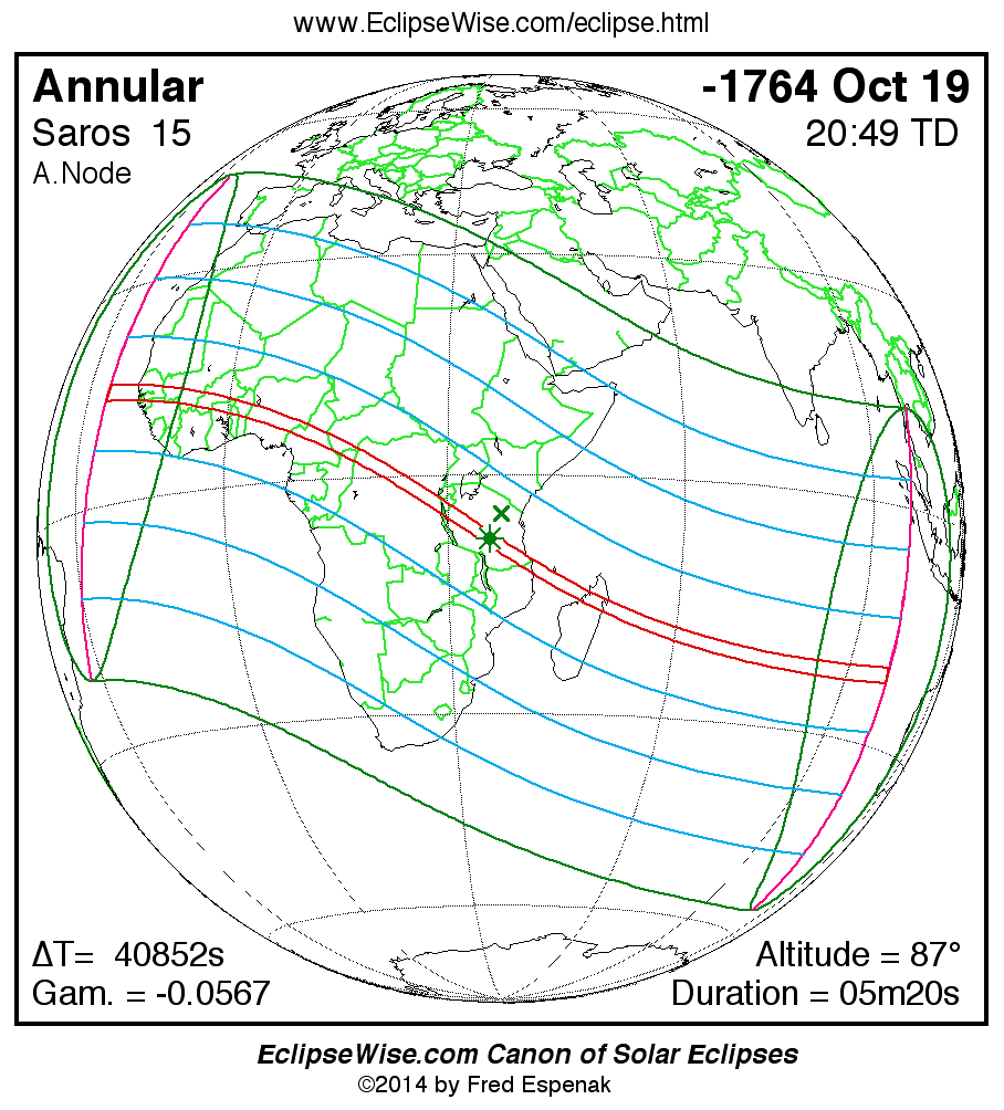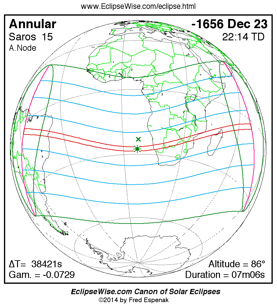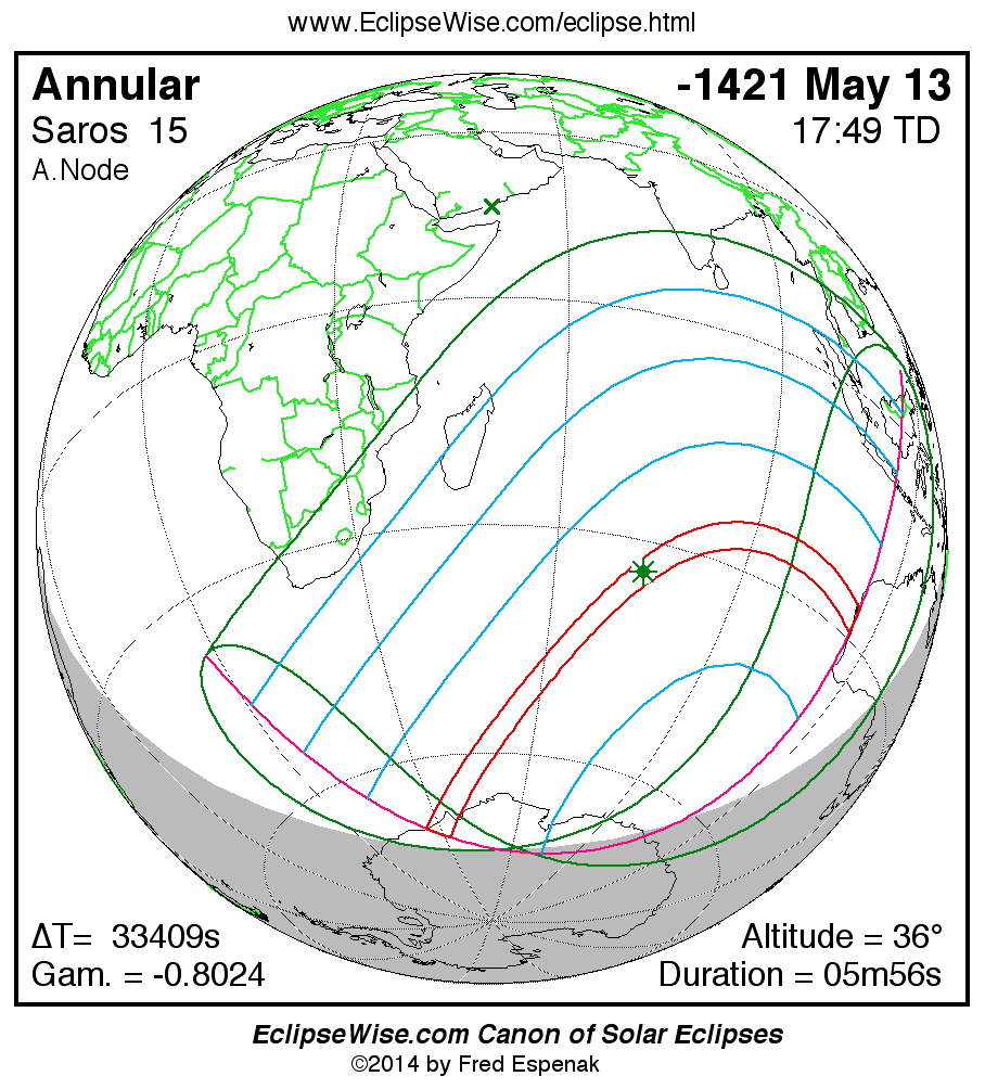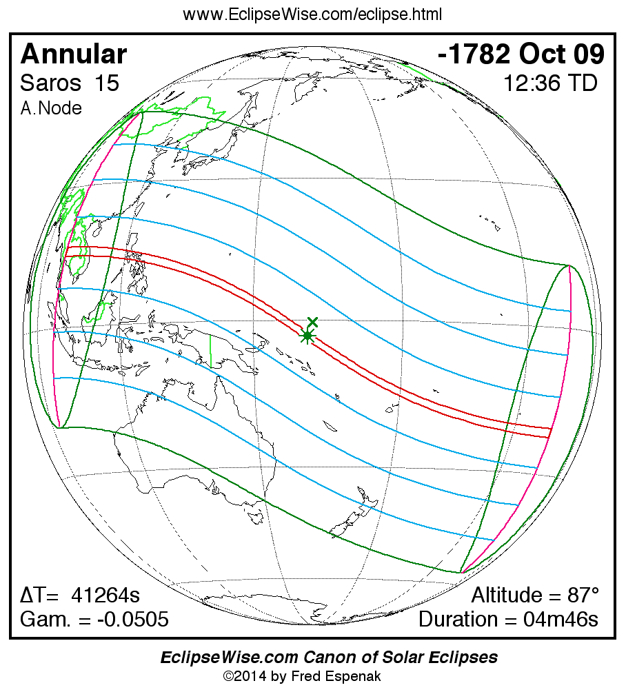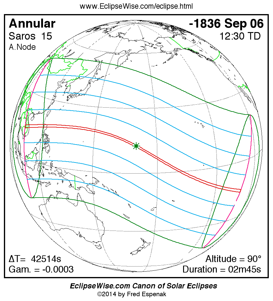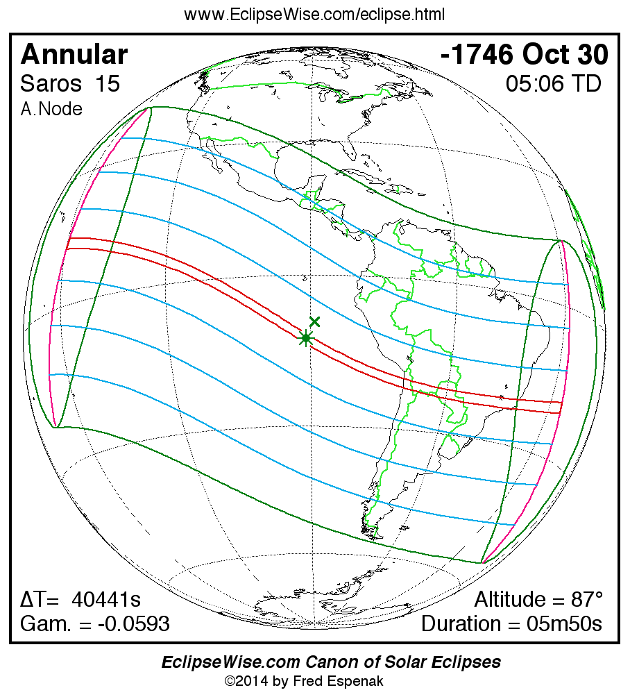 A panorama of all solar eclipses belonging to Saros 15 is presented here. Each map depicts the geographic region of visibility for a single eclipse. For central eclipses, the total or annular path is plotted in either blue (total) or red (annular). The date and time is given for the instant of Greatest Eclipse. Every map serves as a hyperlink to the EclipseWise Prime page for that eclipse where a larger map and complete details for the eclipse can be found. Visit the Key to Solar Eclipse Maps for a detailed explanation of these maps. Near the bottom of the page are a series of hyperlinks for more on solar eclipses.