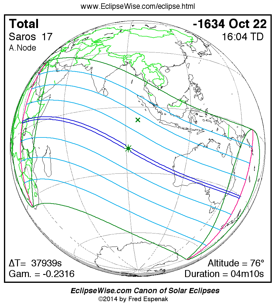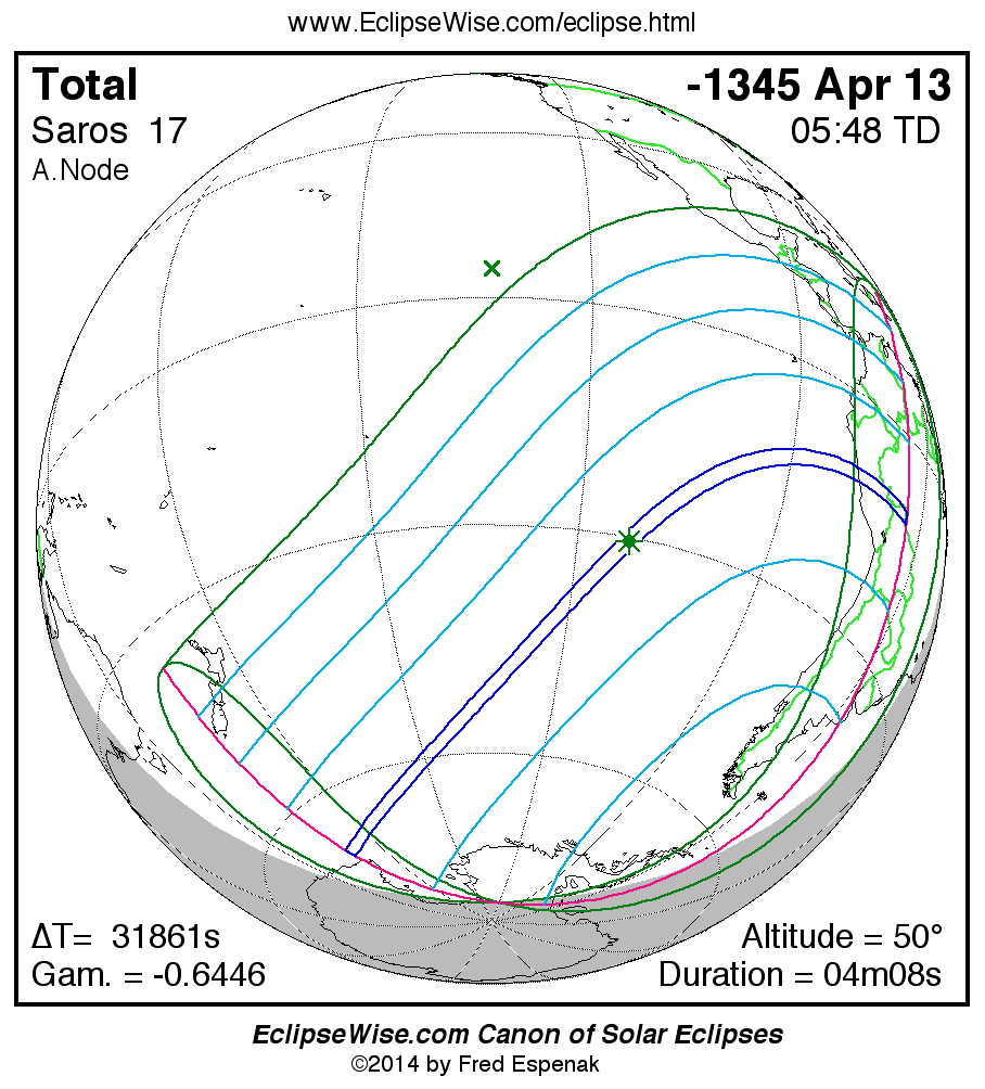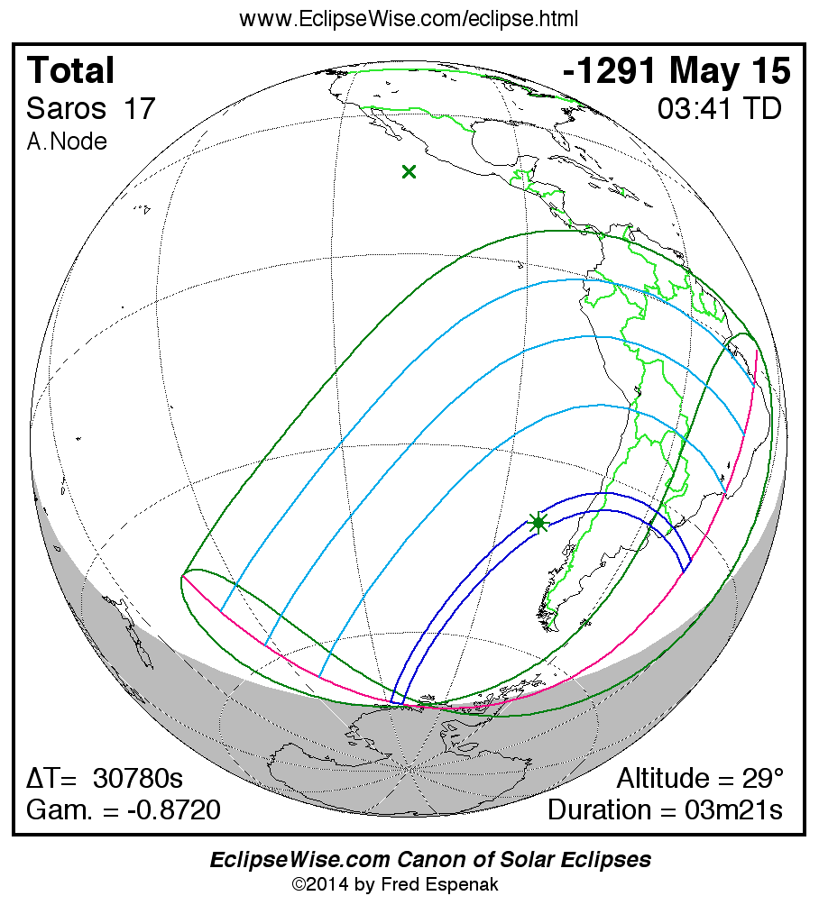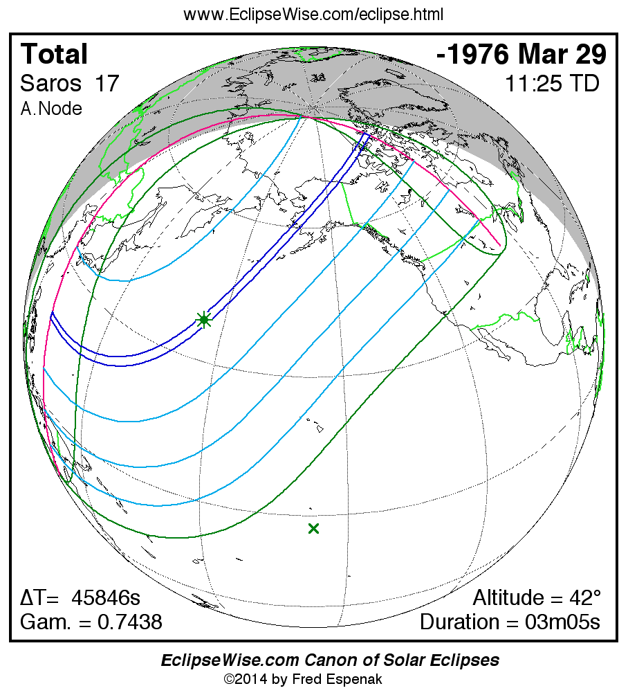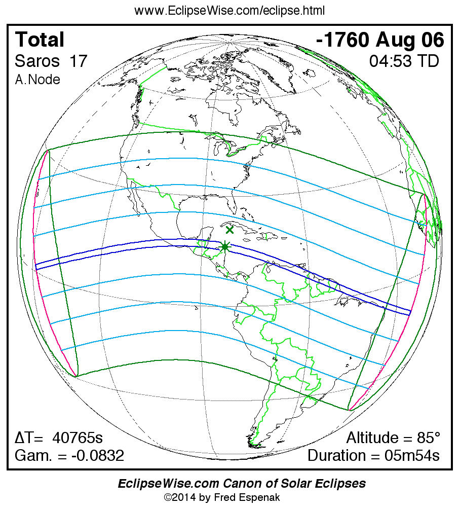 A panorama of all solar eclipses belonging to Saros 17 is presented here. Each map depicts the geographic region of visibility for a single eclipse. For central eclipses, the total or annular path is plotted in either blue (total) or red (annular). The date and time is given for the instant of Greatest Eclipse. Every map serves as a hyperlink to the EclipseWise Prime page for that eclipse where a larger map and complete details for the eclipse can be found. Visit the Key to Solar Eclipse Maps for a detailed explanation of these maps. Near the bottom of the page are a series of hyperlinks for more on solar eclipses.