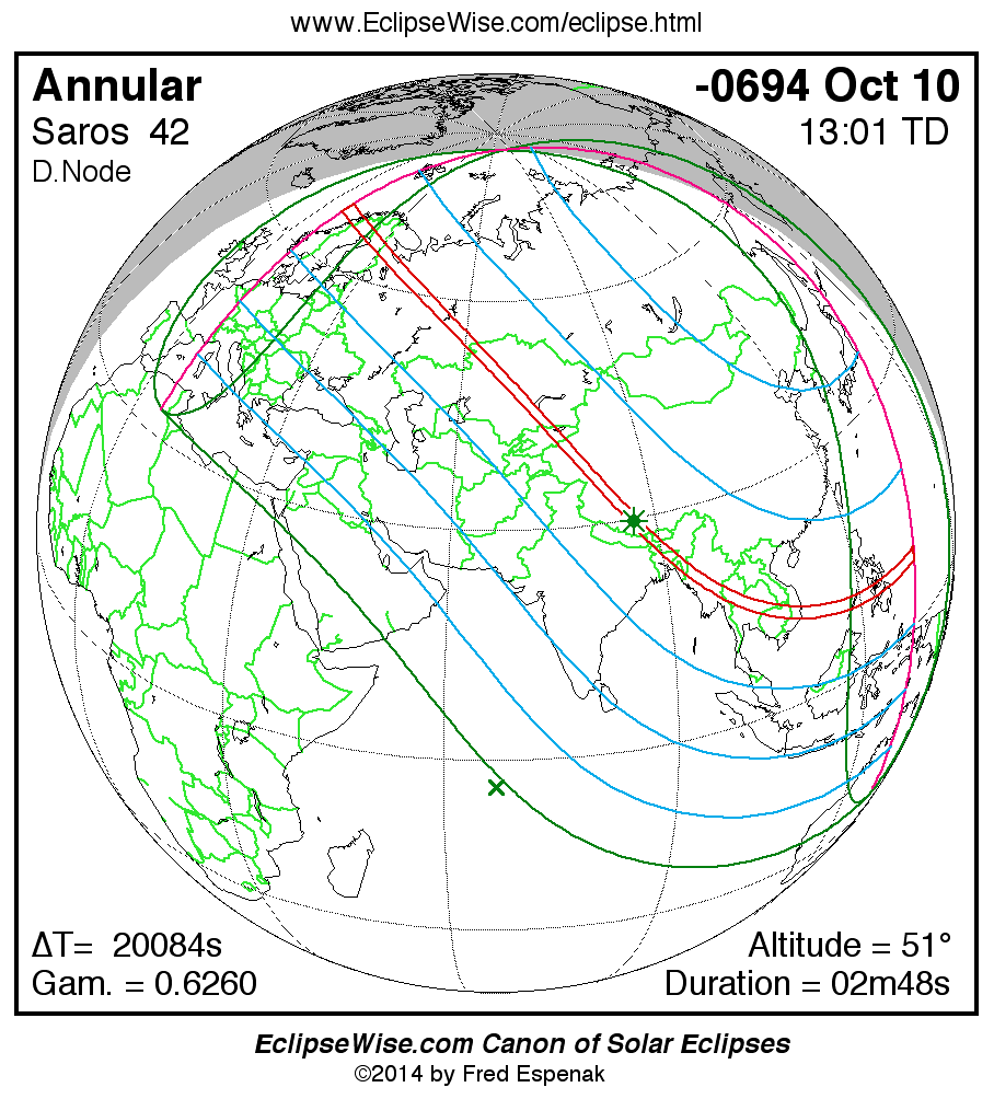 A panorama of all solar eclipses belonging to Saros 42 is presented here. Each map depicts the geographic region of visibility for a single eclipse. For central eclipses, the total or annular path is plotted in either blue (total) or red (annular). The date and time is given for the instant of Greatest Eclipse. Every map serves as a hyperlink to the EclipseWise Prime page for that eclipse where a larger map and complete details for the eclipse can be found. Visit the Key to Solar Eclipse Maps for a detailed explanation of these maps. Near the bottom of the page are a series of hyperlinks for more on solar eclipses.