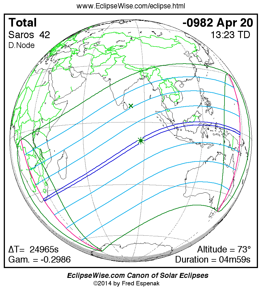 The Saros panorama below is arranged in horizontal rows of 3 eclipses. So one eclipse to the left or right is a difference of 1 Saros cycle, and one eclipse above or below is a difference of 1 exeligmos. By scanning a column of the table, it reveals how the geographic visibility of eclipses separated by an exeligmos slowly changes.