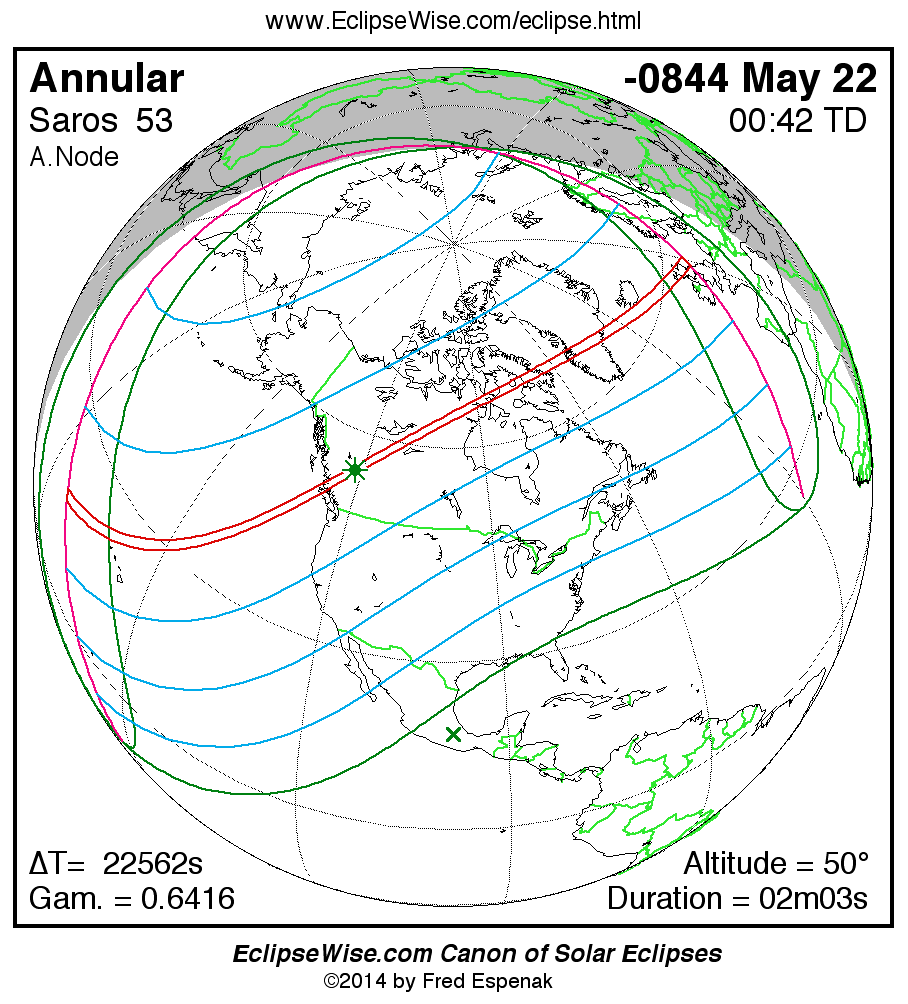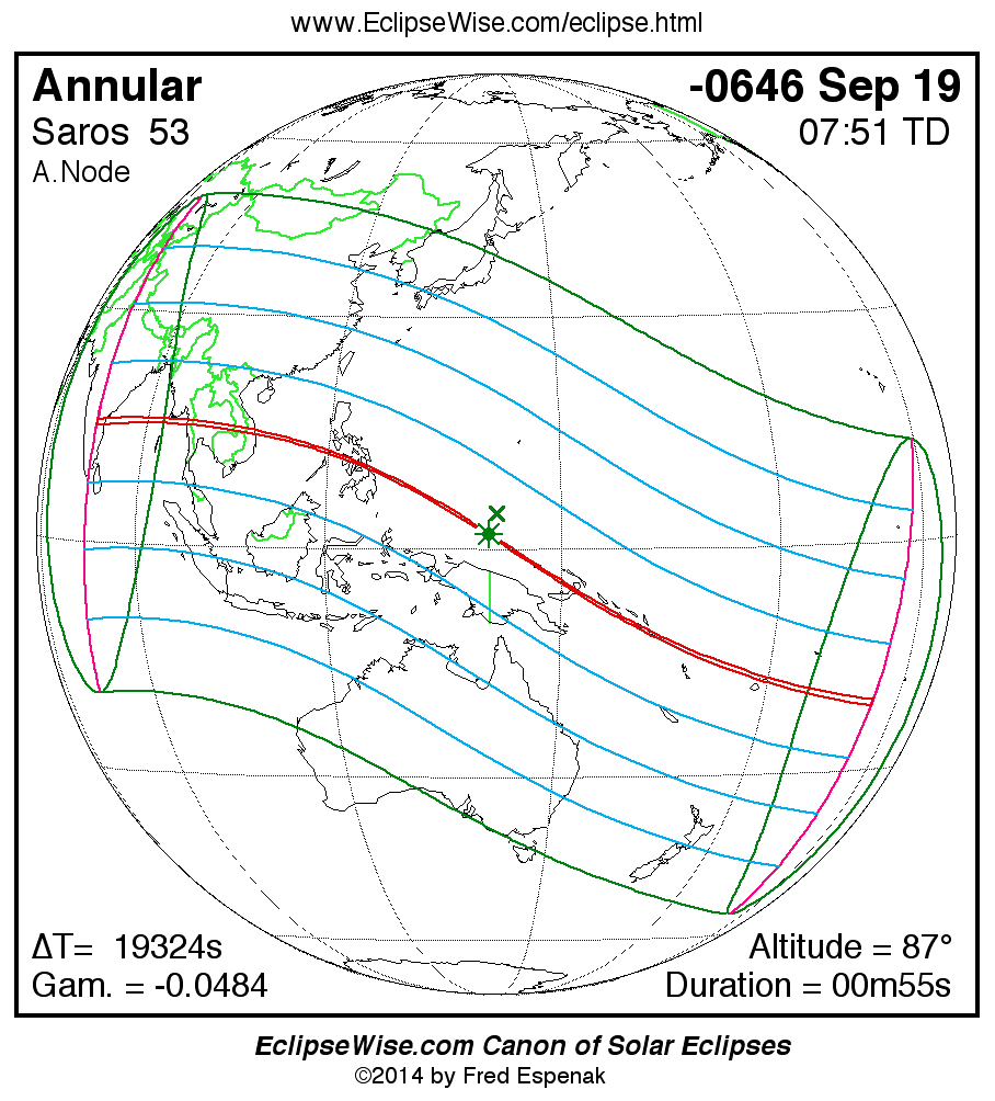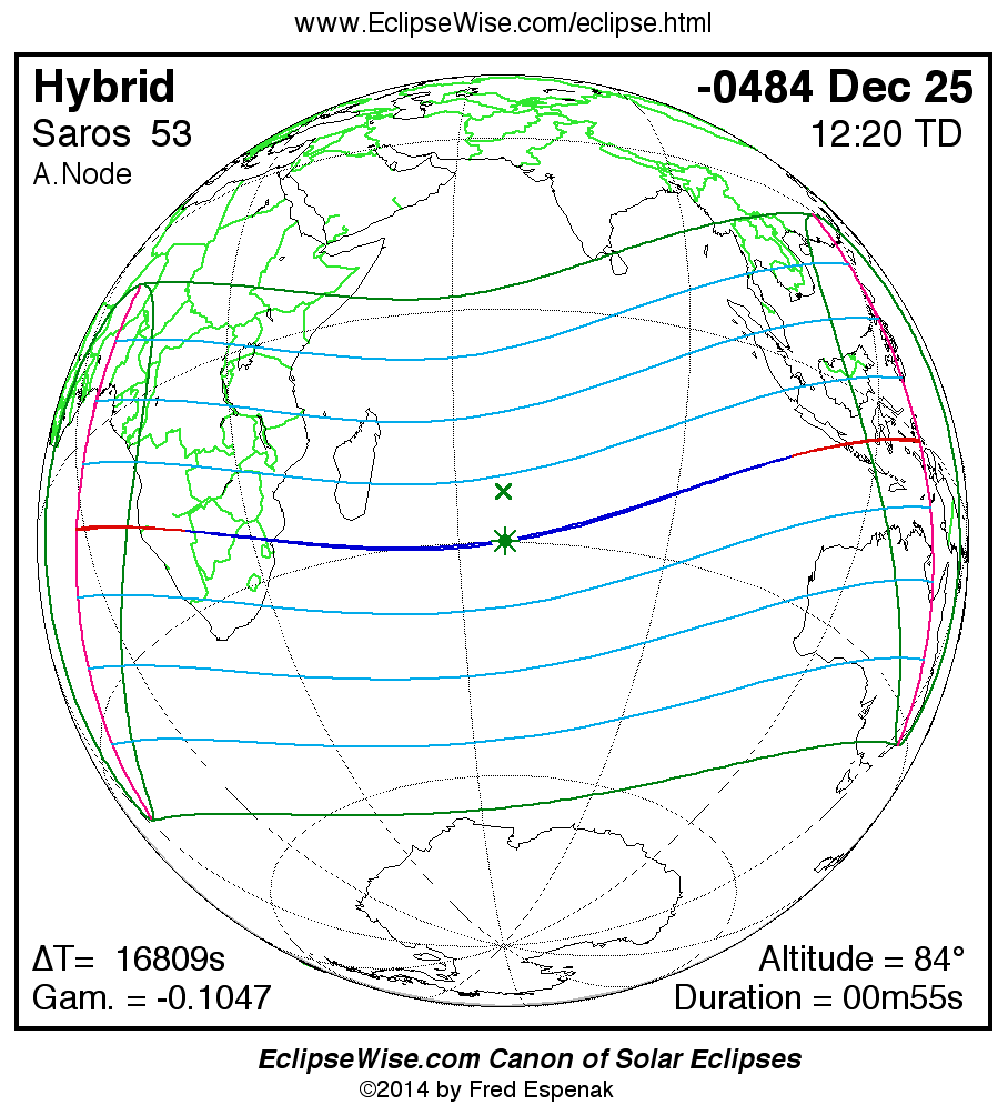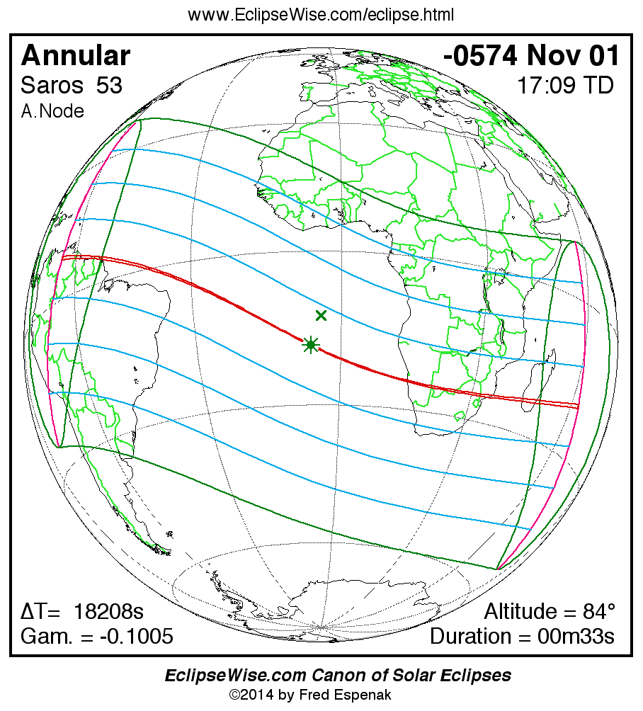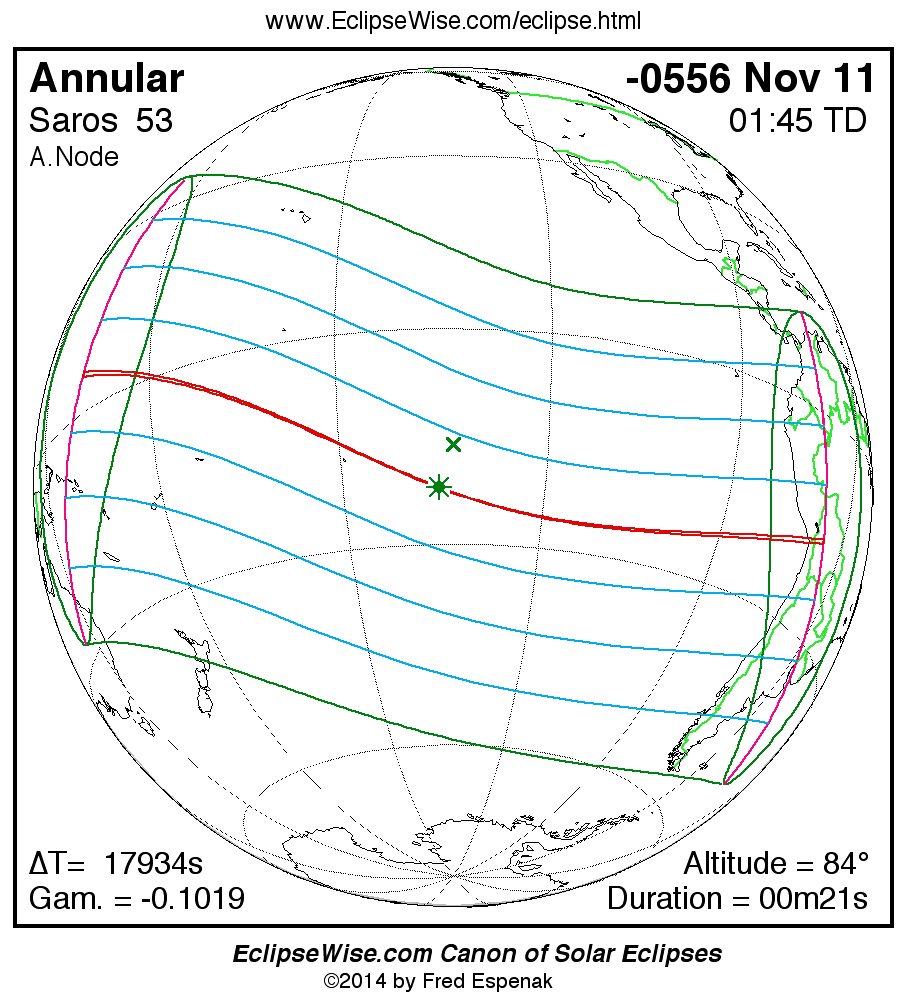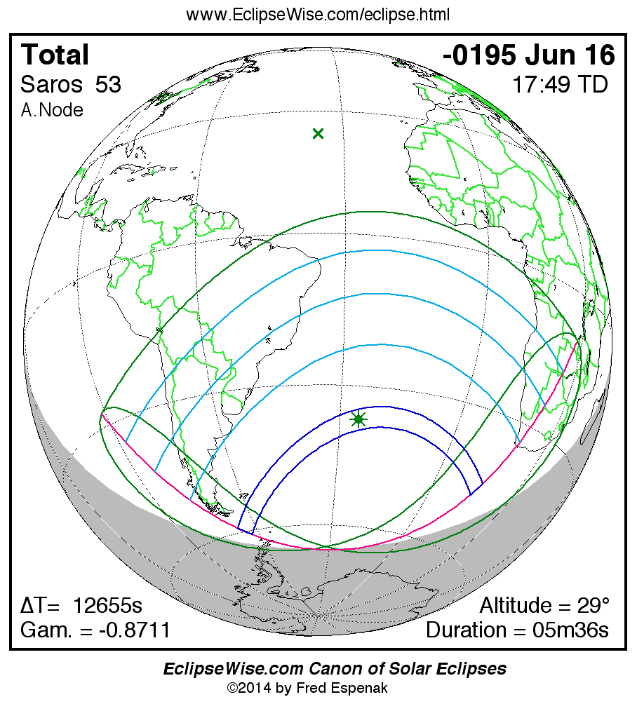 A panorama of all solar eclipses belonging to Saros 53 is presented here. Each map depicts the geographic region of visibility for a single eclipse. For central eclipses, the total or annular path is plotted in either blue (total) or red (annular). The date and time is given for the instant of Greatest Eclipse. Every map serves as a hyperlink to the EclipseWise Prime page for that eclipse where a larger map and complete details for the eclipse can be found. Visit the Key to Solar Eclipse Maps for a detailed explanation of these maps. Near the bottom of the page are a series of hyperlinks for more on solar eclipses.