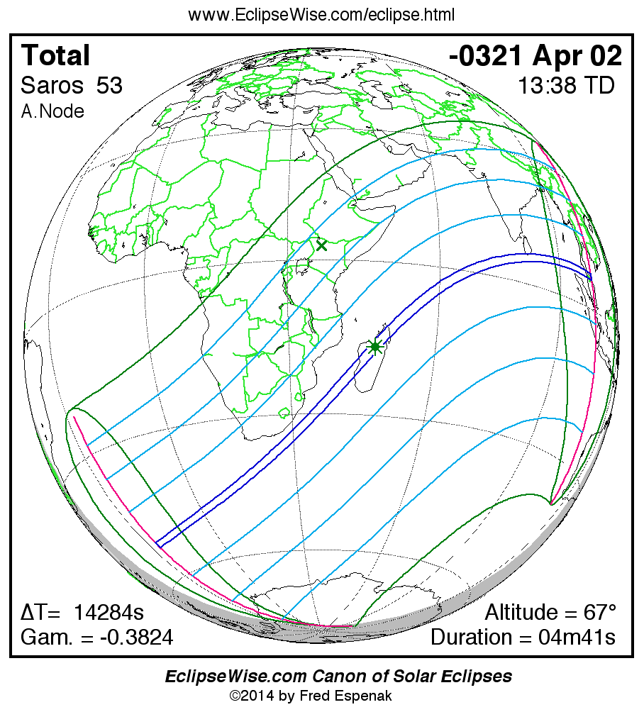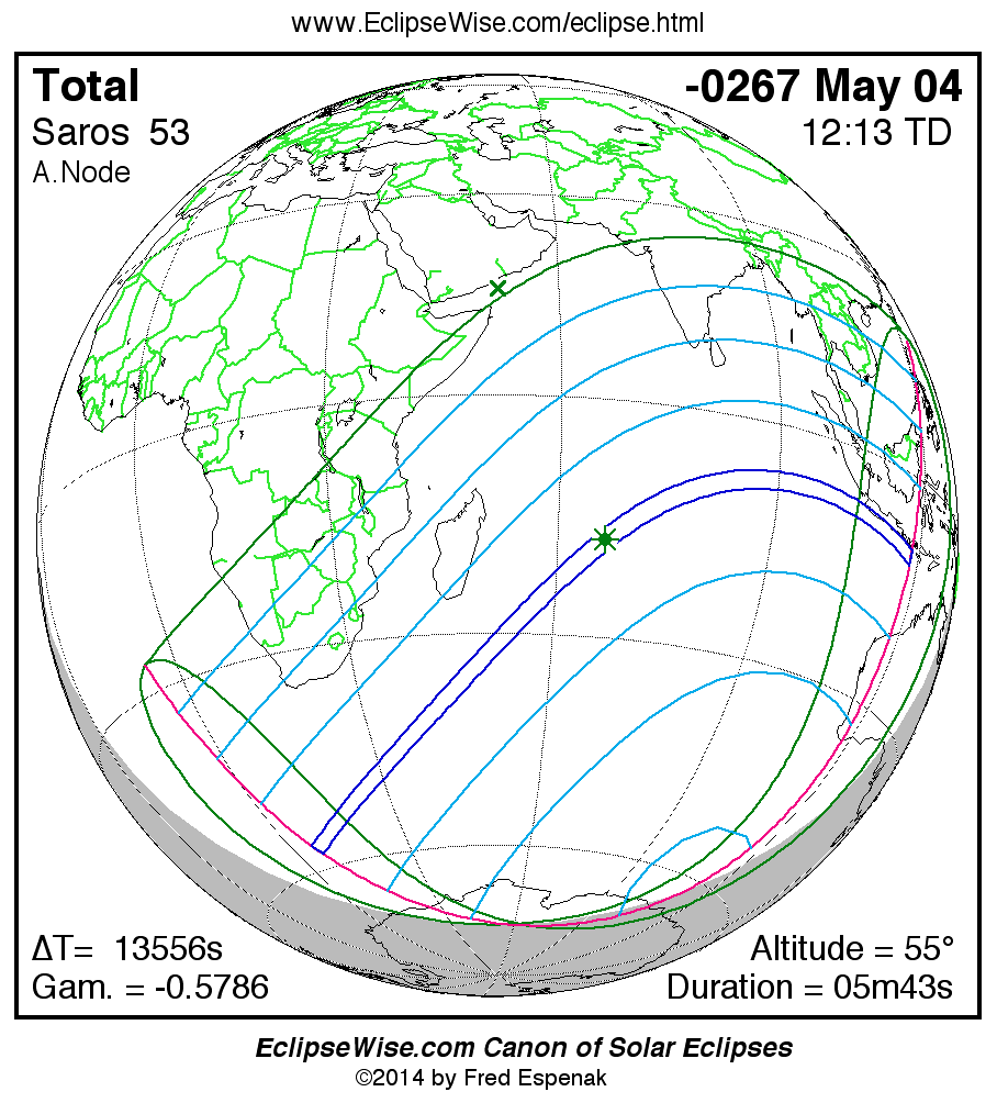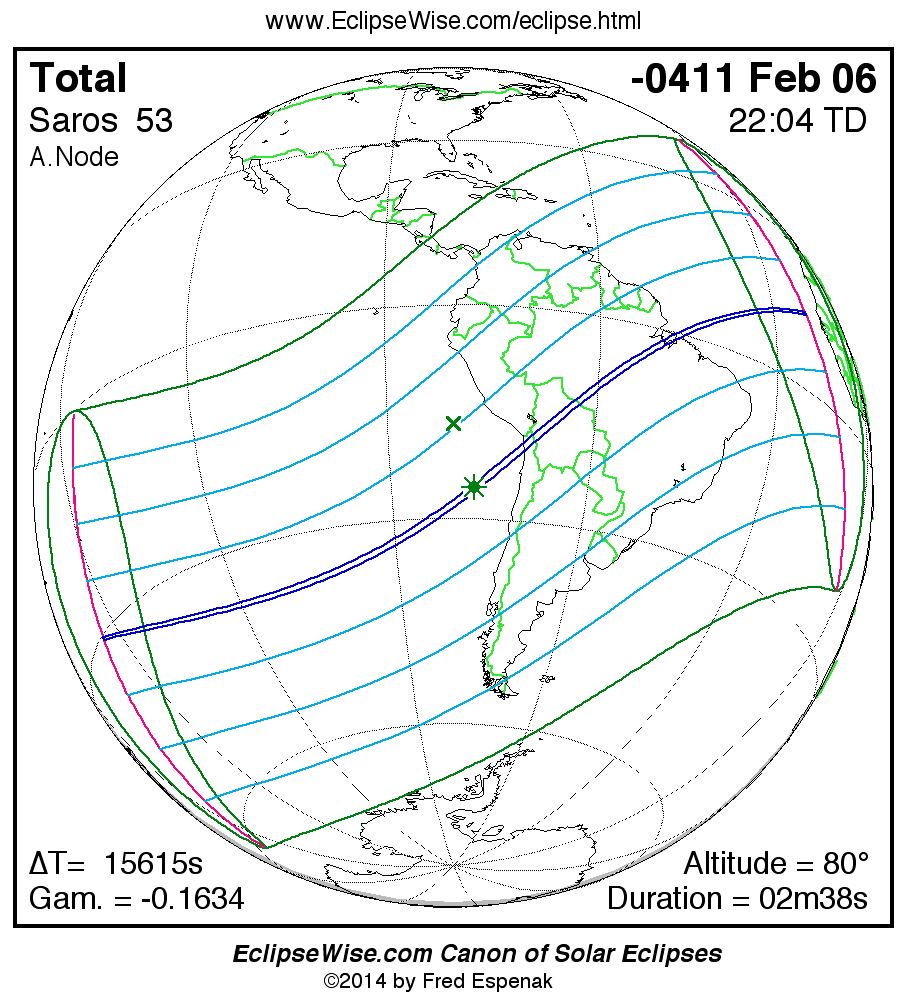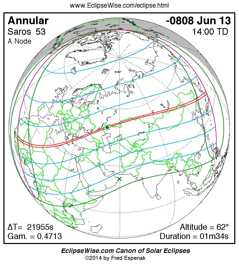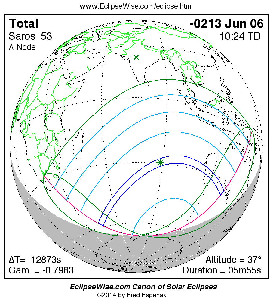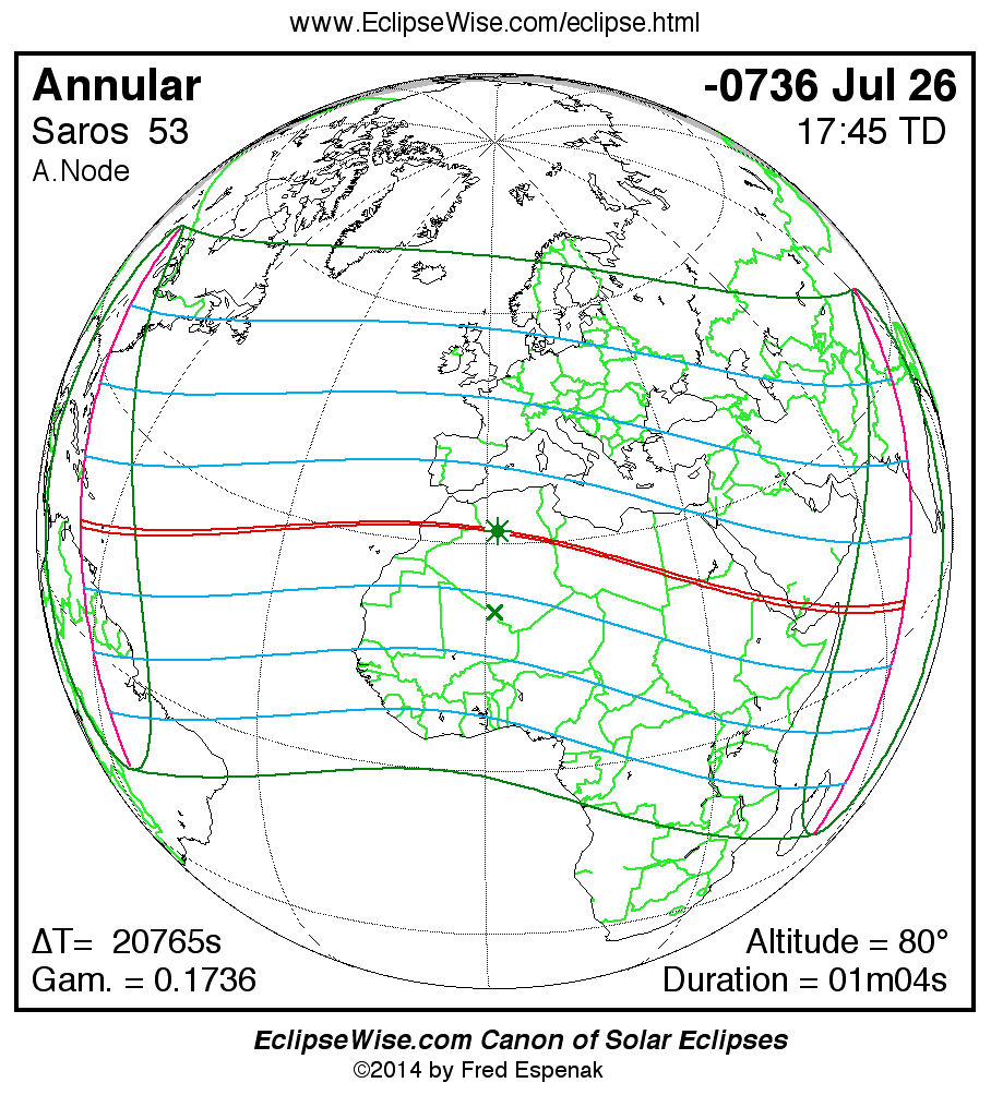 A panorama of all solar eclipses belonging to Saros 53 is presented here. Each map depicts the geographic region of visibility for a single eclipse. For central eclipses, the total or annular path is plotted in either blue (total) or red (annular). The date and time is given for the instant of Greatest Eclipse. Every map serves as a hyperlink to the EclipseWise Prime page for that eclipse where a larger map and complete details for the eclipse can be found. Visit the Key to Solar Eclipse Maps for a detailed explanation of these maps. Near the bottom of the page are a series of hyperlinks for more on solar eclipses.