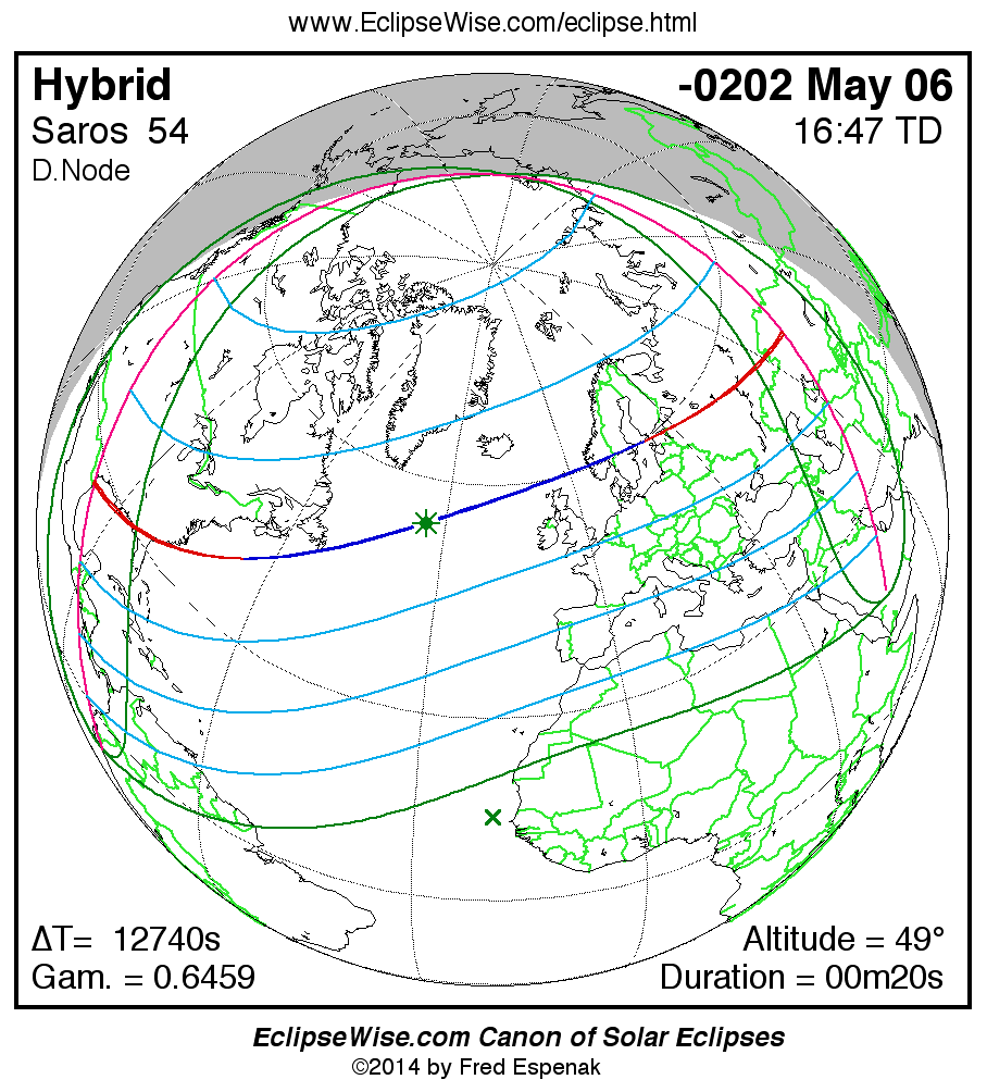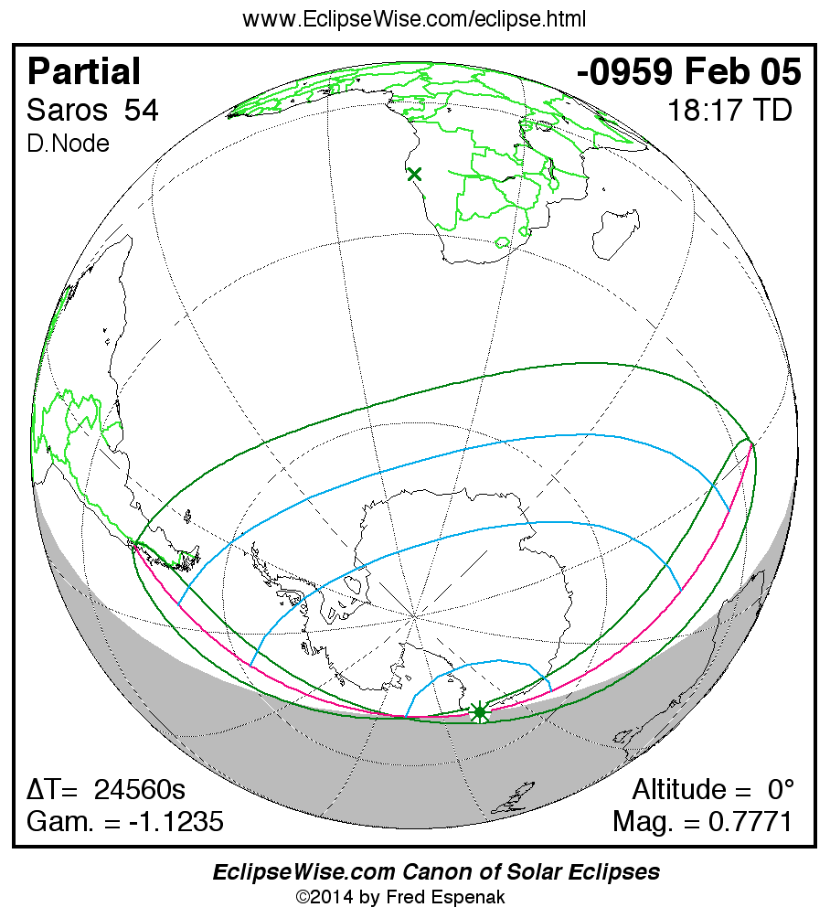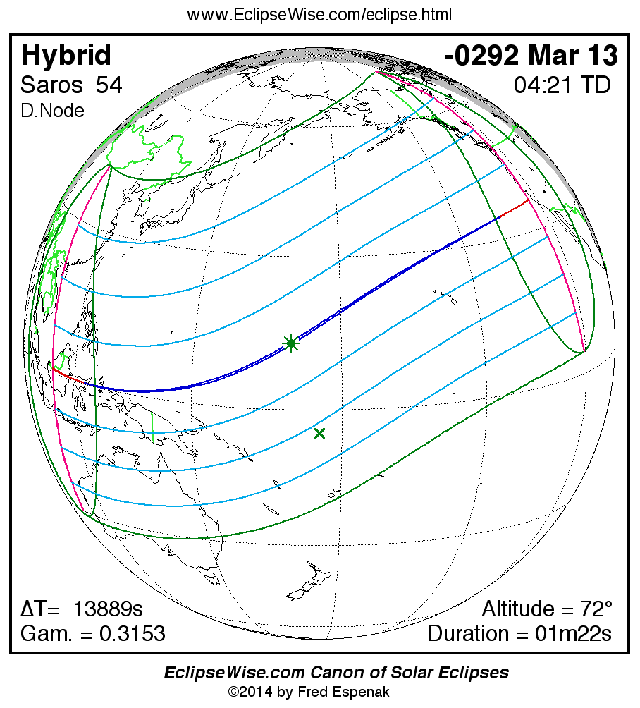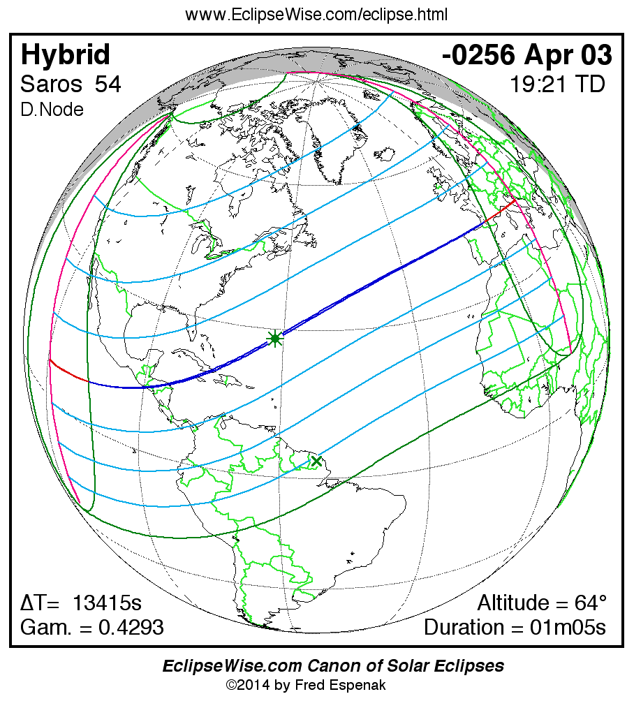 A panorama of all solar eclipses belonging to Saros 54 is presented here. Each map depicts the geographic region of visibility for a single eclipse. For central eclipses, the total or annular path is plotted in either blue (total) or red (annular). The date and time is given for the instant of Greatest Eclipse. Every map serves as a hyperlink to the EclipseWise Prime page for that eclipse where a larger map and complete details for the eclipse can be found. Visit the Key to Solar Eclipse Maps for a detailed explanation of these maps. Near the bottom of the page are a series of hyperlinks for more on solar eclipses.