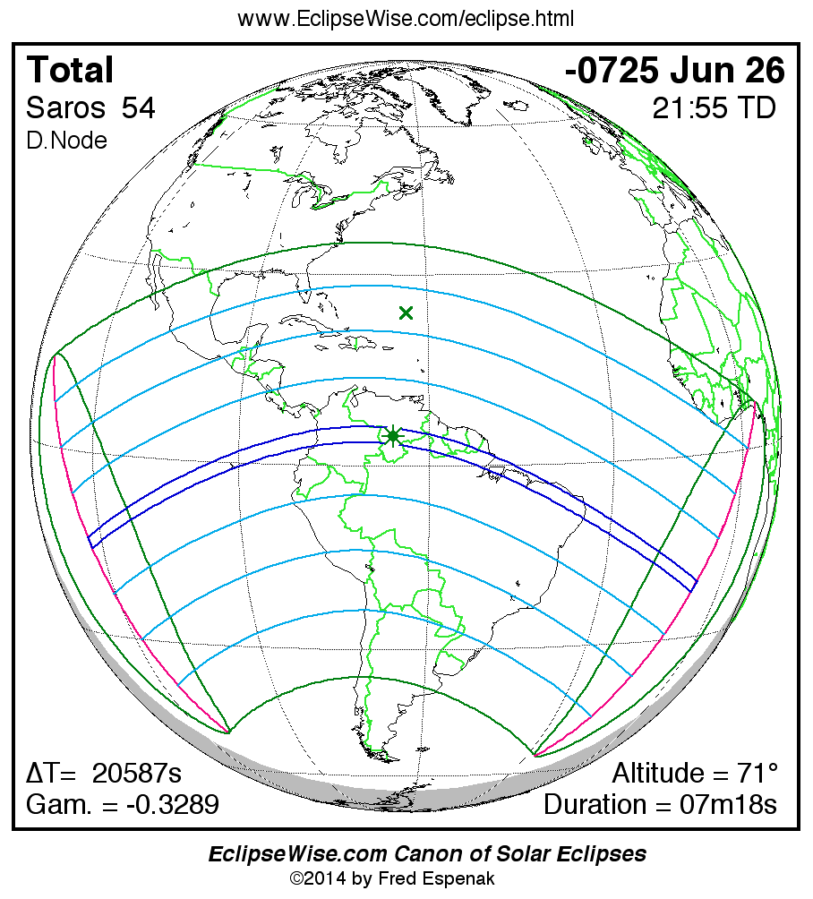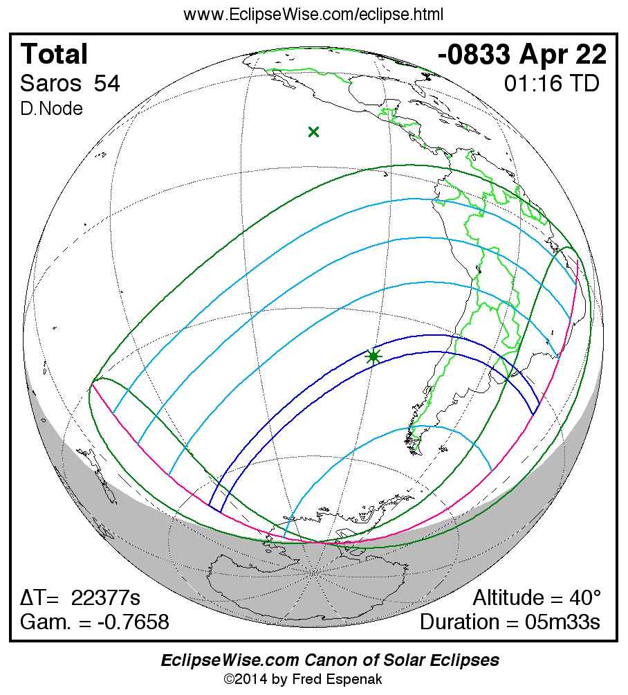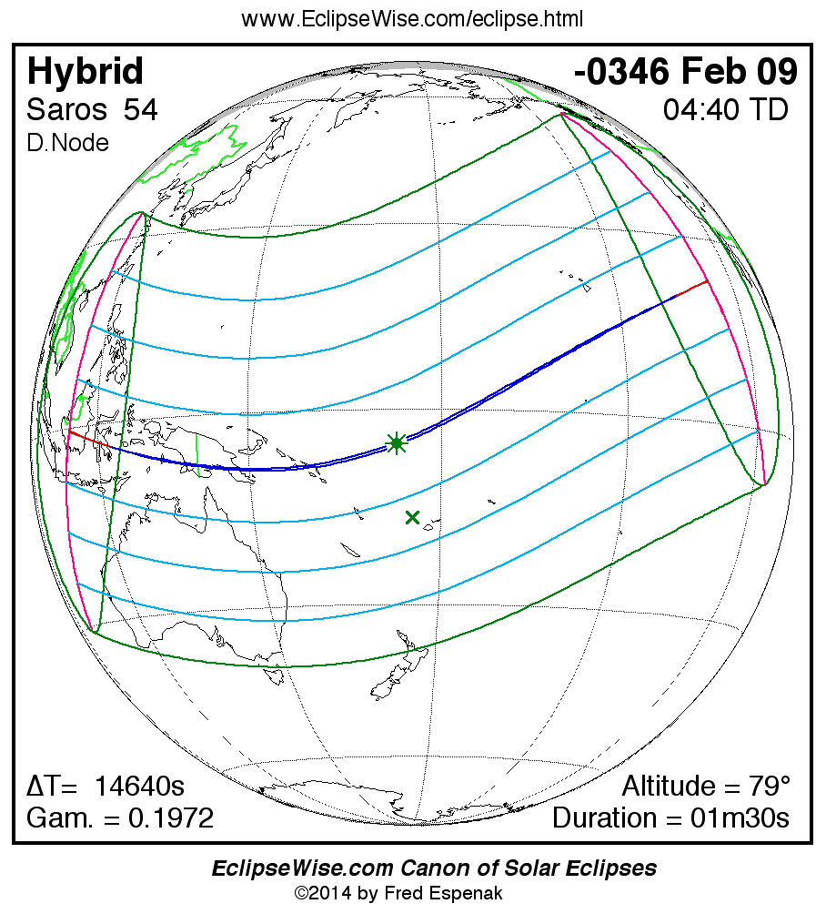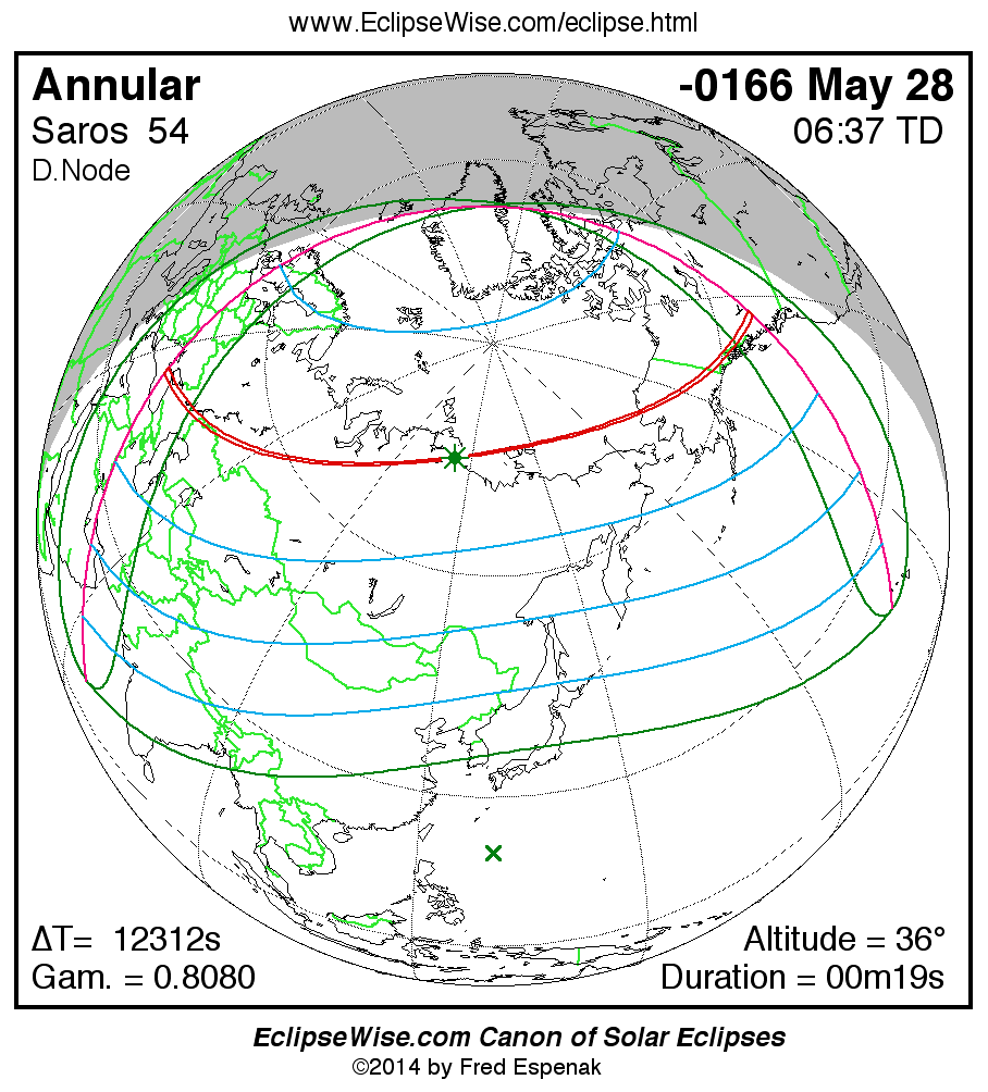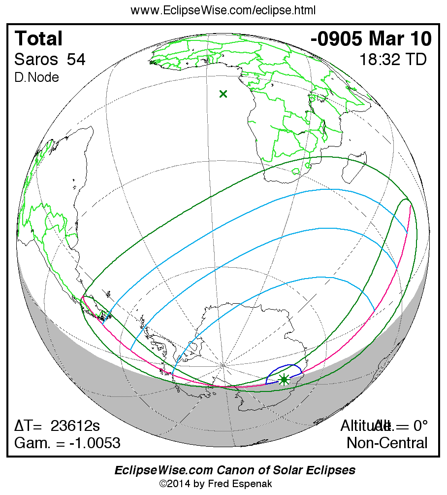 A panorama of all solar eclipses belonging to Saros 54 is presented here. Each map depicts the geographic region of visibility for a single eclipse. For central eclipses, the total or annular path is plotted in either blue (total) or red (annular). The date and time is given for the instant of Greatest Eclipse. Every map serves as a hyperlink to the EclipseWise Prime page for that eclipse where a larger map and complete details for the eclipse can be found. Visit the Key to Solar Eclipse Maps for a detailed explanation of these maps. Near the bottom of the page are a series of hyperlinks for more on solar eclipses.