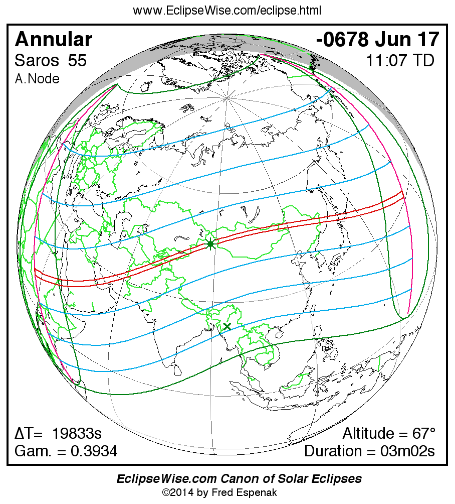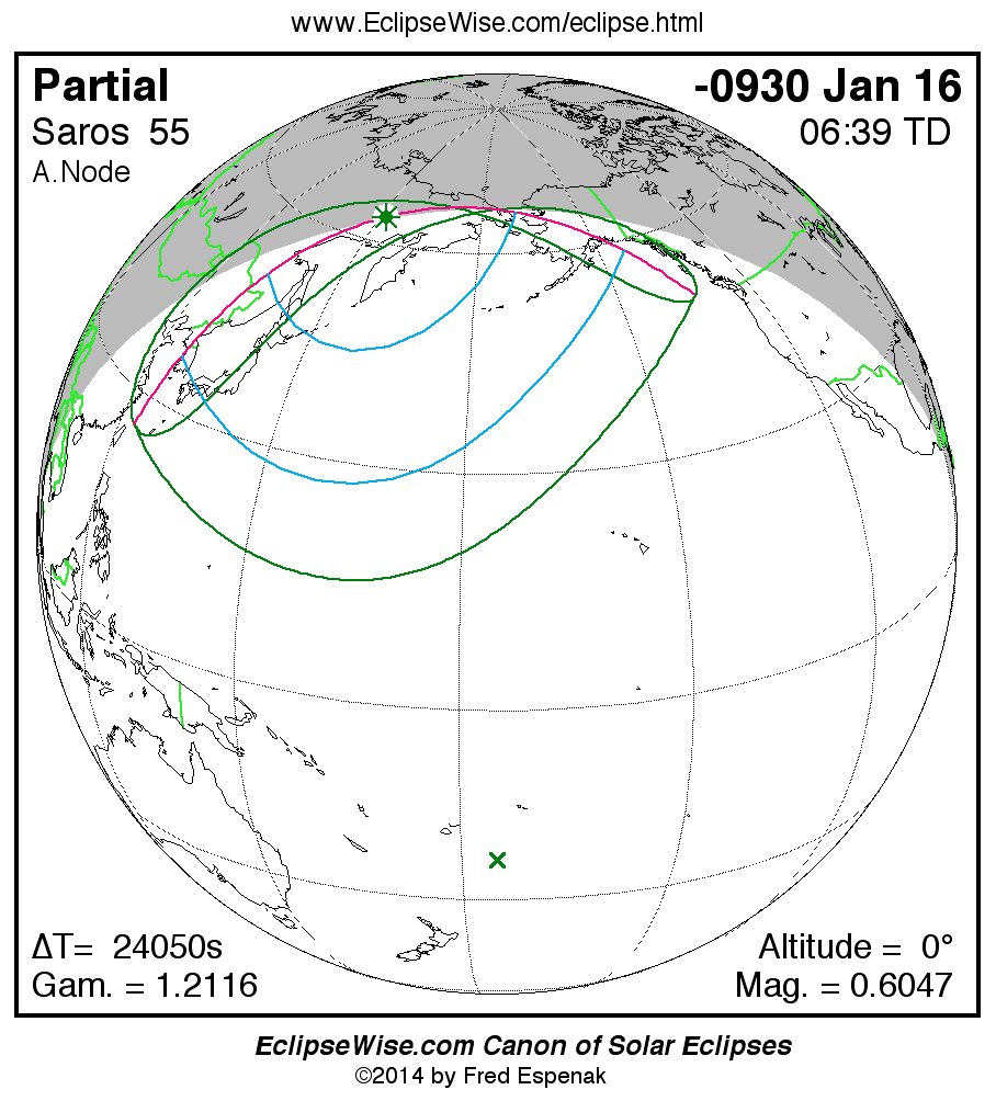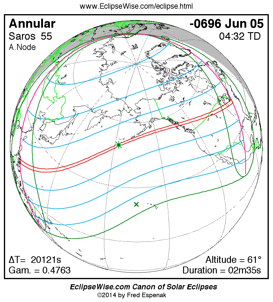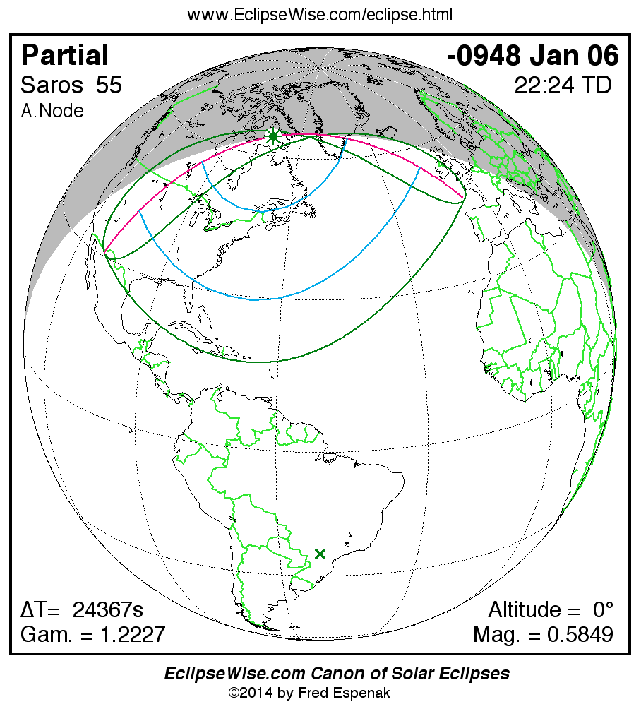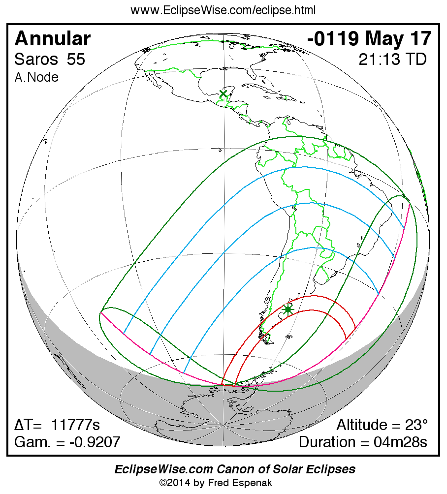 A panorama of all solar eclipses belonging to Saros 55 is presented here. Each map depicts the geographic region of visibility for a single eclipse. For central eclipses, the total or annular path is plotted in either blue (total) or red (annular). The date and time is given for the instant of Greatest Eclipse. Every map serves as a hyperlink to the EclipseWise Prime page for that eclipse where a larger map and complete details for the eclipse can be found. Visit the Key to Solar Eclipse Maps for a detailed explanation of these maps. Near the bottom of the page are a series of hyperlinks for more on solar eclipses.