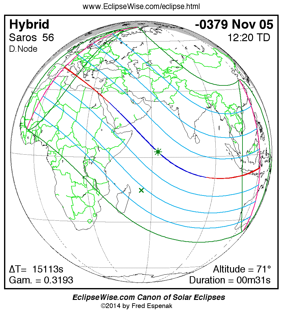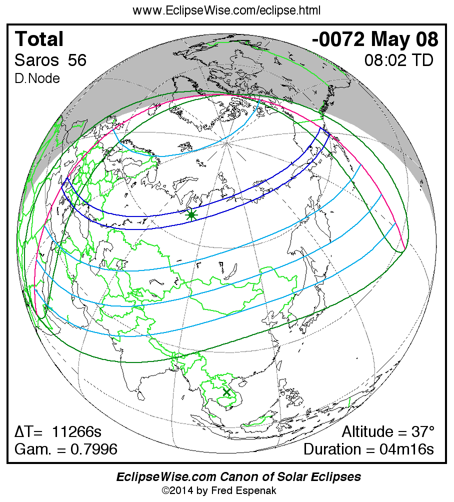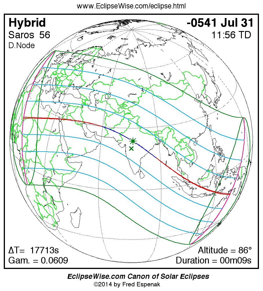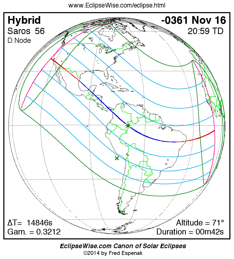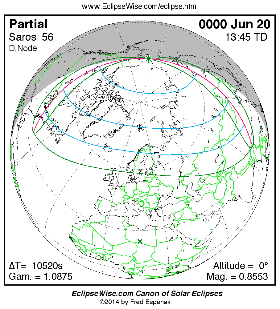 A panorama of all solar eclipses belonging to Saros 56 is presented here. Each map depicts the geographic region of visibility for a single eclipse. For central eclipses, the total or annular path is plotted in either blue (total) or red (annular). The date and time is given for the instant of Greatest Eclipse. Every map serves as a hyperlink to the EclipseWise Prime page for that eclipse where a larger map and complete details for the eclipse can be found. Visit the Key to Solar Eclipse Maps for a detailed explanation of these maps. Near the bottom of the page are a series of hyperlinks for more on solar eclipses.