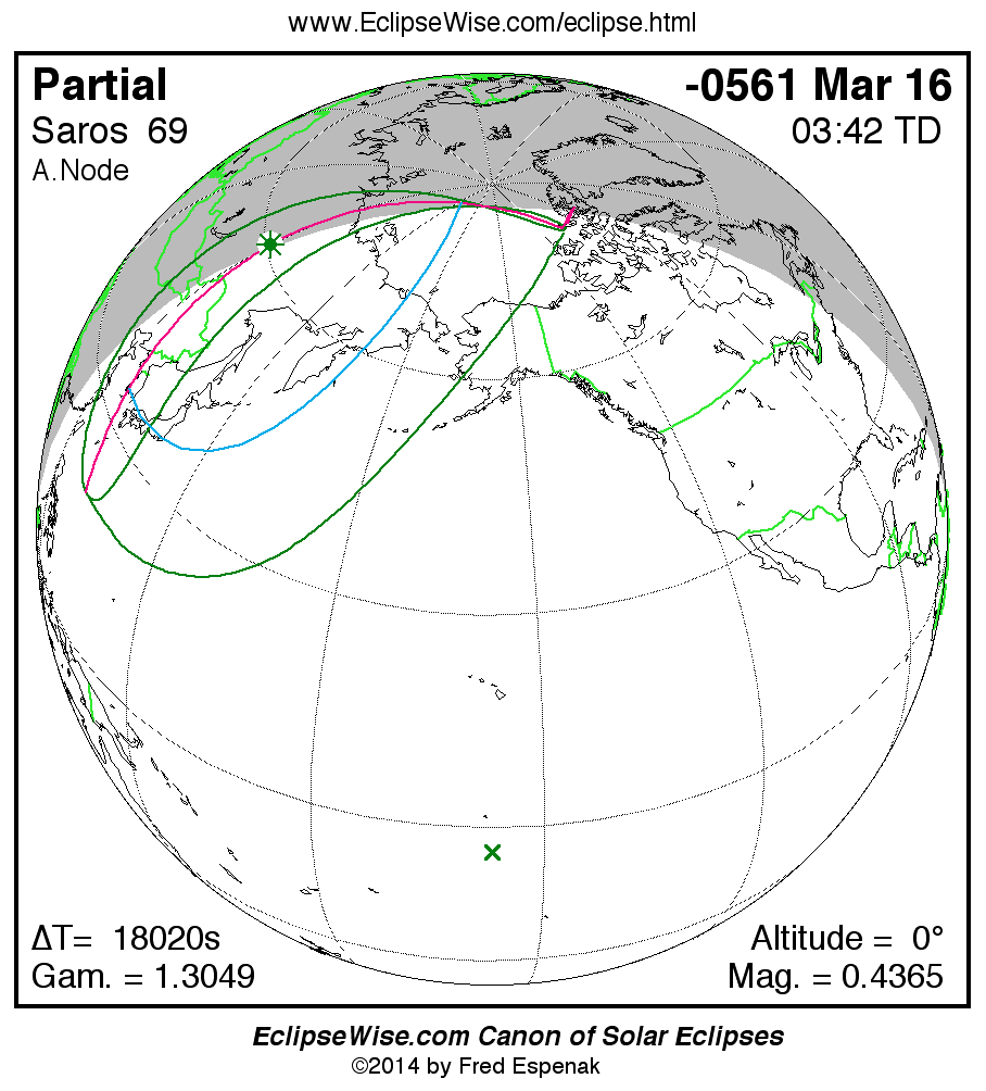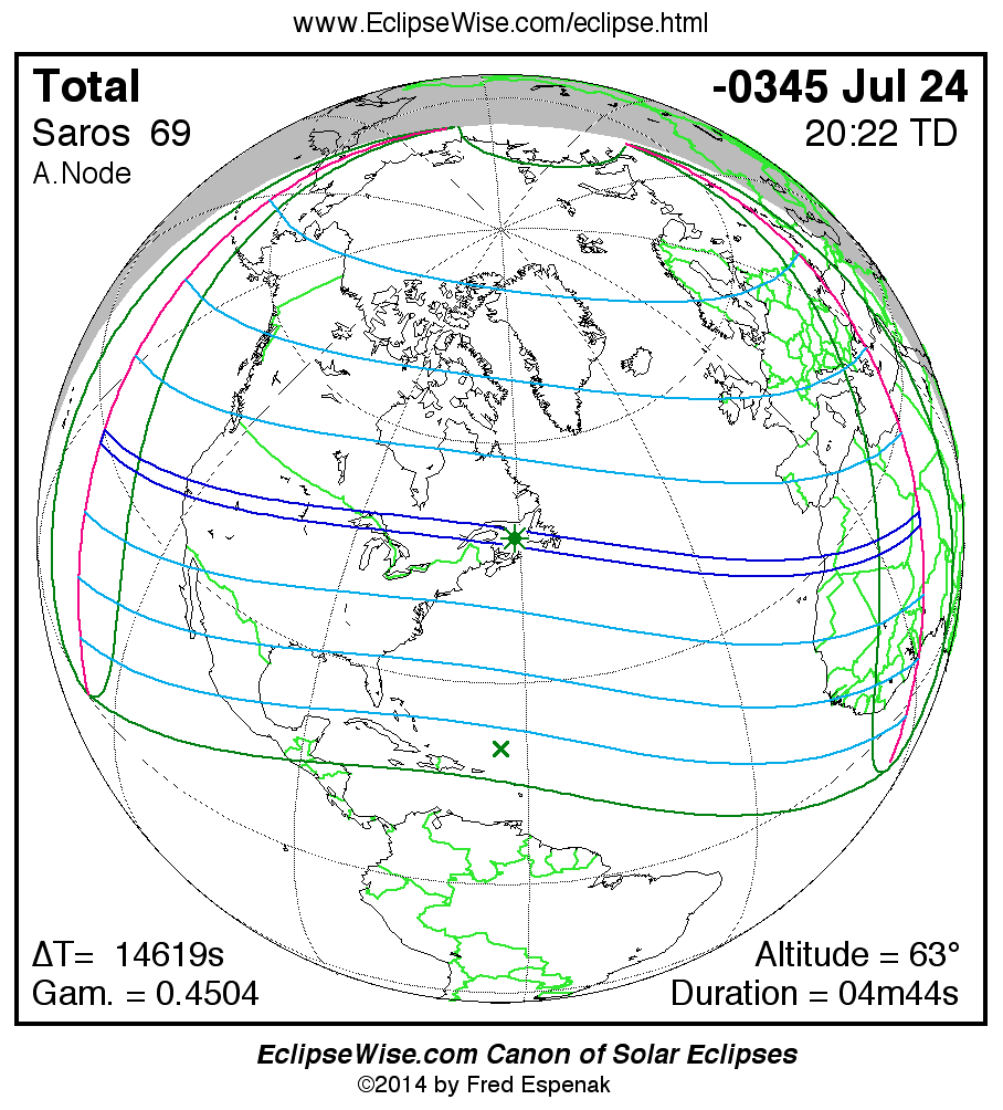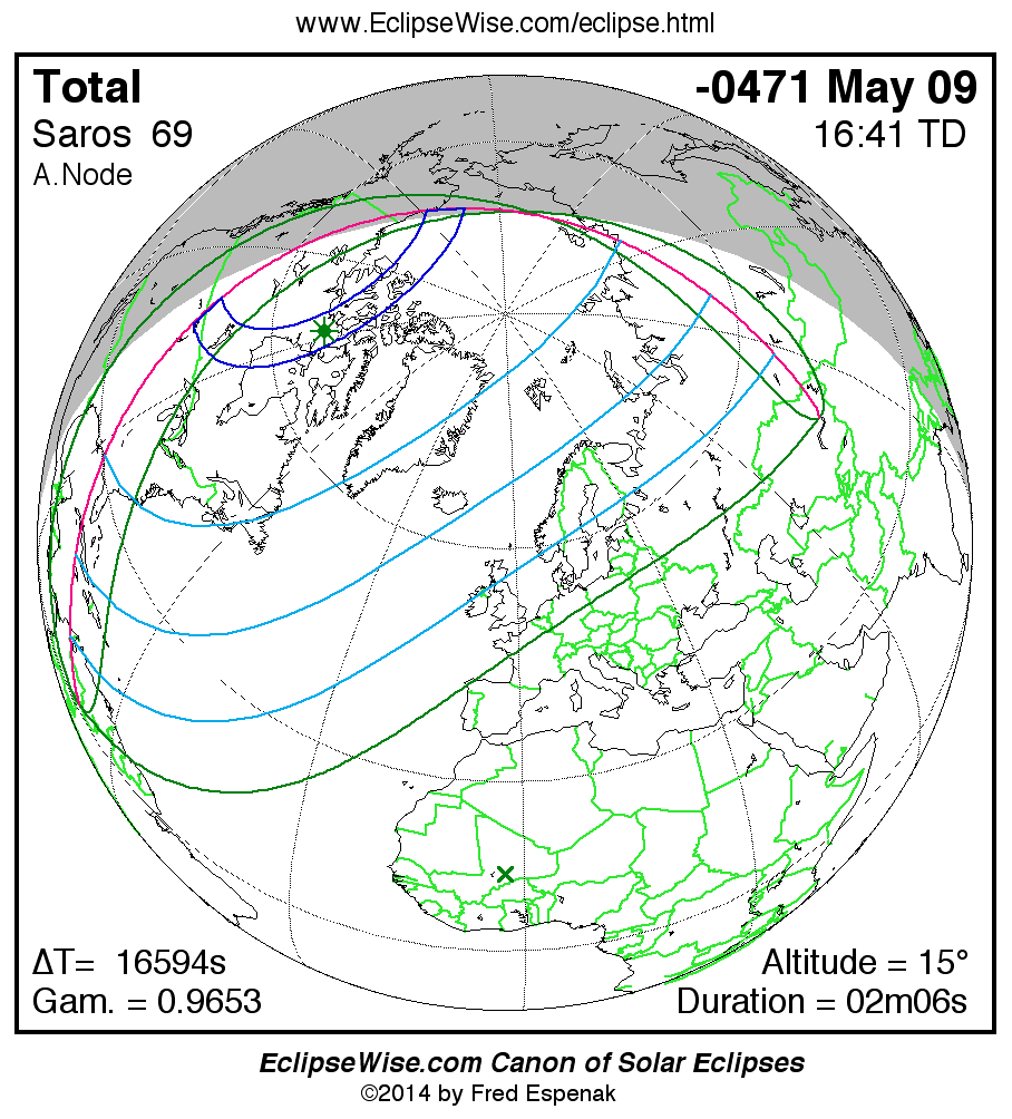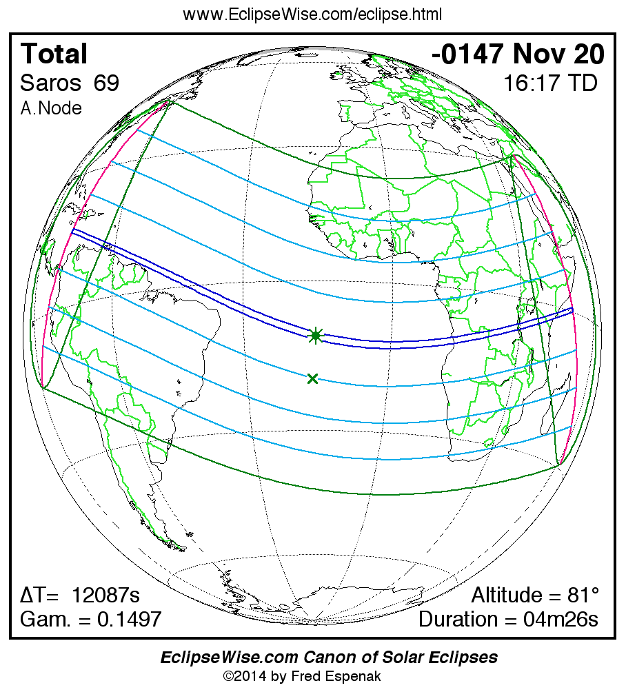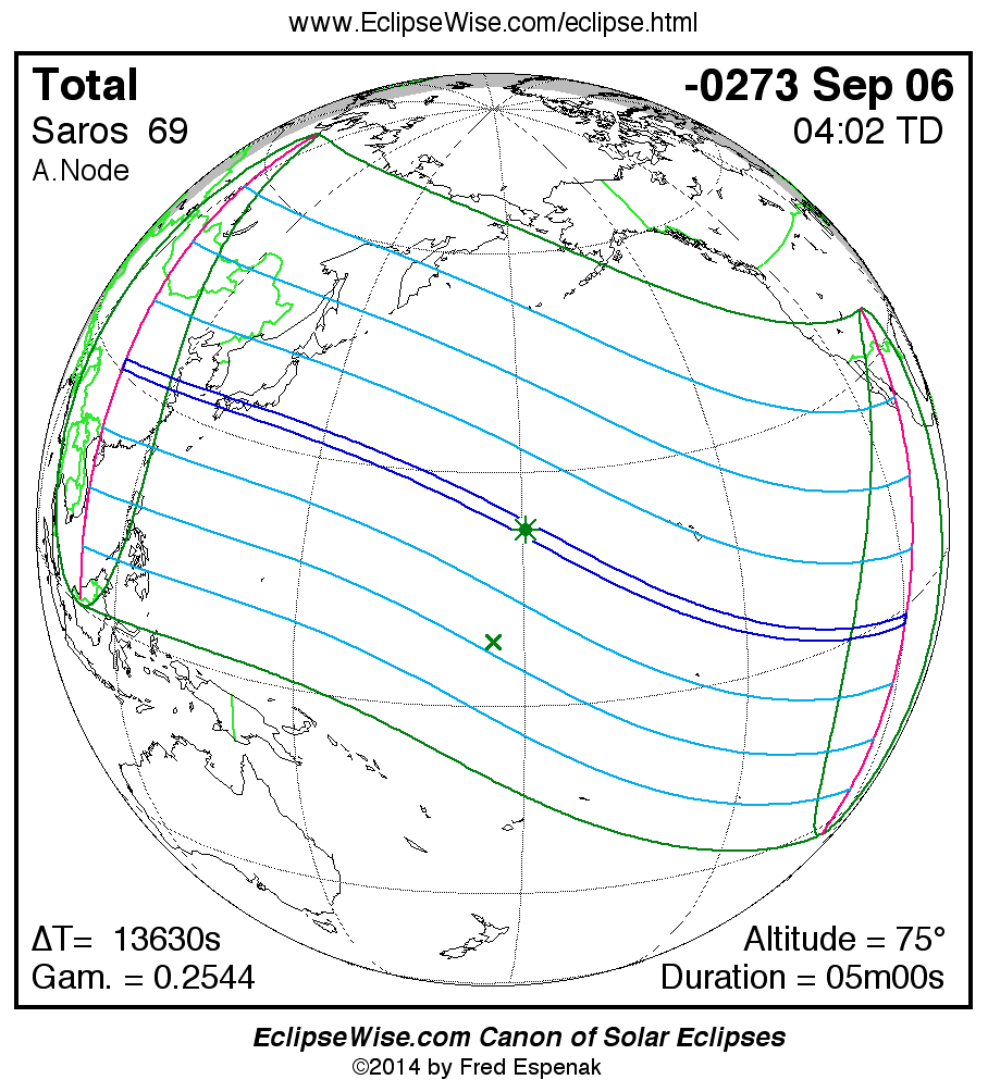 A panorama of all solar eclipses belonging to Saros 69 is presented here. Each map depicts the geographic region of visibility for a single eclipse. For central eclipses, the total or annular path is plotted in either blue (total) or red (annular). The date and time is given for the instant of Greatest Eclipse. Every map serves as a hyperlink to the EclipseWise Prime page for that eclipse where a larger map and complete details for the eclipse can be found. Visit the Key to Solar Eclipse Maps for a detailed explanation of these maps. Near the bottom of the page are a series of hyperlinks for more on solar eclipses.