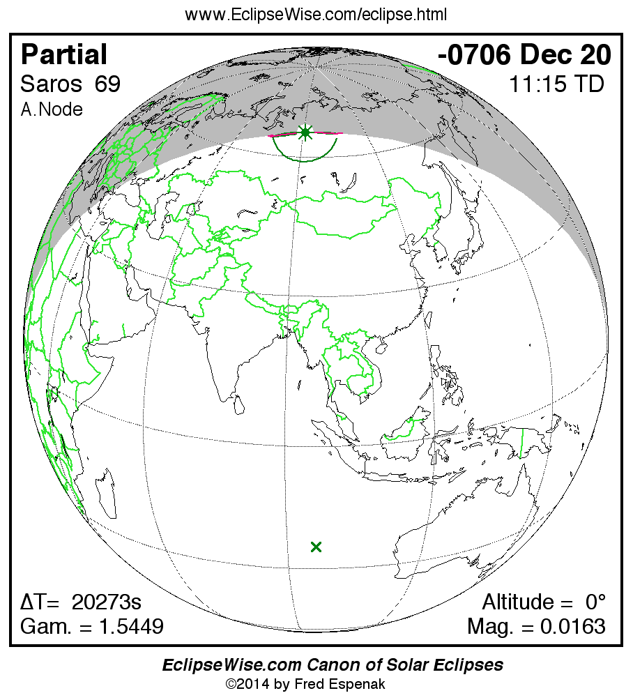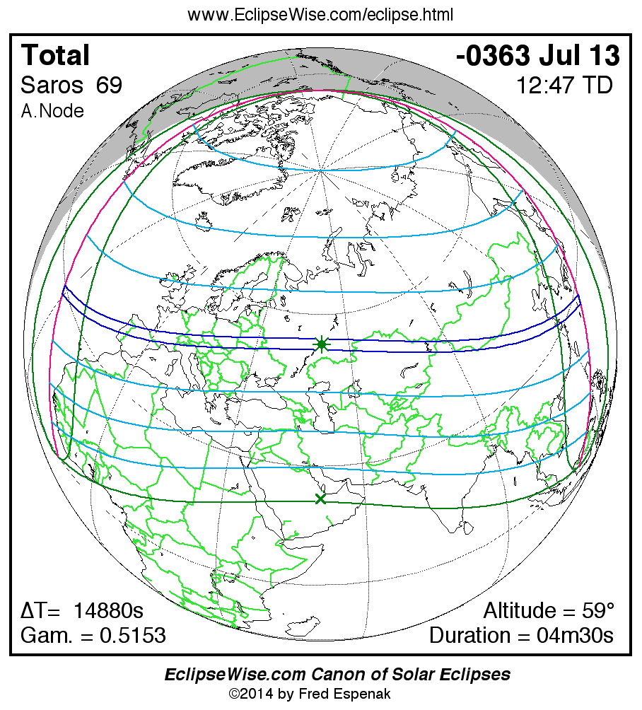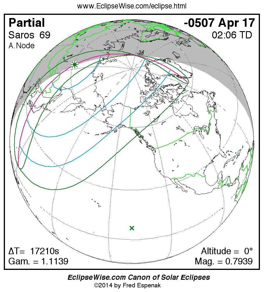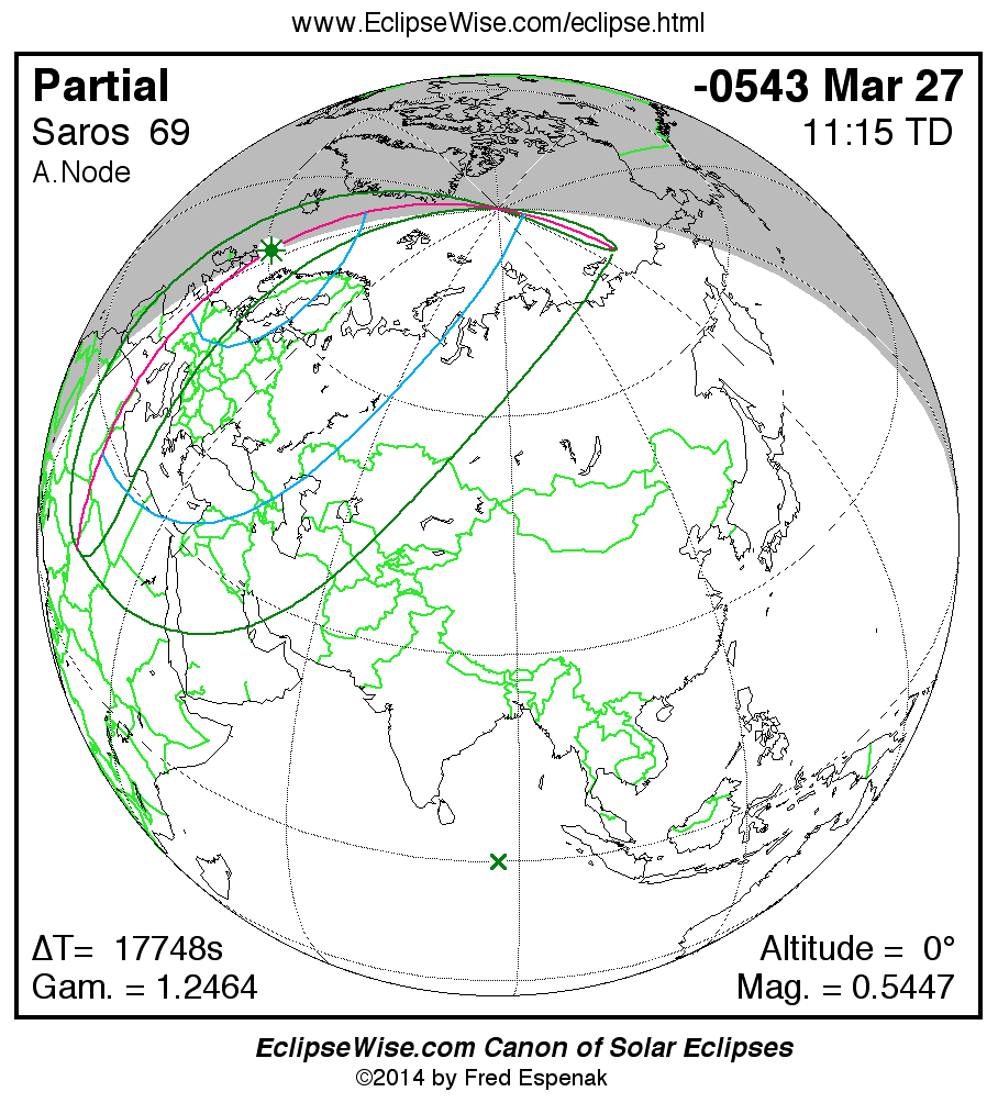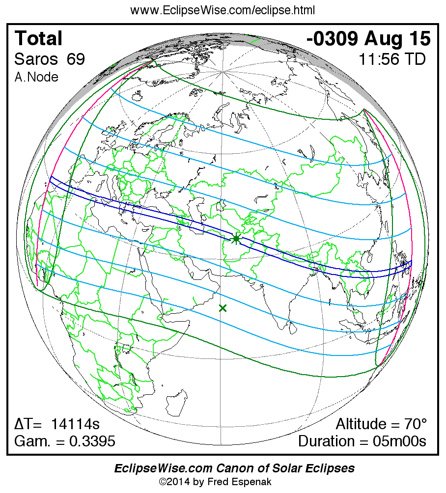 A panorama of all solar eclipses belonging to Saros 69 is presented here. Each map depicts the geographic region of visibility for a single eclipse. For central eclipses, the total or annular path is plotted in either blue (total) or red (annular). The date and time is given for the instant of Greatest Eclipse. Every map serves as a hyperlink to the EclipseWise Prime page for that eclipse where a larger map and complete details for the eclipse can be found. Visit the Key to Solar Eclipse Maps for a detailed explanation of these maps. Near the bottom of the page are a series of hyperlinks for more on solar eclipses.