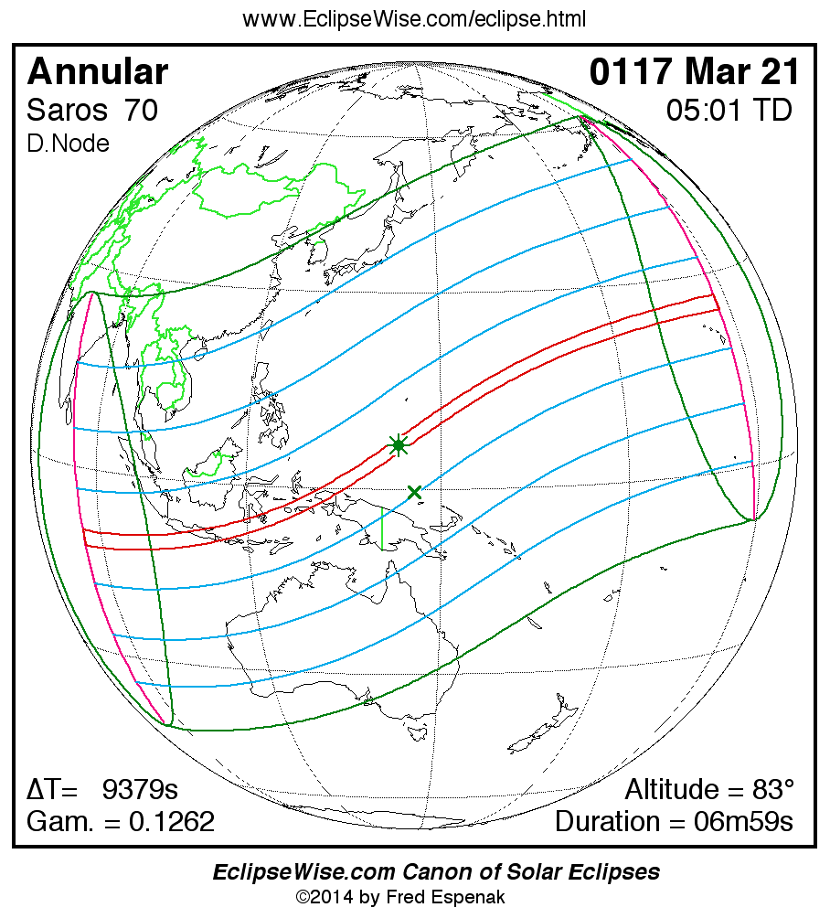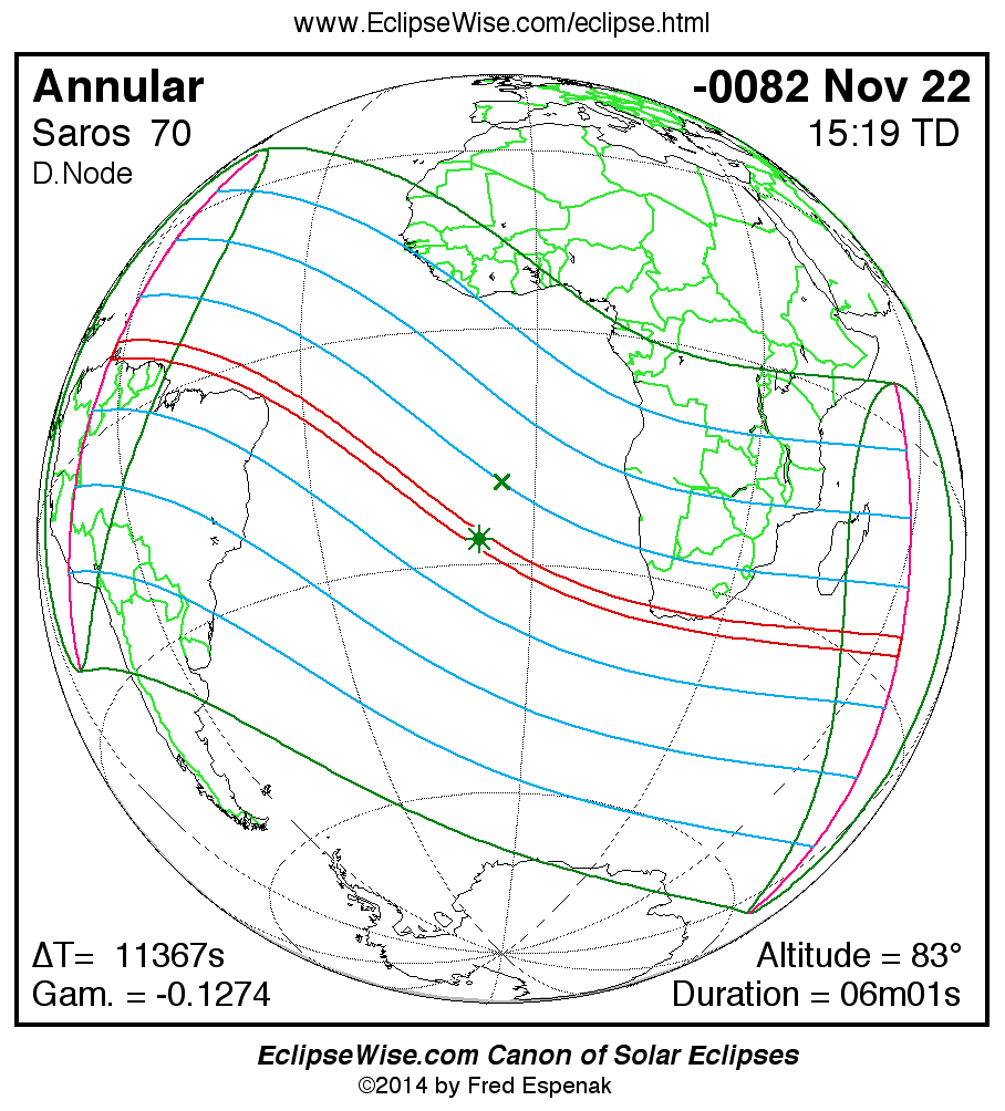 A panorama of all solar eclipses belonging to Saros 70 is presented here. Each map depicts the geographic region of visibility for a single eclipse. For central eclipses, the total or annular path is plotted in either blue (total) or red (annular). The date and time is given for the instant of Greatest Eclipse. Every map serves as a hyperlink to the EclipseWise Prime page for that eclipse where a larger map and complete details for the eclipse can be found. Visit the Key to Solar Eclipse Maps for a detailed explanation of these maps. Near the bottom of the page are a series of hyperlinks for more on solar eclipses.