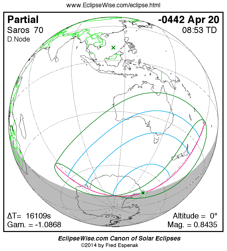 The Saros panorama below is arranged in horizontal rows of 3 eclipses. So one eclipse to the left or right is a difference of 1 Saros cycle, and one eclipse above or below is a difference of 1 exeligmos. By scanning a column of the table, it reveals how the geographic visibility of eclipses separated by an exeligmos slowly changes.