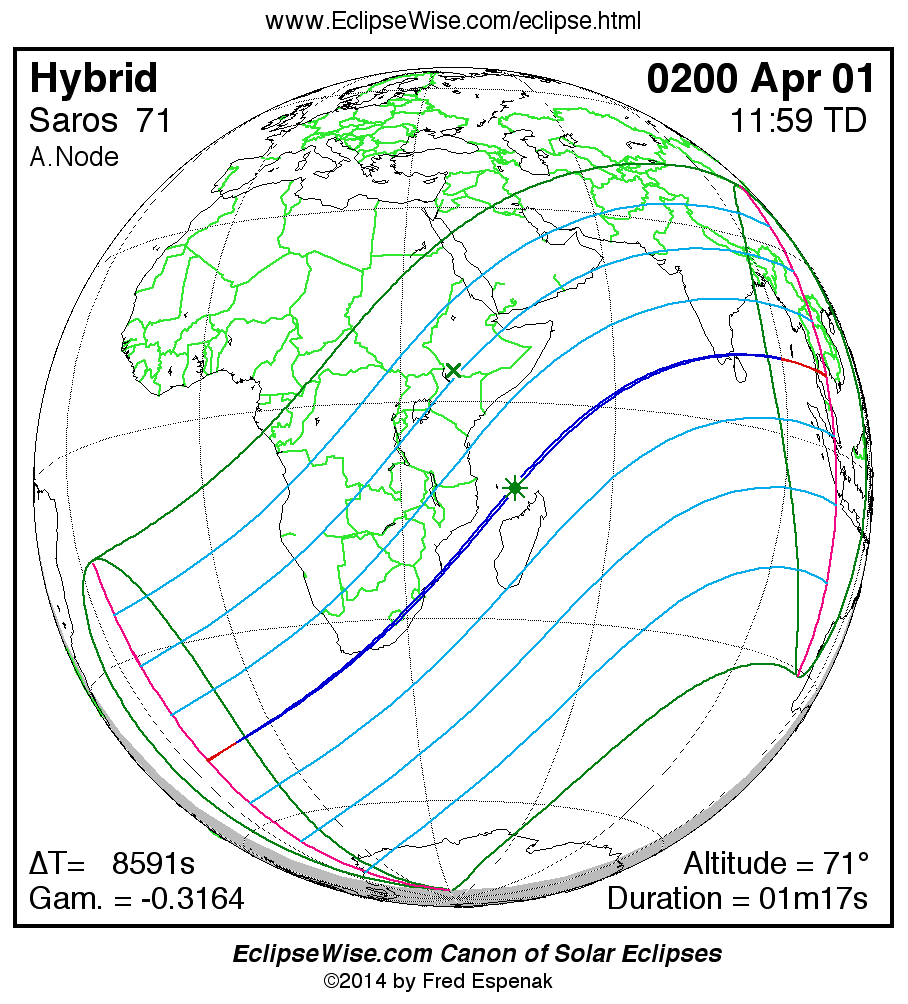 A panorama of all solar eclipses belonging to Saros 71 is presented here. Each map depicts the geographic region of visibility for a single eclipse. For central eclipses, the total or annular path is plotted in either blue (total) or red (annular). The date and time is given for the instant of Greatest Eclipse. Every map serves as a hyperlink to the EclipseWise Prime page for that eclipse where a larger map and complete details for the eclipse can be found. Visit the Key to Solar Eclipse Maps for a detailed explanation of these maps. Near the bottom of the page are a series of hyperlinks for more on solar eclipses.