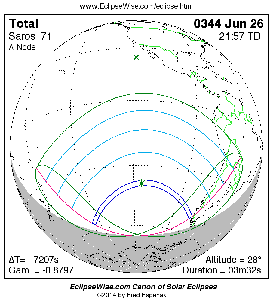 The Saros panorama below is arranged in horizontal rows of 3 eclipses. So one eclipse to the left or right is a difference of 1 Saros cycle, and one eclipse above or below is a difference of 1 exeligmos. By scanning a column of the table, it reveals how the geographic visibility of eclipses separated by an exeligmos slowly changes.