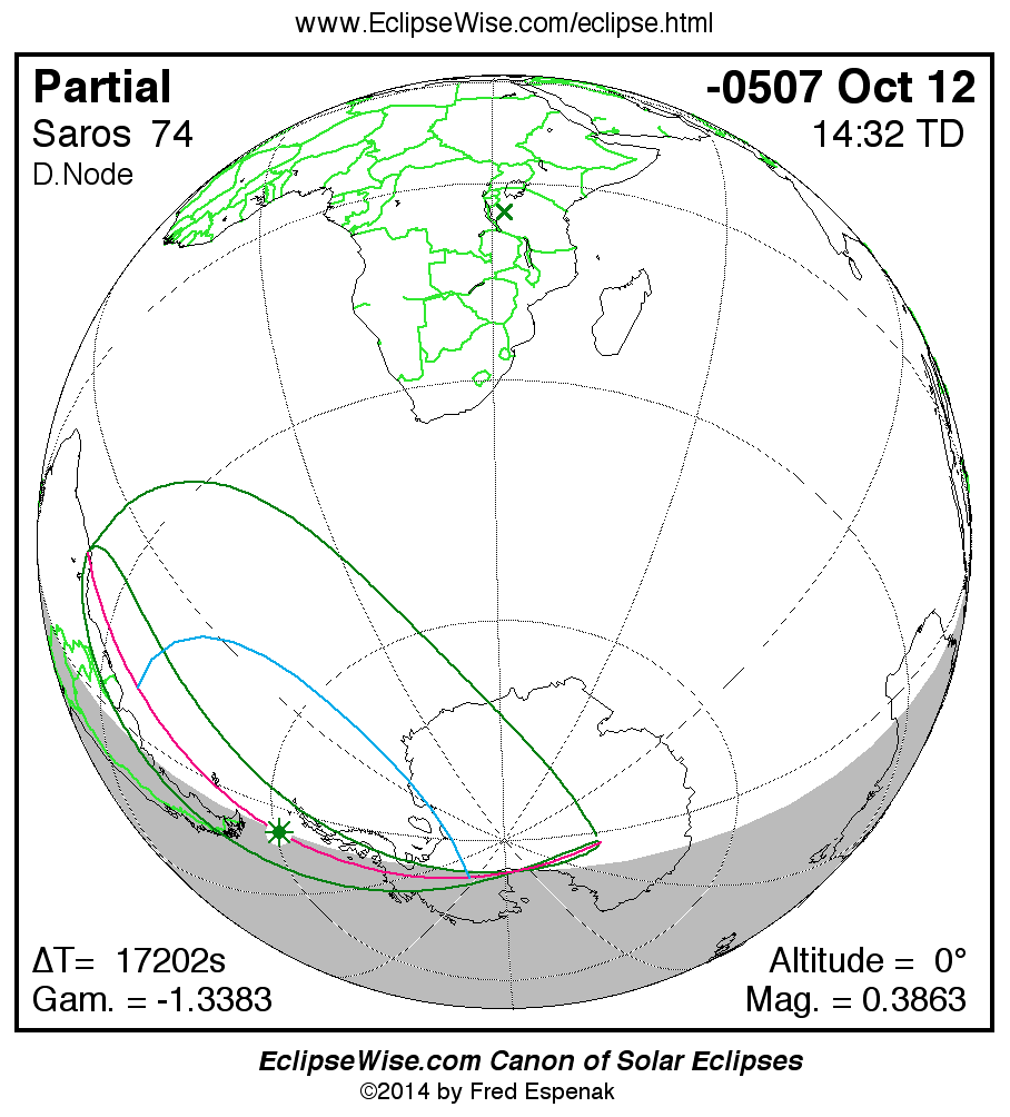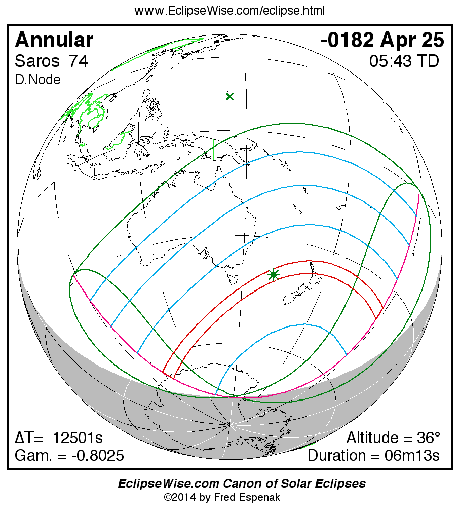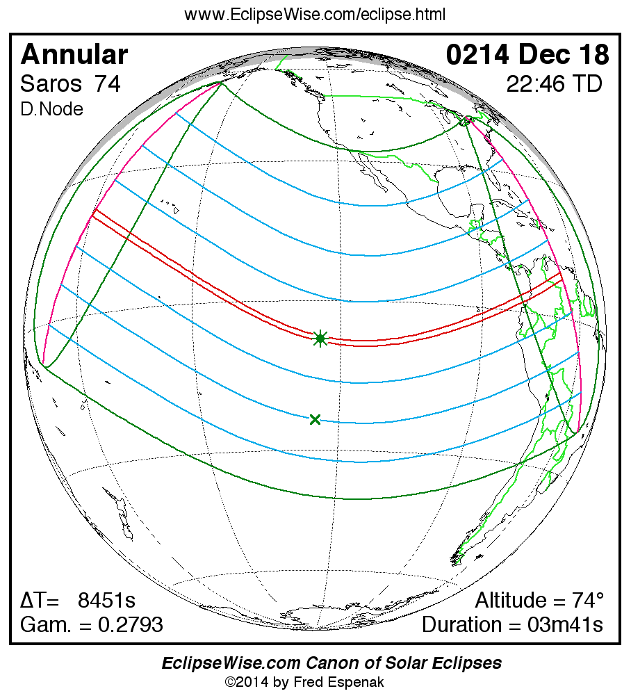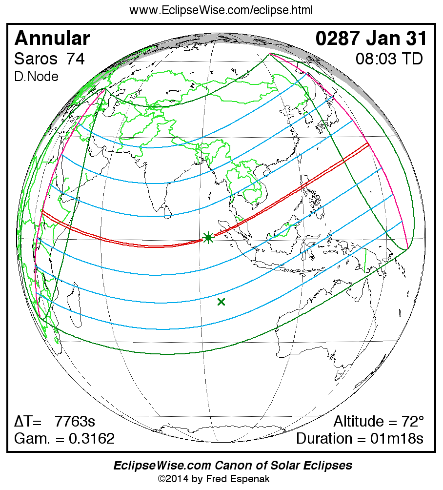 A panorama of all solar eclipses belonging to Saros 74 is presented here. Each map depicts the geographic region of visibility for a single eclipse. For central eclipses, the total or annular path is plotted in either blue (total) or red (annular). The date and time is given for the instant of Greatest Eclipse. Every map serves as a hyperlink to the EclipseWise Prime page for that eclipse where a larger map and complete details for the eclipse can be found. Visit the Key to Solar Eclipse Maps for a detailed explanation of these maps. Near the bottom of the page are a series of hyperlinks for more on solar eclipses.