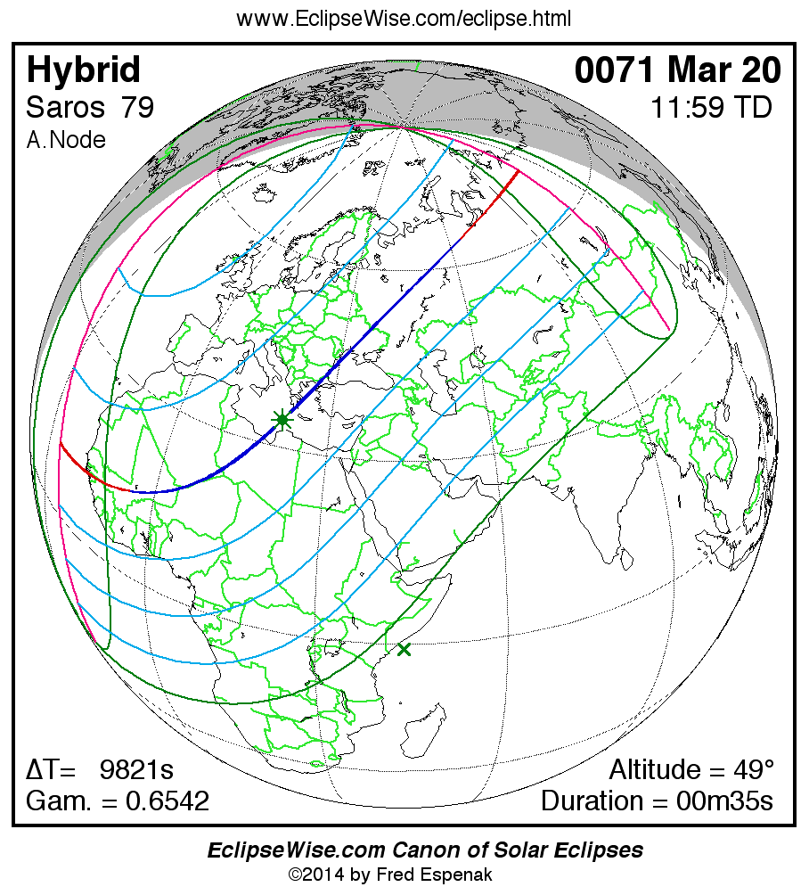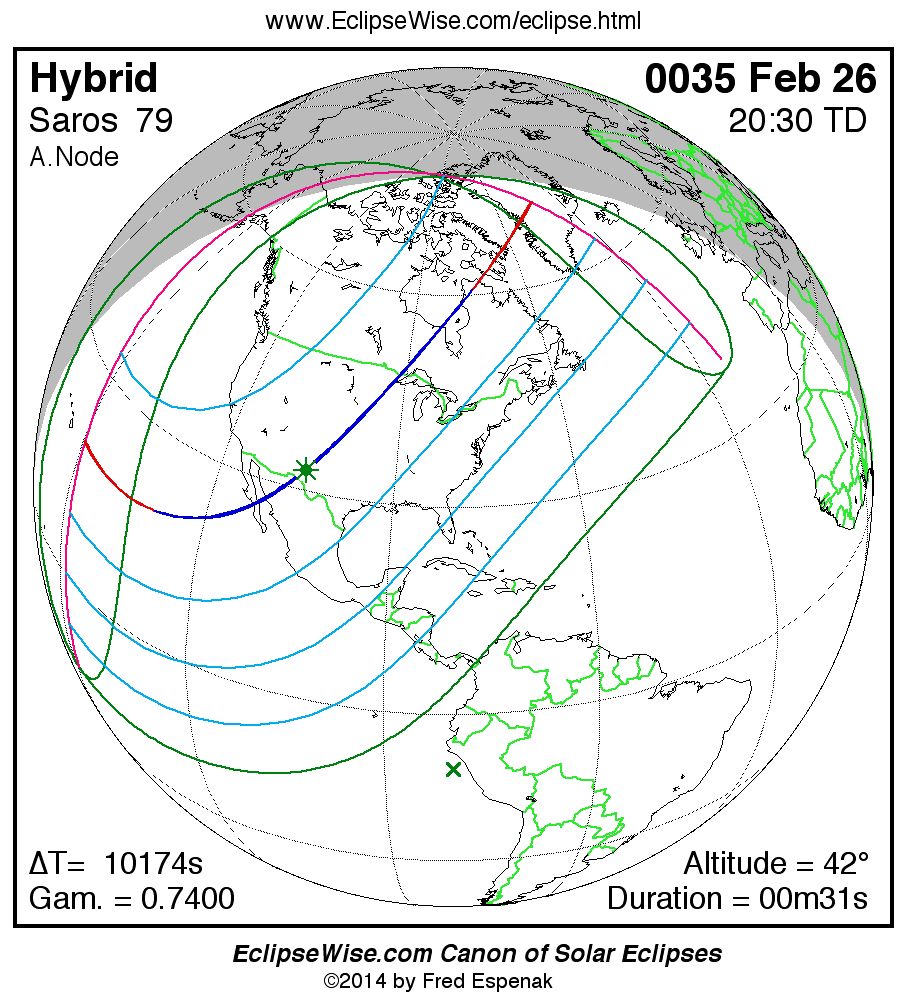 A panorama of all solar eclipses belonging to Saros 79 is presented here. Each map depicts the geographic region of visibility for a single eclipse. For central eclipses, the total or annular path is plotted in either blue (total) or red (annular). The date and time is given for the instant of Greatest Eclipse. Every map serves as a hyperlink to the EclipseWise Prime page for that eclipse where a larger map and complete details for the eclipse can be found. Visit the Key to Solar Eclipse Maps for a detailed explanation of these maps. Near the bottom of the page are a series of hyperlinks for more on solar eclipses.
