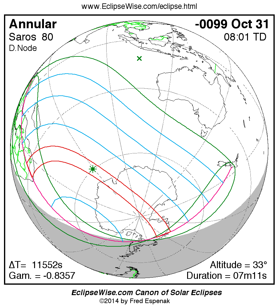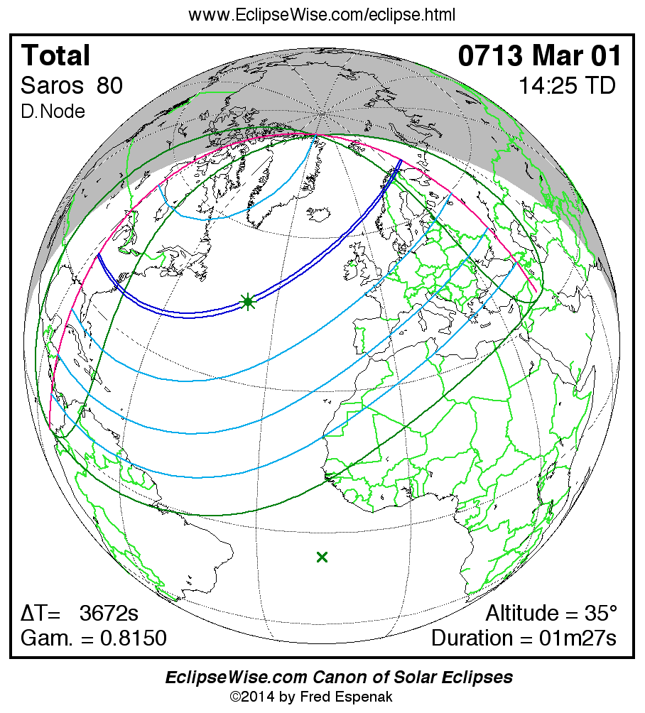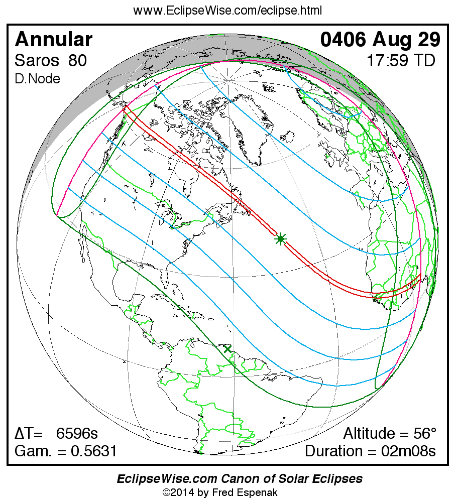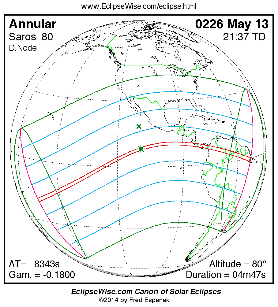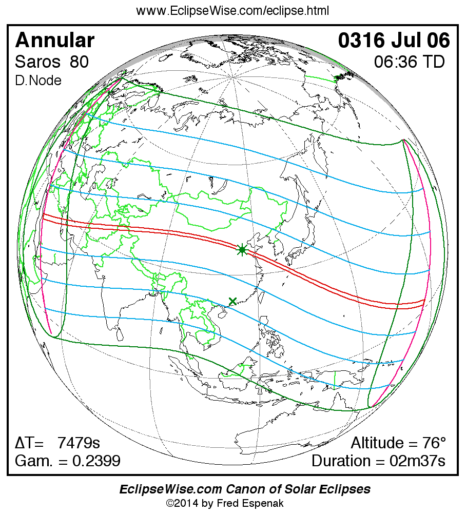 A panorama of all solar eclipses belonging to Saros 80 is presented here. Each map depicts the geographic region of visibility for a single eclipse. For central eclipses, the total or annular path is plotted in either blue (total) or red (annular). The date and time is given for the instant of Greatest Eclipse. Every map serves as a hyperlink to the EclipseWise Prime page for that eclipse where a larger map and complete details for the eclipse can be found. Visit the Key to Solar Eclipse Maps for a detailed explanation of these maps. Near the bottom of the page are a series of hyperlinks for more on solar eclipses.