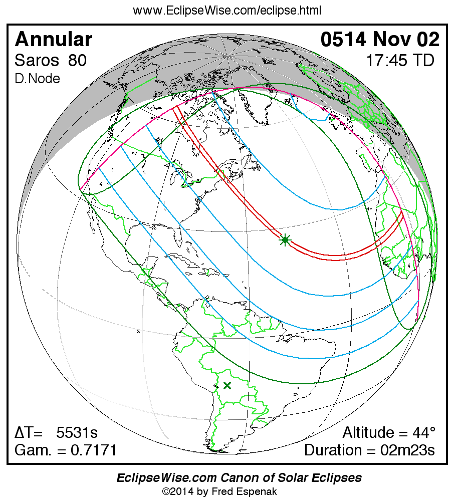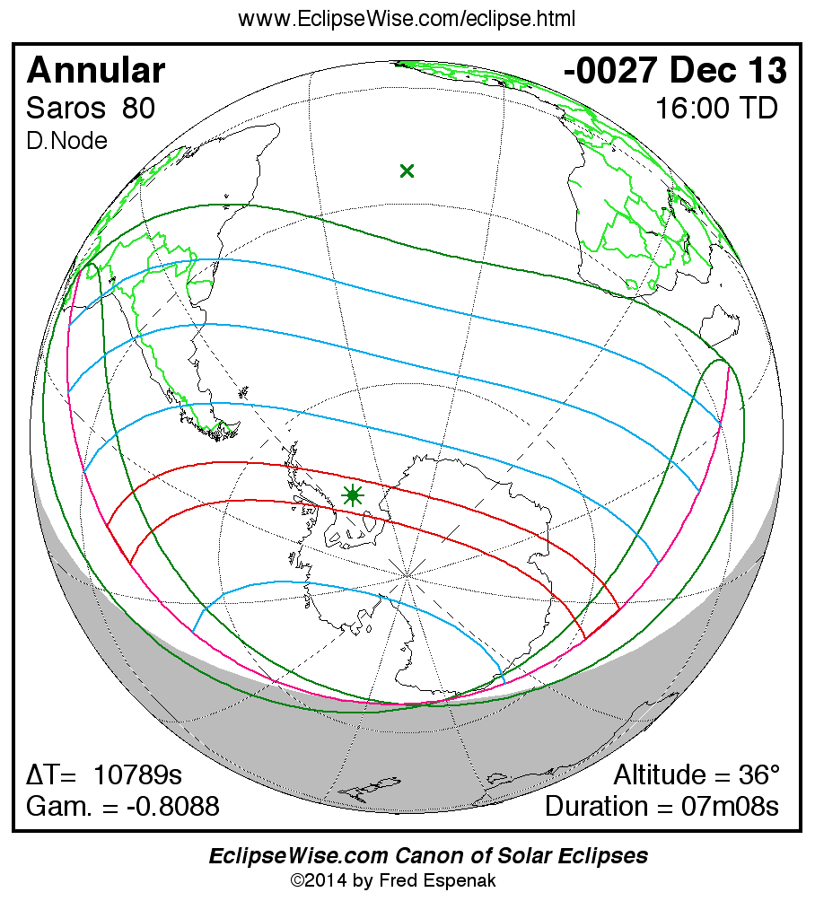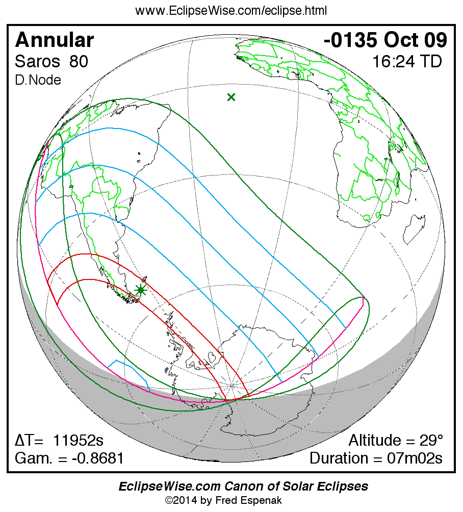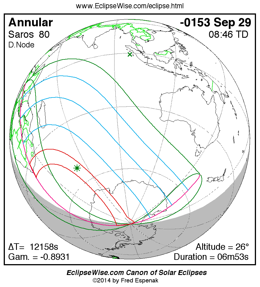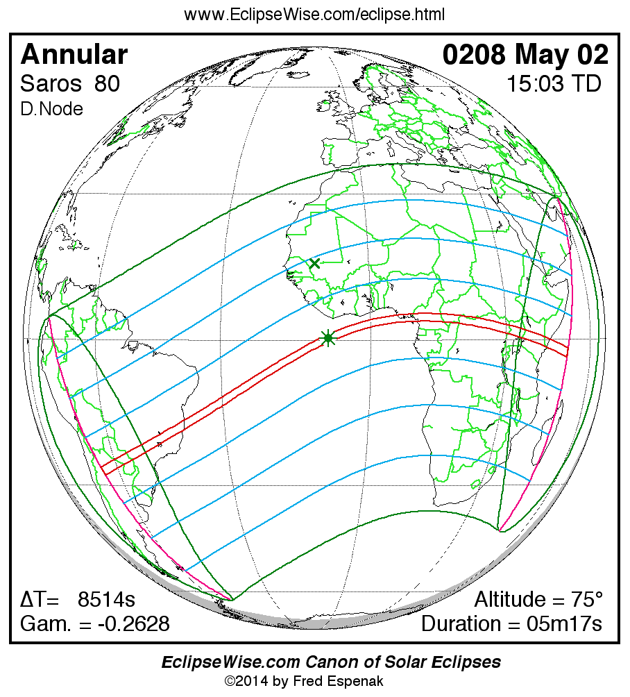 A panorama of all solar eclipses belonging to Saros 80 is presented here. Each map depicts the geographic region of visibility for a single eclipse. For central eclipses, the total or annular path is plotted in either blue (total) or red (annular). The date and time is given for the instant of Greatest Eclipse. Every map serves as a hyperlink to the EclipseWise Prime page for that eclipse where a larger map and complete details for the eclipse can be found. Visit the Key to Solar Eclipse Maps for a detailed explanation of these maps. Near the bottom of the page are a series of hyperlinks for more on solar eclipses.
