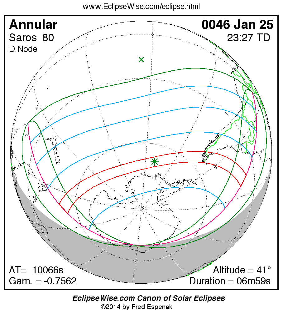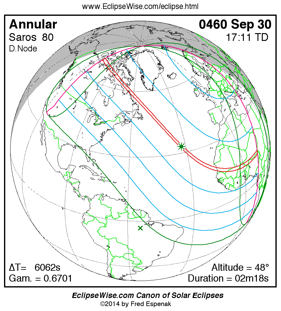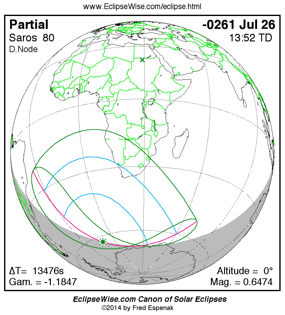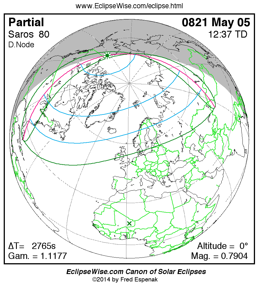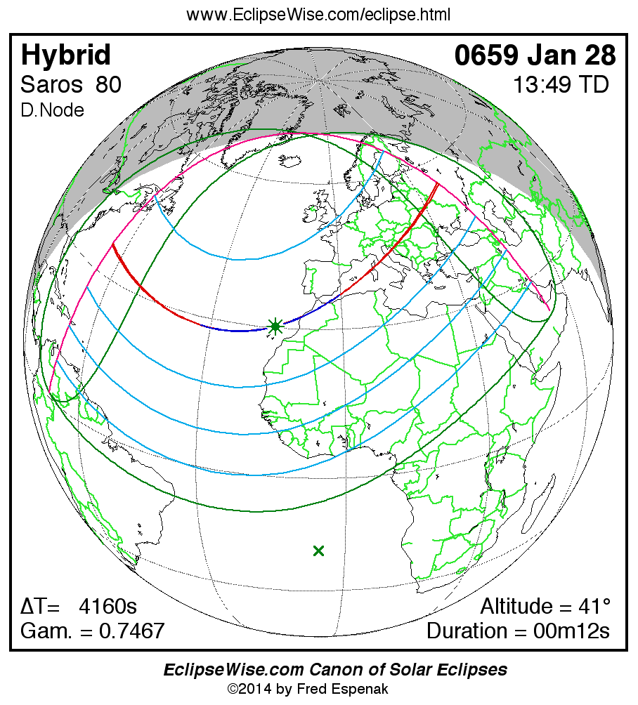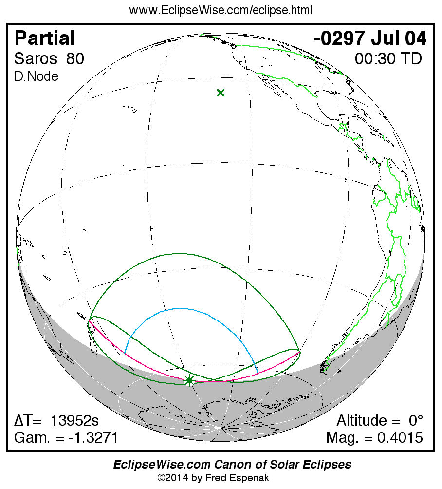 A panorama of all solar eclipses belonging to Saros 80 is presented here. Each map depicts the geographic region of visibility for a single eclipse. For central eclipses, the total or annular path is plotted in either blue (total) or red (annular). The date and time is given for the instant of Greatest Eclipse. Every map serves as a hyperlink to the EclipseWise Prime page for that eclipse where a larger map and complete details for the eclipse can be found. Visit the Key to Solar Eclipse Maps for a detailed explanation of these maps. Near the bottom of the page are a series of hyperlinks for more on solar eclipses.