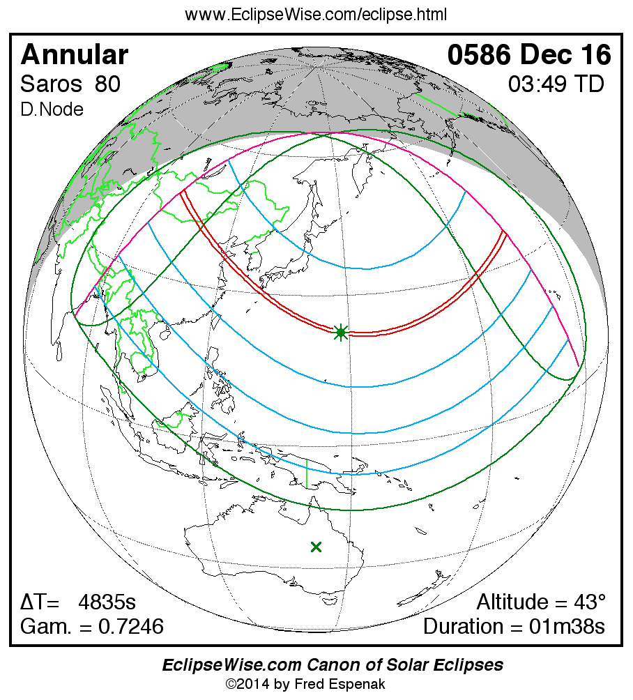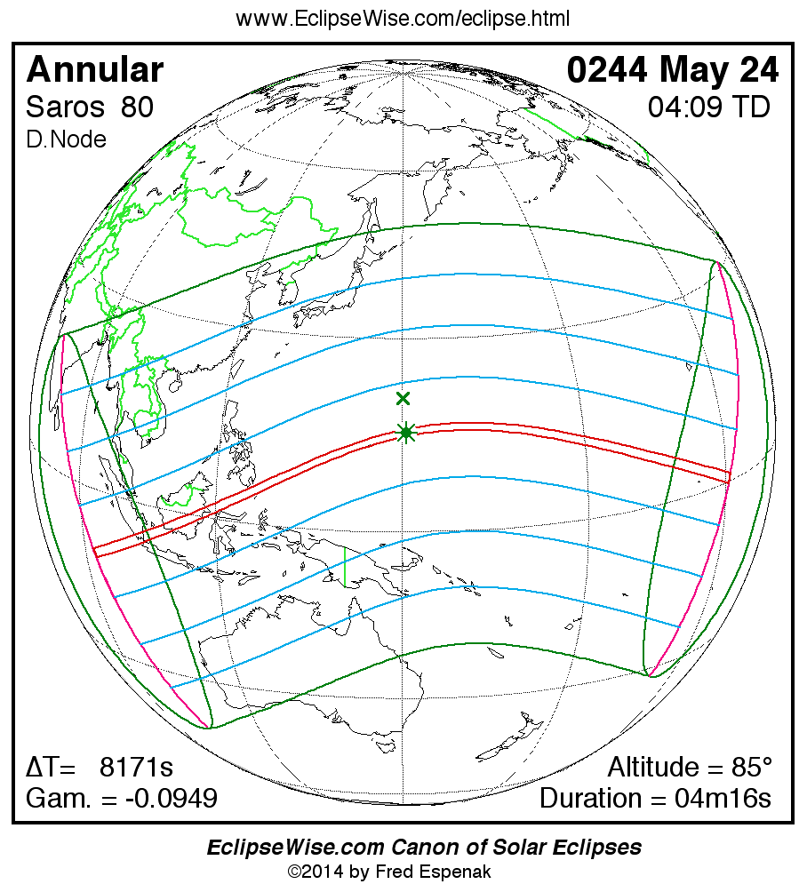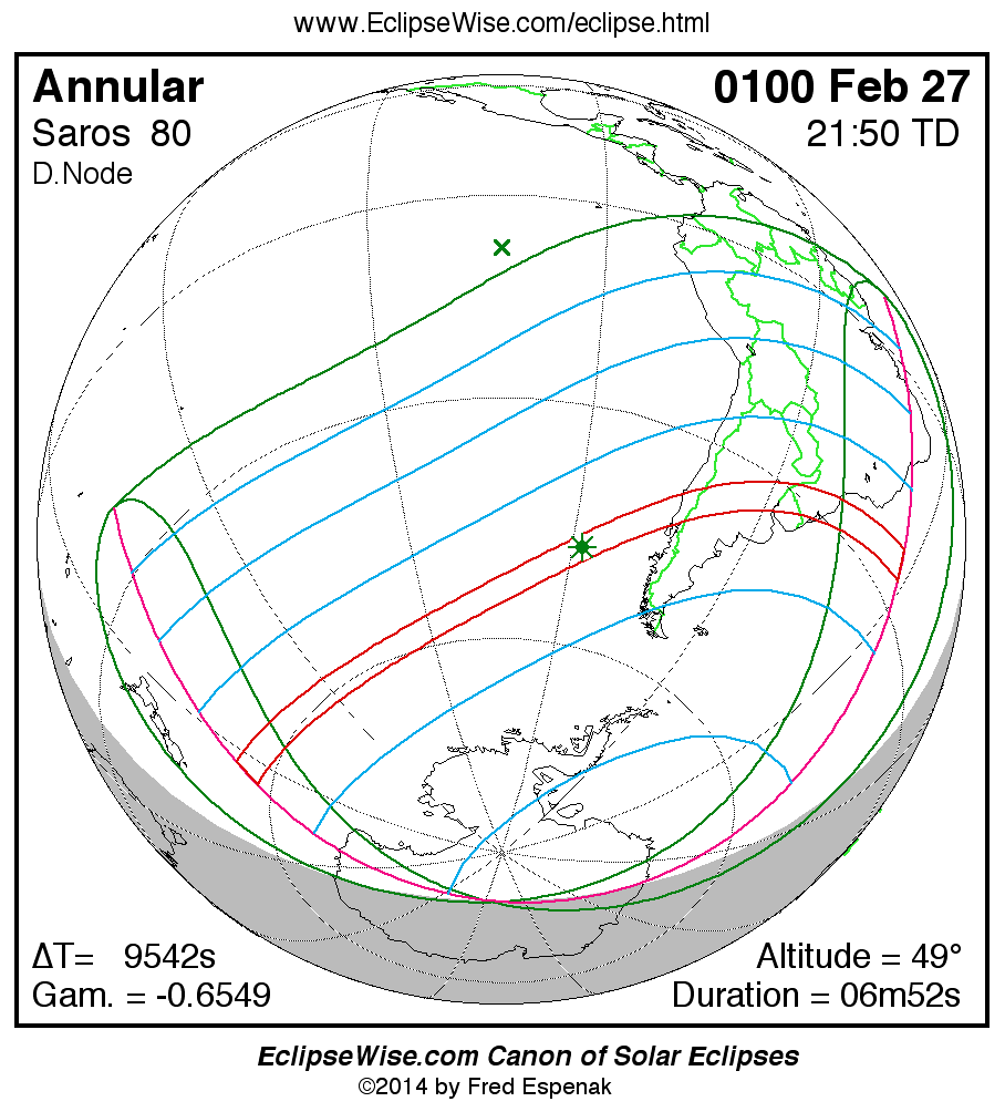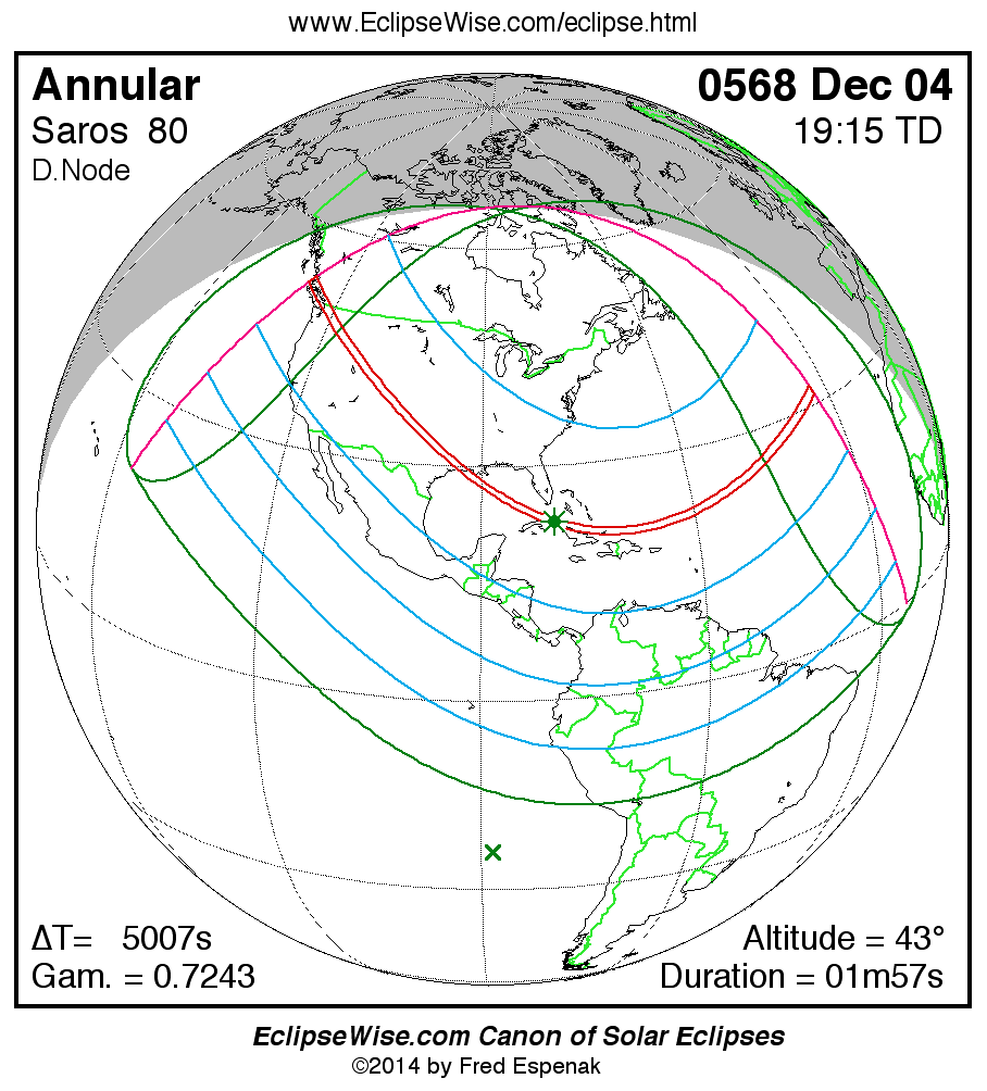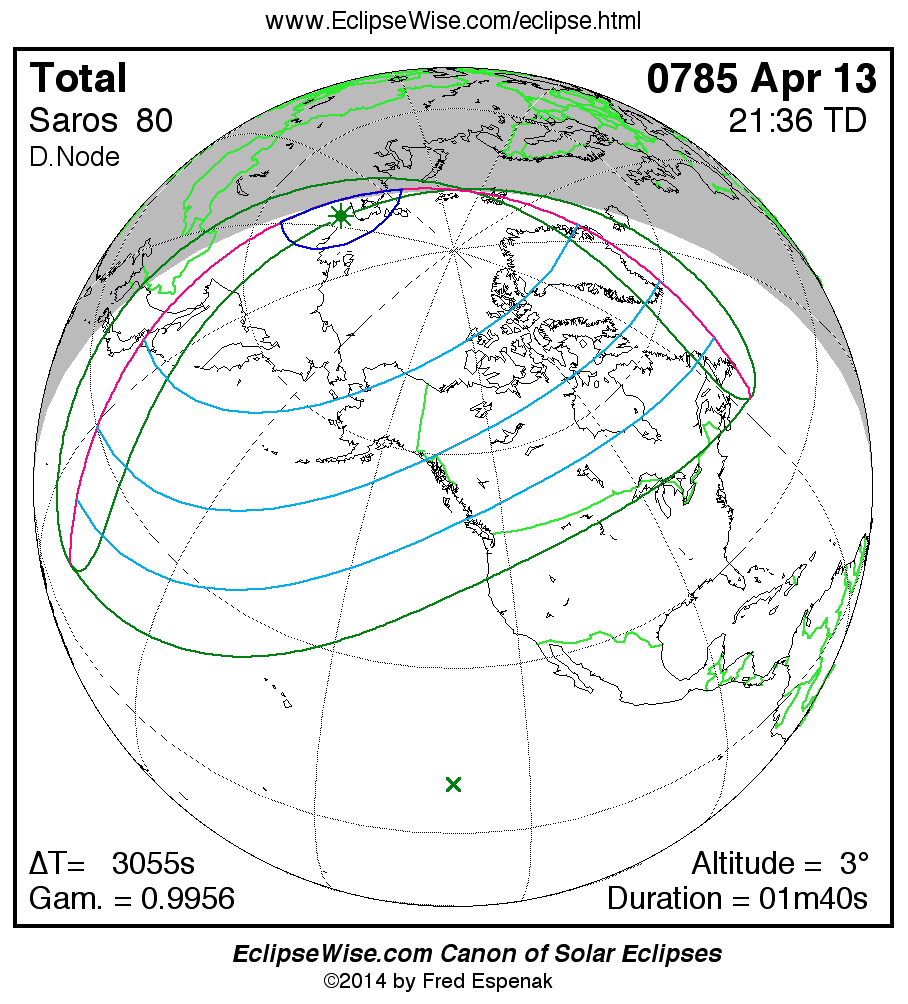 A panorama of all solar eclipses belonging to Saros 80 is presented here. Each map depicts the geographic region of visibility for a single eclipse. For central eclipses, the total or annular path is plotted in either blue (total) or red (annular). The date and time is given for the instant of Greatest Eclipse. Every map serves as a hyperlink to the EclipseWise Prime page for that eclipse where a larger map and complete details for the eclipse can be found. Visit the Key to Solar Eclipse Maps for a detailed explanation of these maps. Near the bottom of the page are a series of hyperlinks for more on solar eclipses.