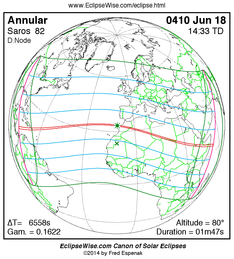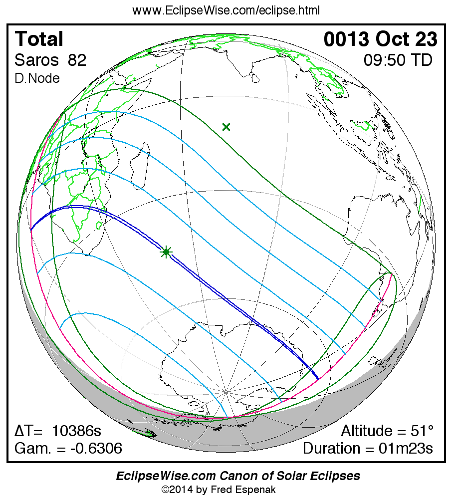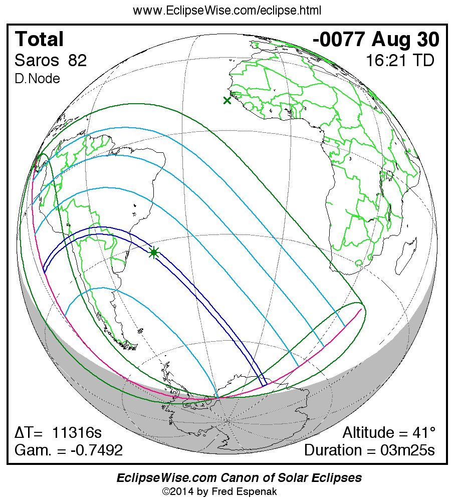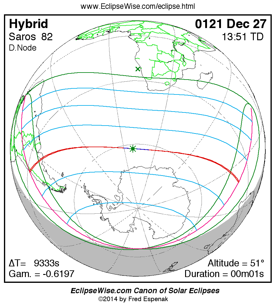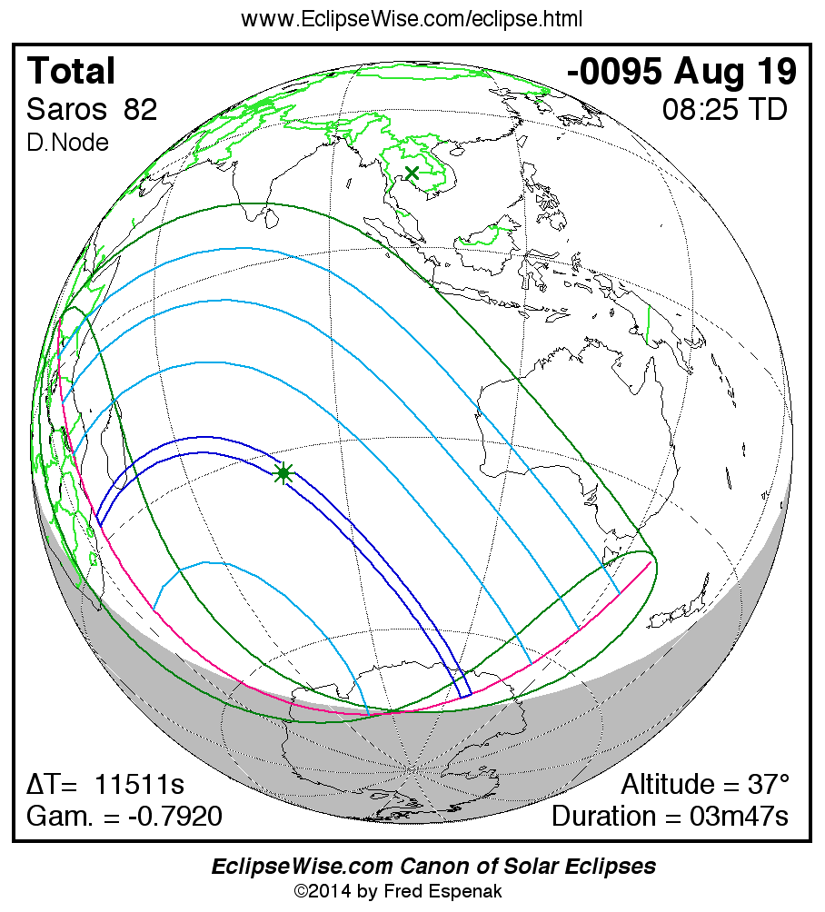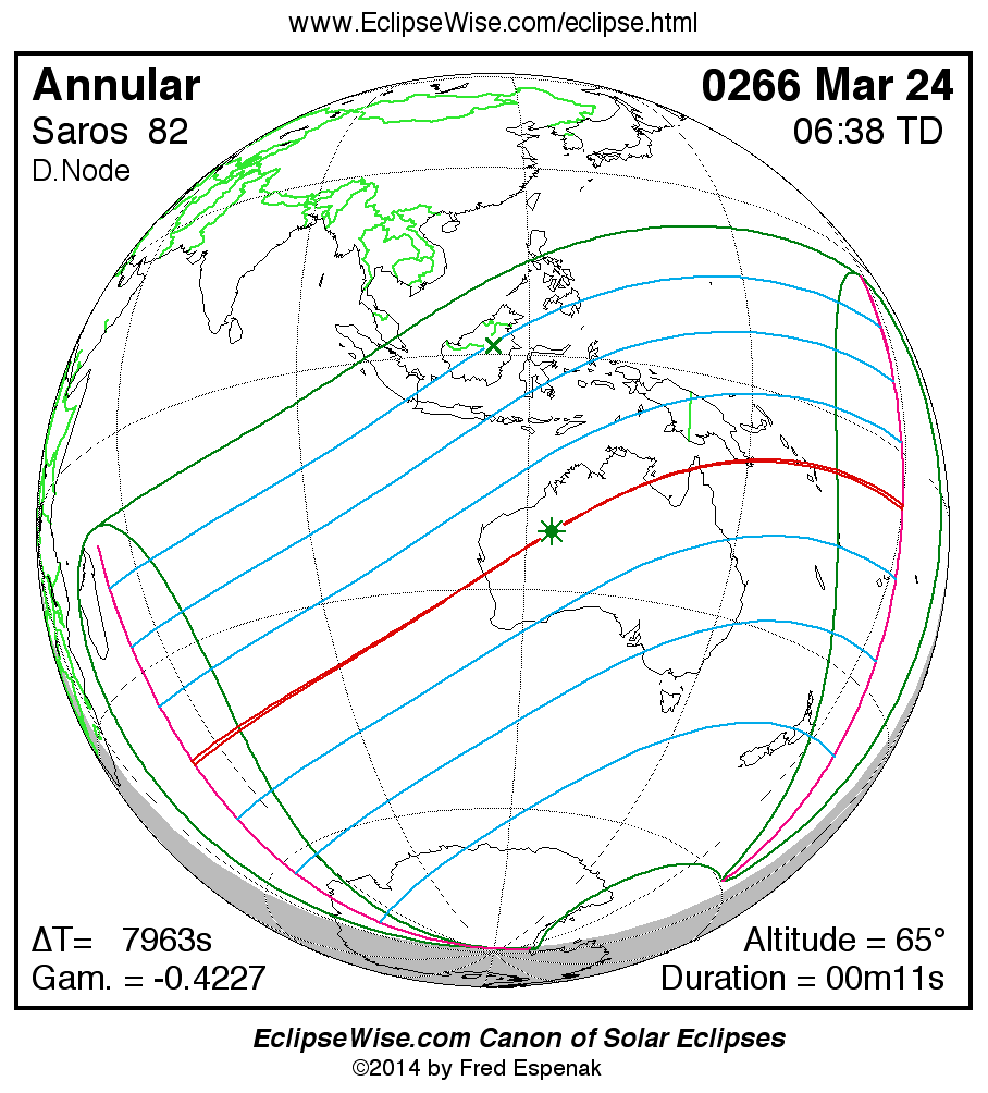 A panorama of all solar eclipses belonging to Saros 82 is presented here. Each map depicts the geographic region of visibility for a single eclipse. For central eclipses, the total or annular path is plotted in either blue (total) or red (annular). The date and time is given for the instant of Greatest Eclipse. Every map serves as a hyperlink to the EclipseWise Prime page for that eclipse where a larger map and complete details for the eclipse can be found. Visit the Key to Solar Eclipse Maps for a detailed explanation of these maps. Near the bottom of the page are a series of hyperlinks for more on solar eclipses.
