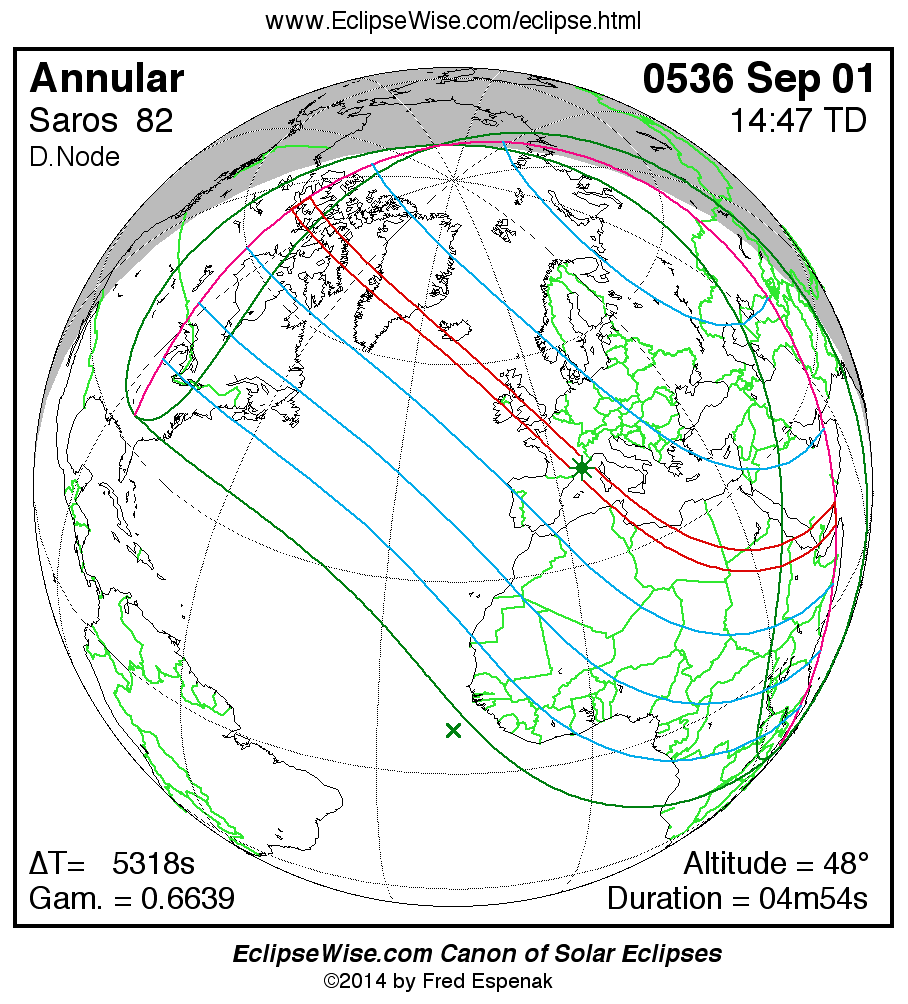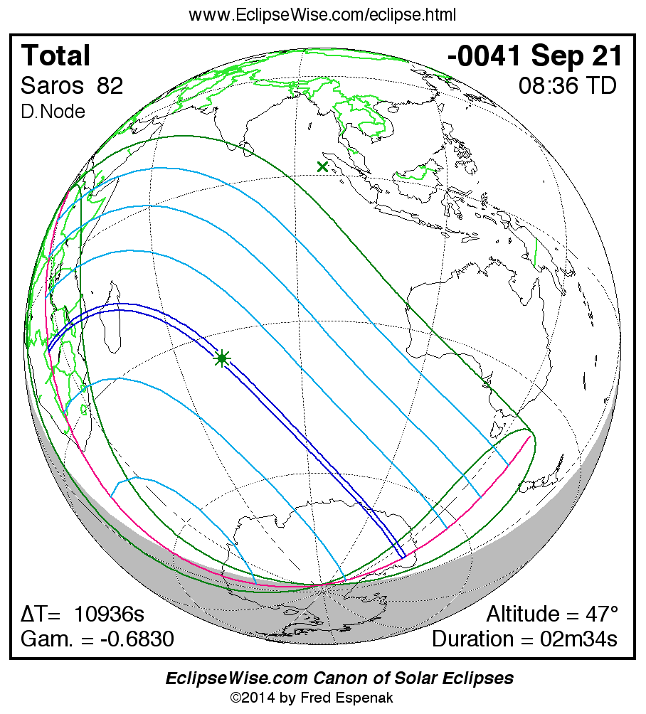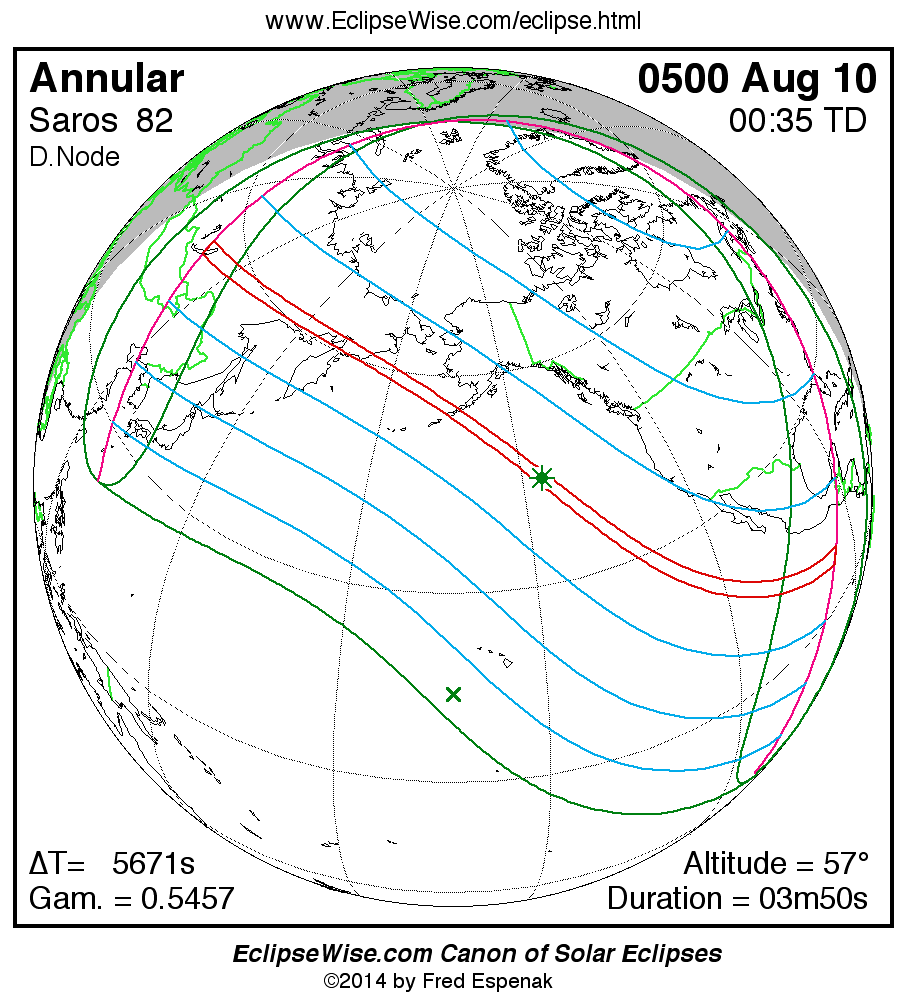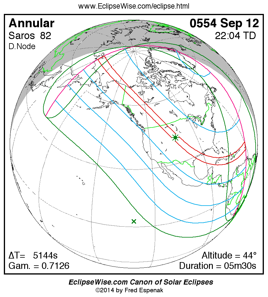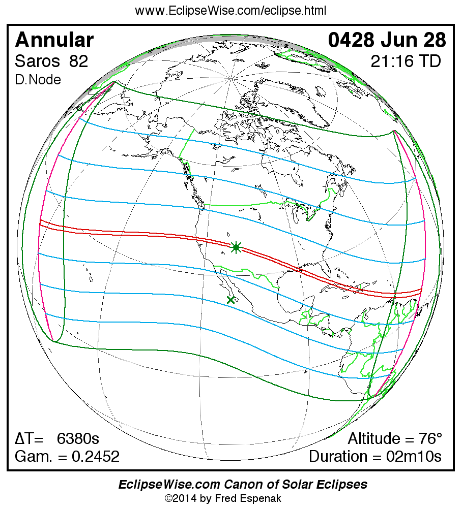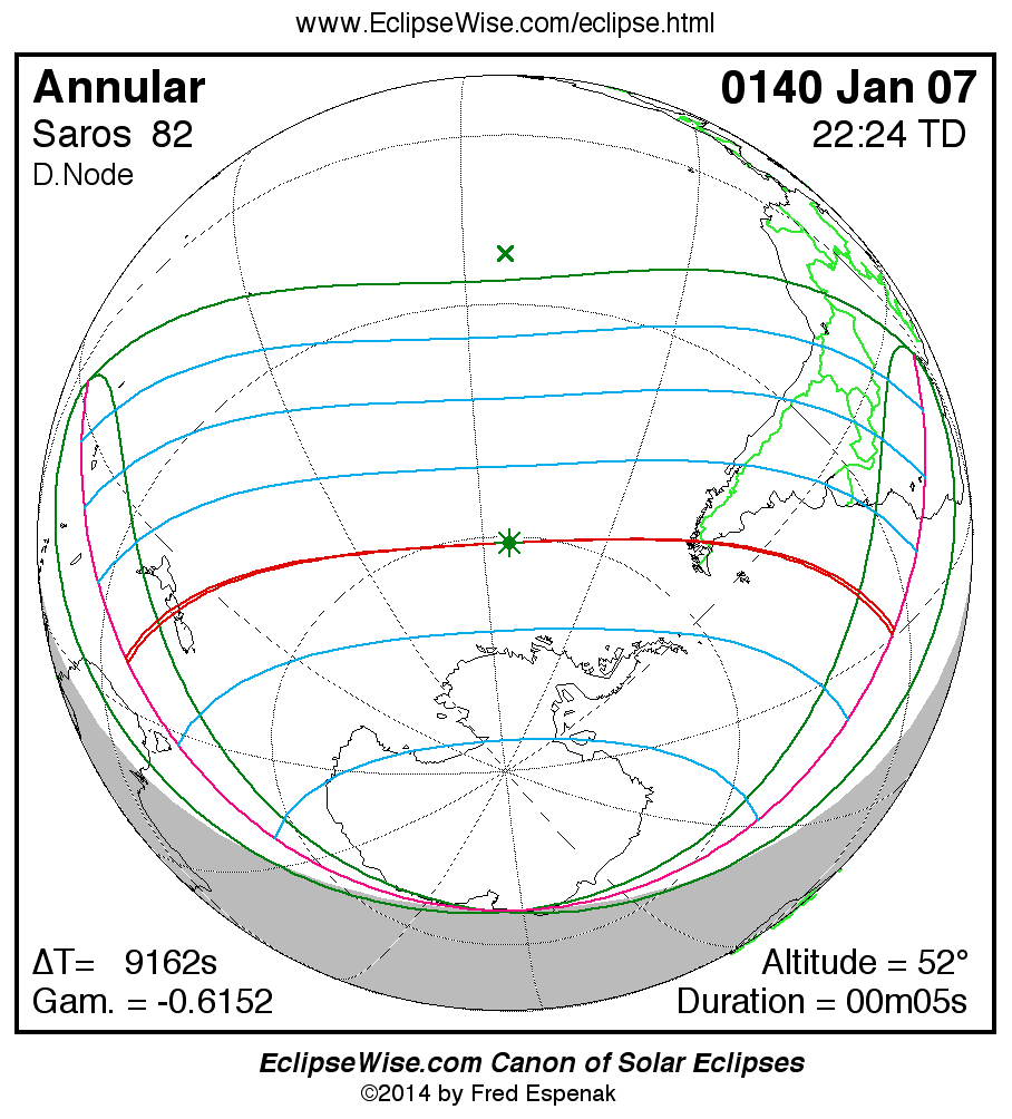 A panorama of all solar eclipses belonging to Saros 82 is presented here. Each map depicts the geographic region of visibility for a single eclipse. For central eclipses, the total or annular path is plotted in either blue (total) or red (annular). The date and time is given for the instant of Greatest Eclipse. Every map serves as a hyperlink to the EclipseWise Prime page for that eclipse where a larger map and complete details for the eclipse can be found. Visit the Key to Solar Eclipse Maps for a detailed explanation of these maps. Near the bottom of the page are a series of hyperlinks for more on solar eclipses.