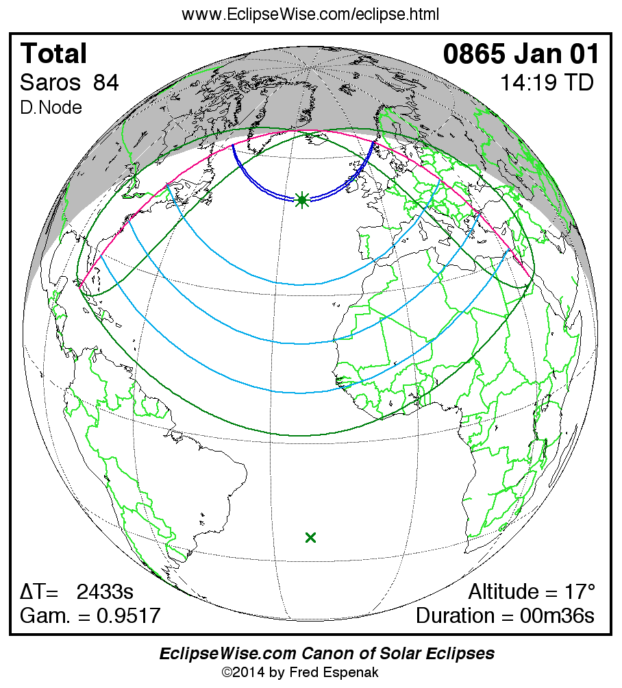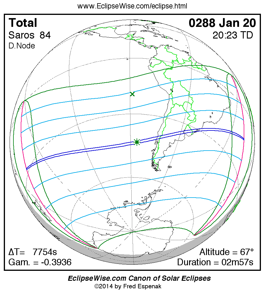 A panorama of all solar eclipses belonging to Saros 84 is presented here. Each map depicts the geographic region of visibility for a single eclipse. For central eclipses, the total or annular path is plotted in either blue (total) or red (annular). The date and time is given for the instant of Greatest Eclipse. Every map serves as a hyperlink to the EclipseWise Prime page for that eclipse where a larger map and complete details for the eclipse can be found. Visit the Key to Solar Eclipse Maps for a detailed explanation of these maps. Near the bottom of the page are a series of hyperlinks for more on solar eclipses.