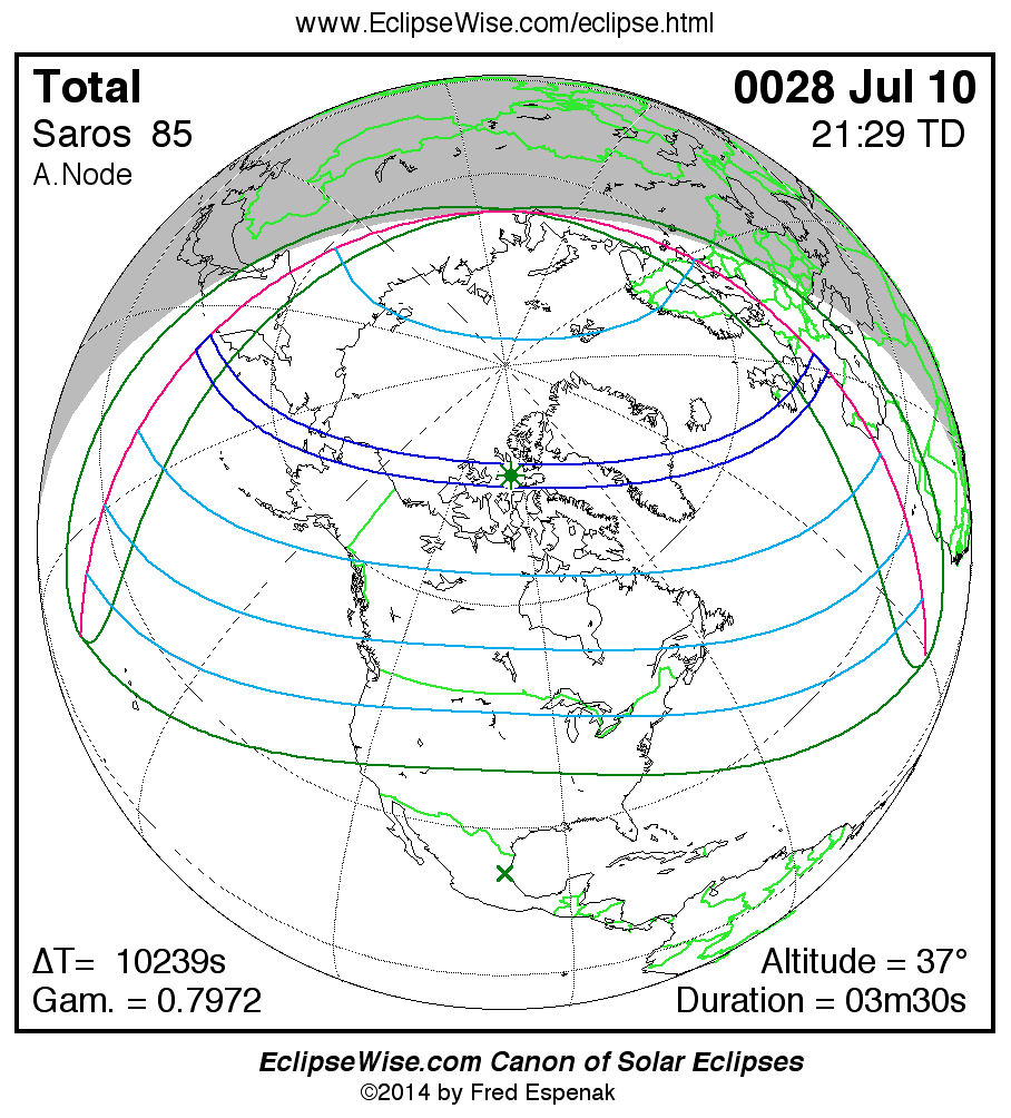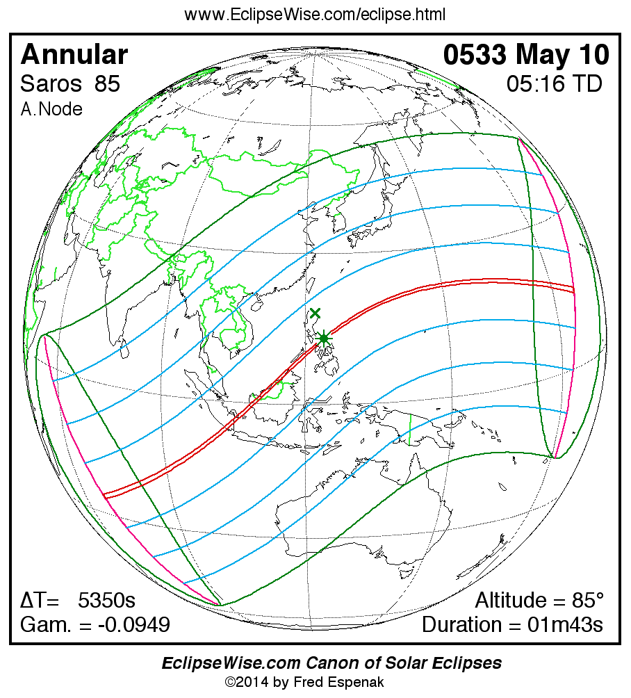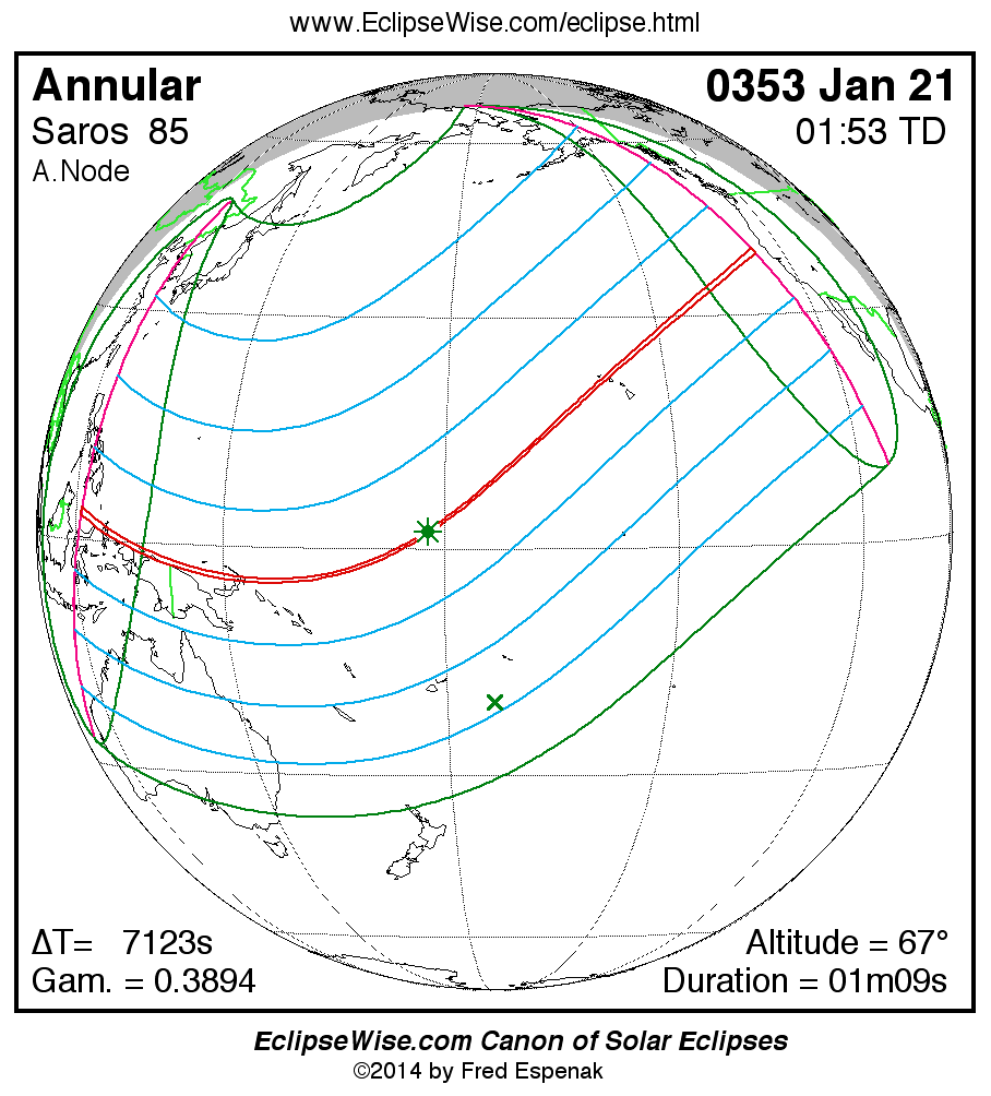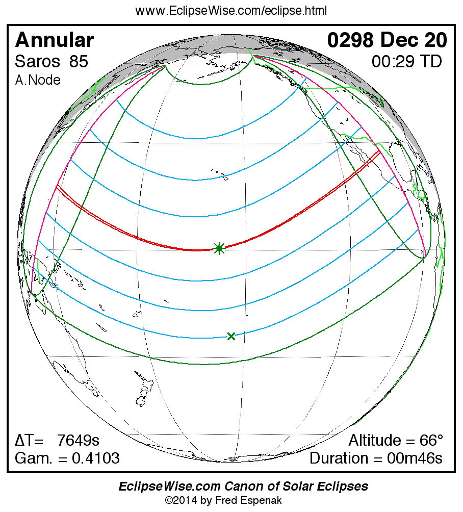 A panorama of all solar eclipses belonging to Saros 85 is presented here. Each map depicts the geographic region of visibility for a single eclipse. For central eclipses, the total or annular path is plotted in either blue (total) or red (annular). The date and time is given for the instant of Greatest Eclipse. Every map serves as a hyperlink to the EclipseWise Prime page for that eclipse where a larger map and complete details for the eclipse can be found. Visit the Key to Solar Eclipse Maps for a detailed explanation of these maps. Near the bottom of the page are a series of hyperlinks for more on solar eclipses.