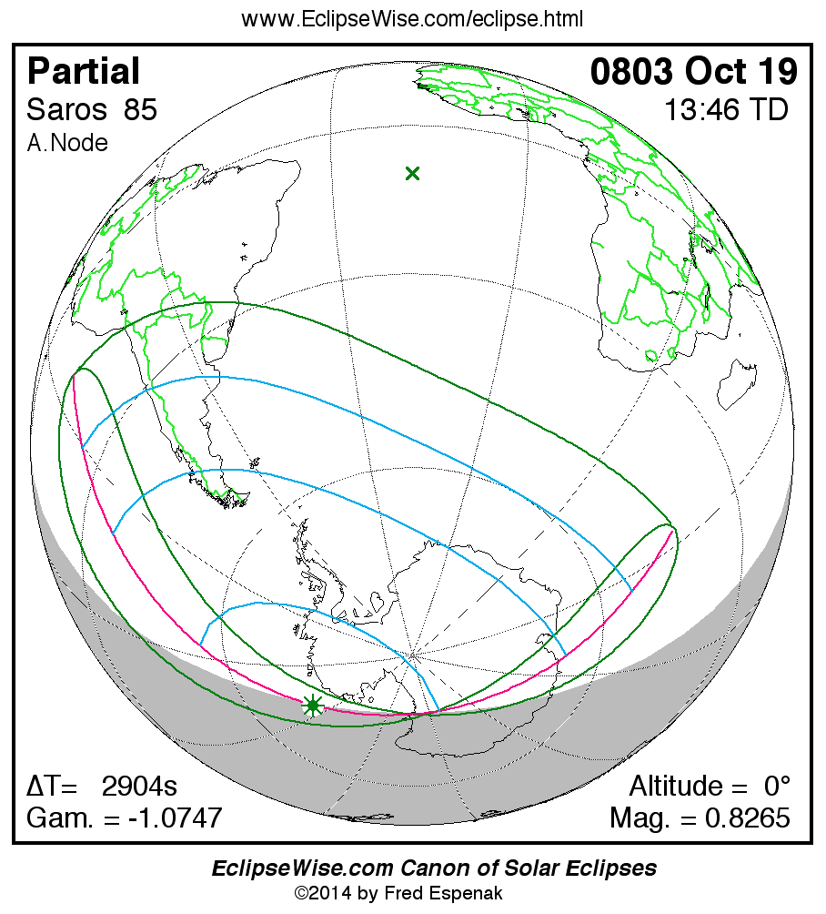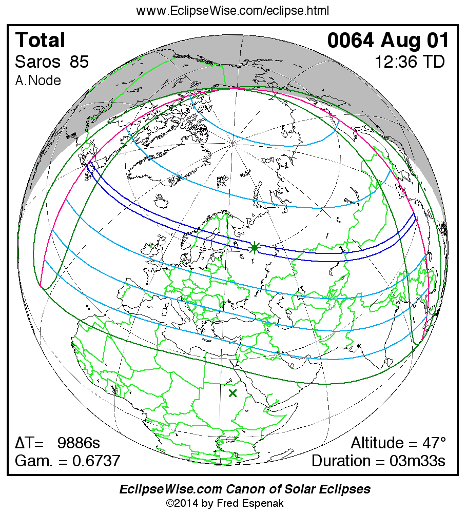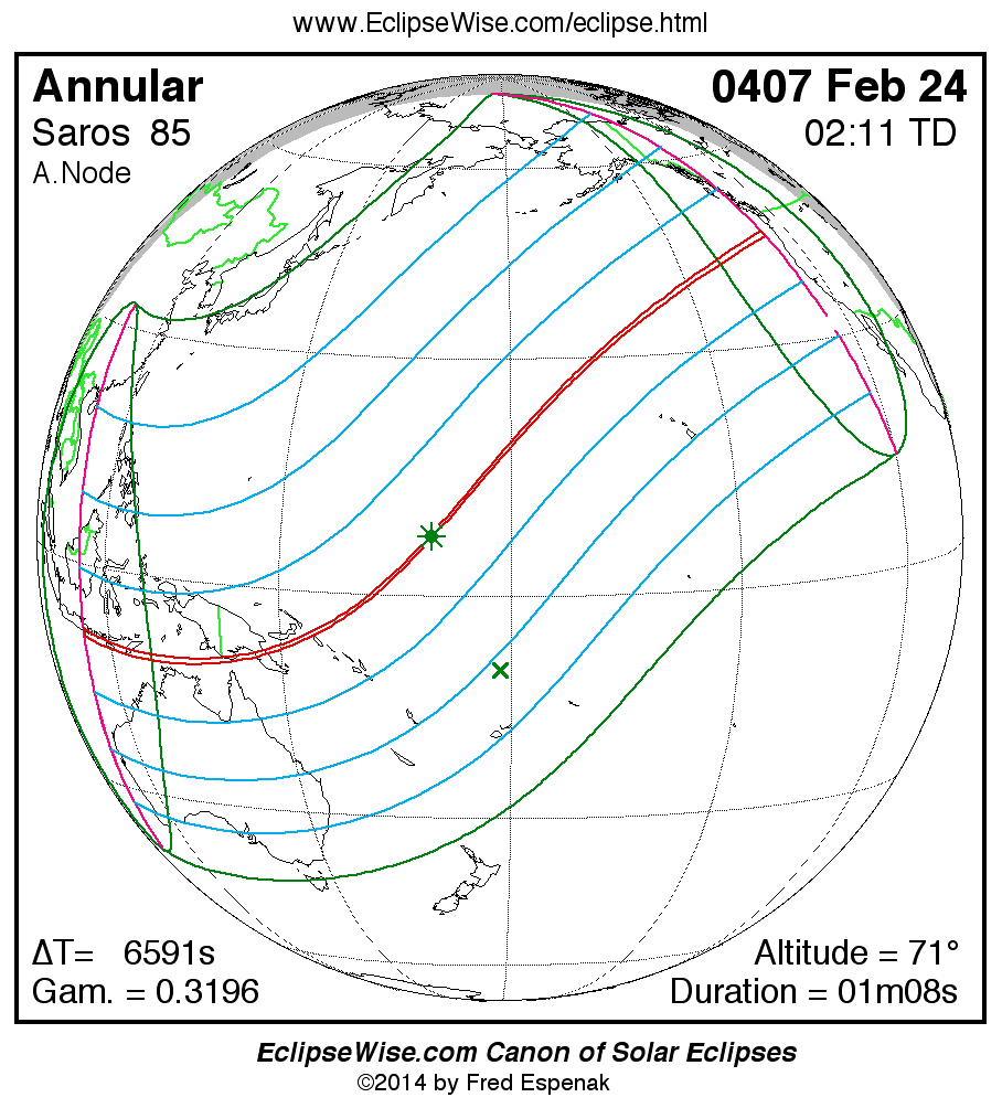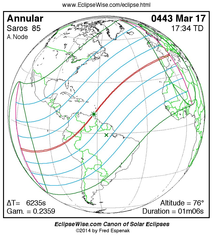 A panorama of all solar eclipses belonging to Saros 85 is presented here. Each map depicts the geographic region of visibility for a single eclipse. For central eclipses, the total or annular path is plotted in either blue (total) or red (annular). The date and time is given for the instant of Greatest Eclipse. Every map serves as a hyperlink to the EclipseWise Prime page for that eclipse where a larger map and complete details for the eclipse can be found. Visit the Key to Solar Eclipse Maps for a detailed explanation of these maps. Near the bottom of the page are a series of hyperlinks for more on solar eclipses.