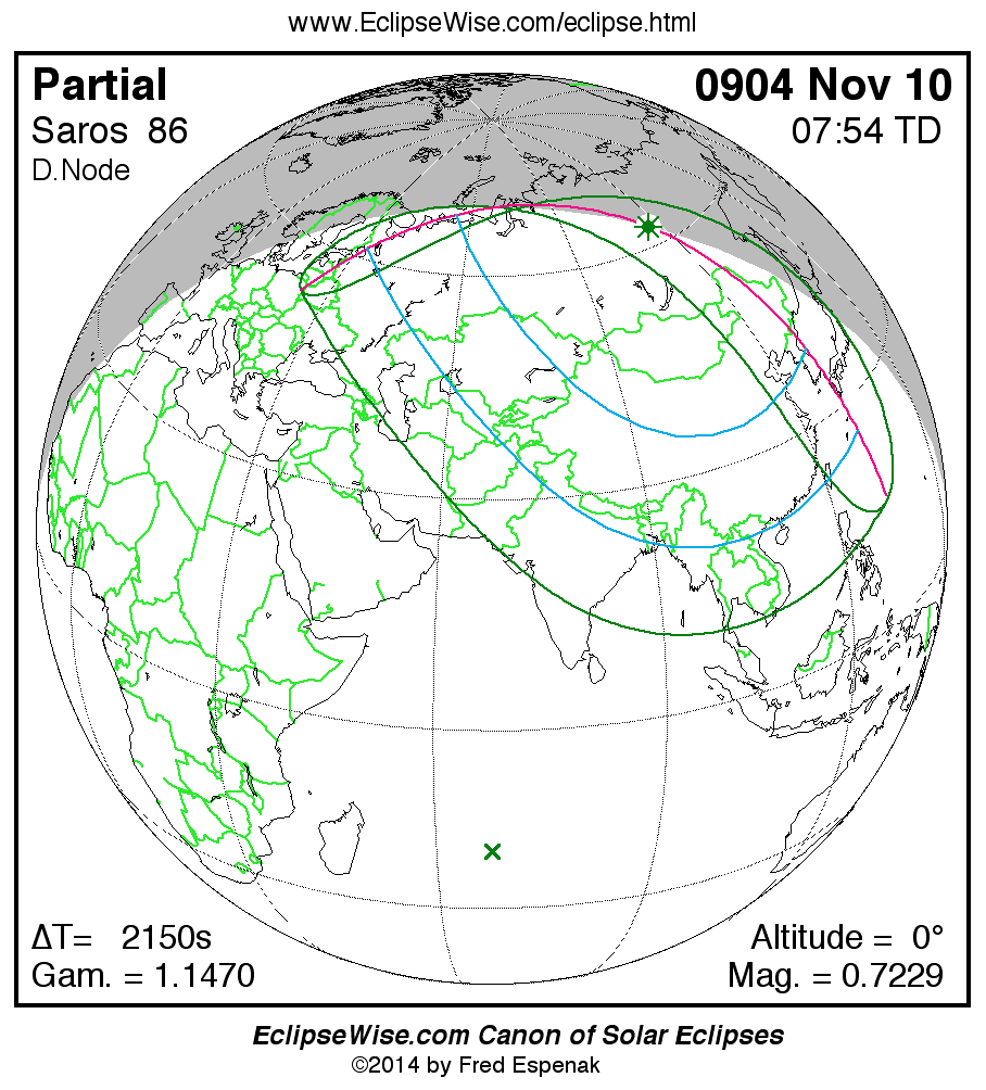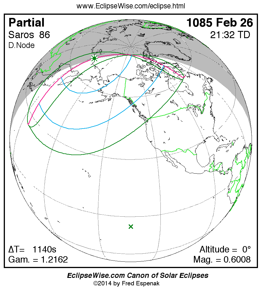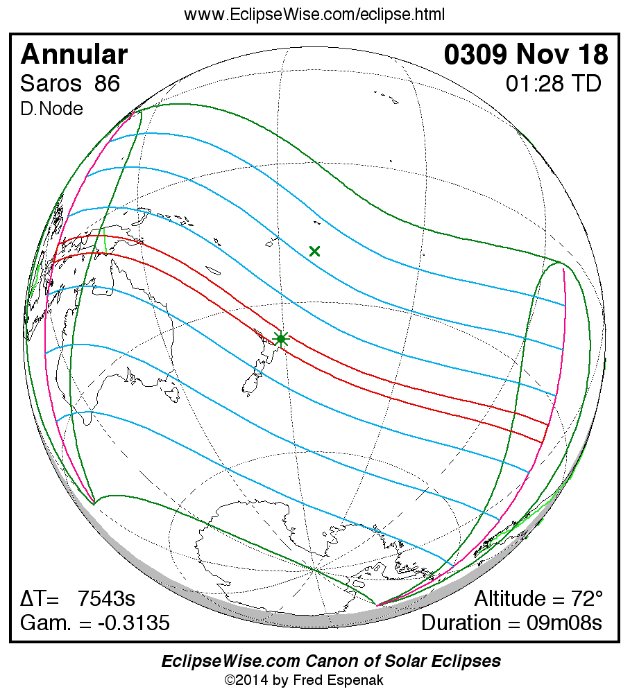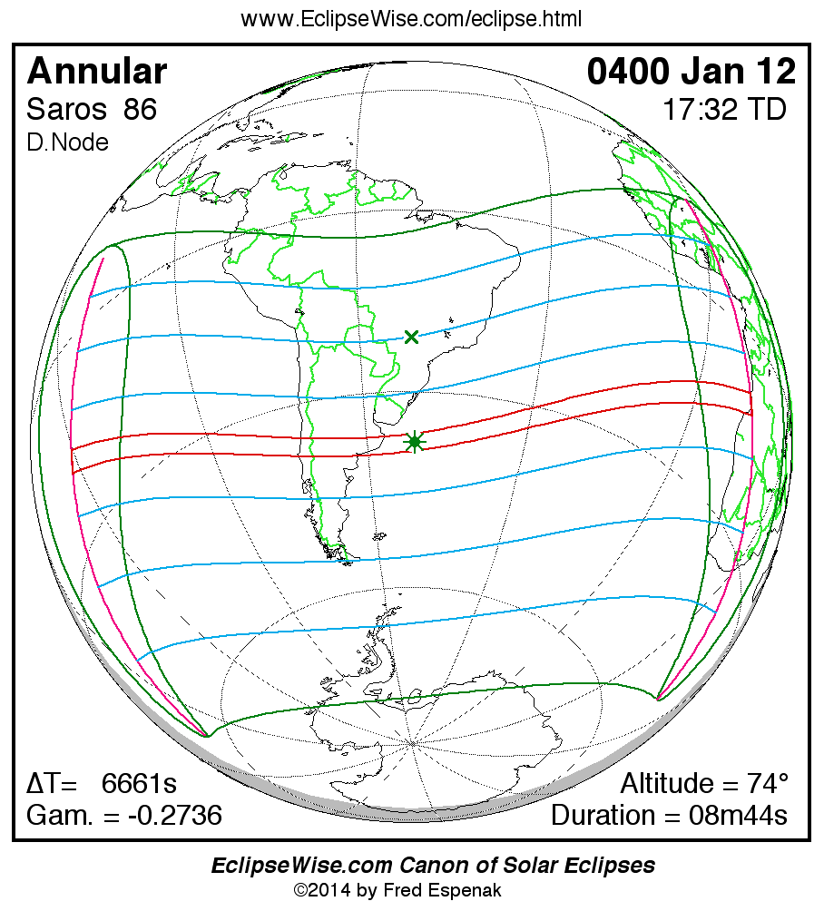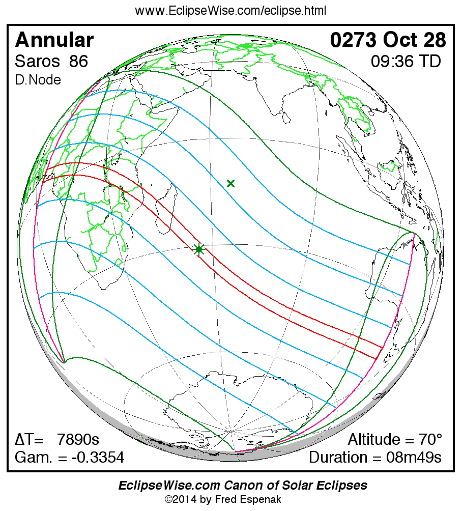 A panorama of all solar eclipses belonging to Saros 86 is presented here. Each map depicts the geographic region of visibility for a single eclipse. For central eclipses, the total or annular path is plotted in either blue (total) or red (annular). The date and time is given for the instant of Greatest Eclipse. Every map serves as a hyperlink to the EclipseWise Prime page for that eclipse where a larger map and complete details for the eclipse can be found. Visit the Key to Solar Eclipse Maps for a detailed explanation of these maps. Near the bottom of the page are a series of hyperlinks for more on solar eclipses.