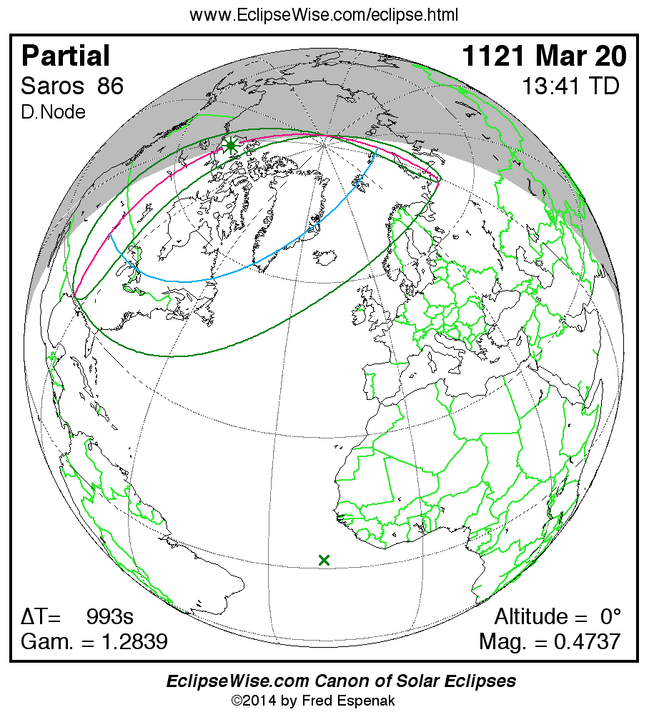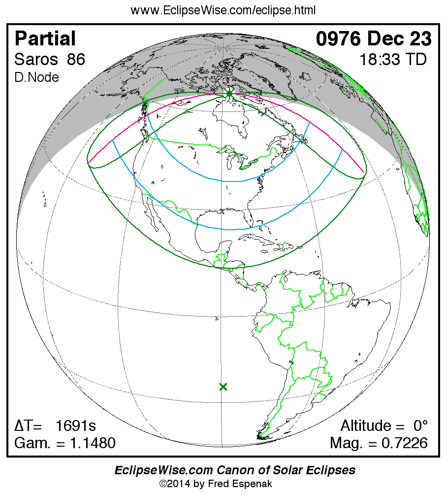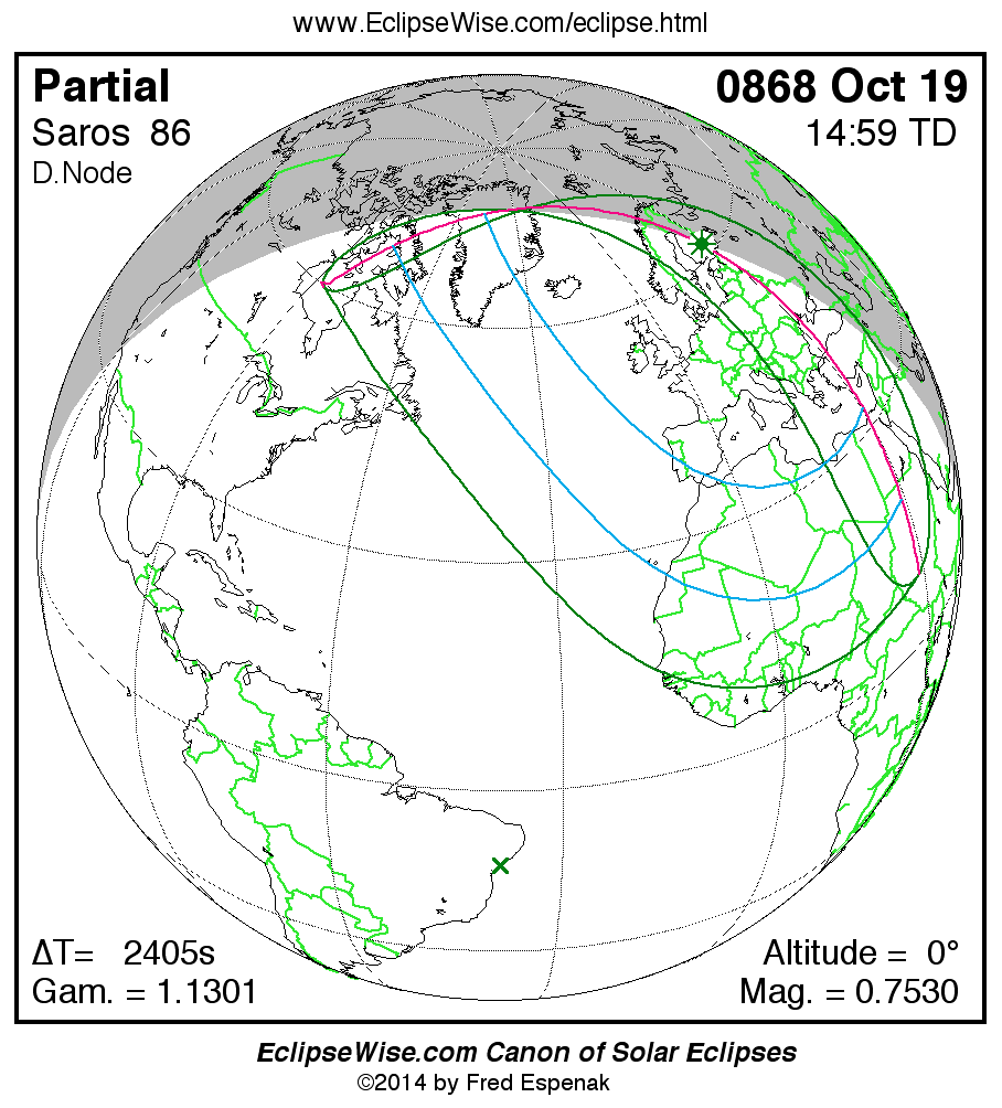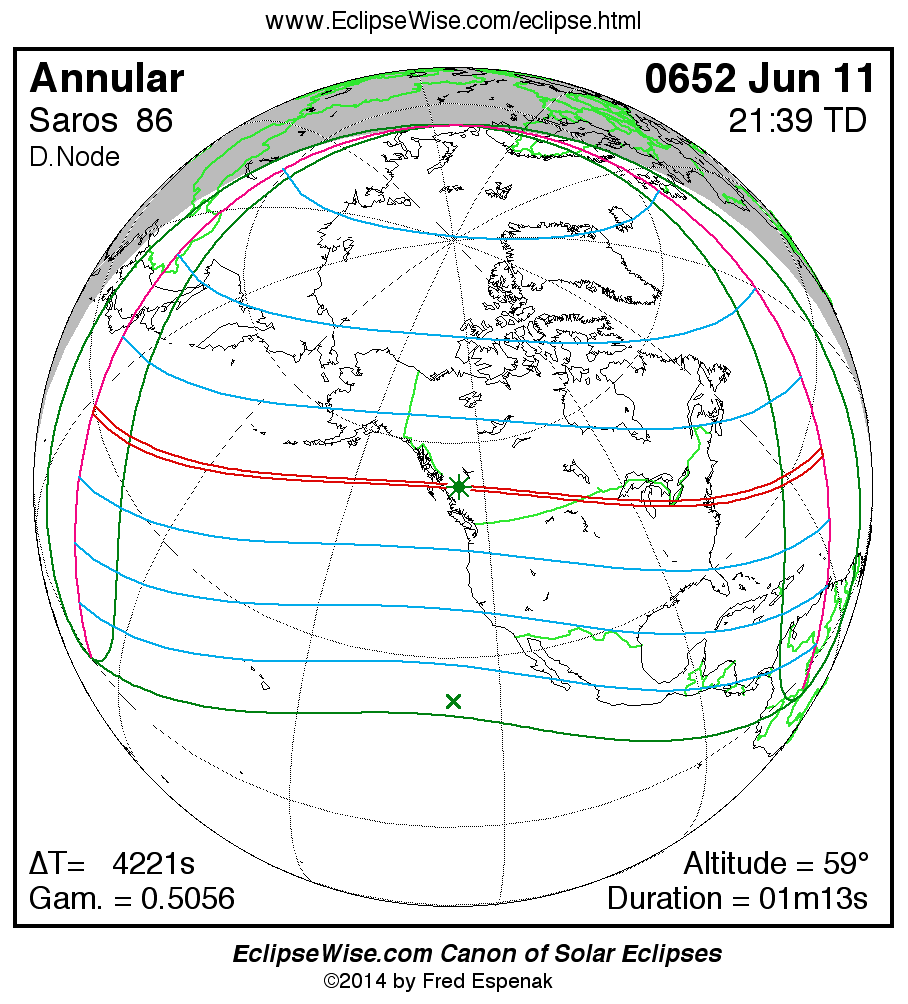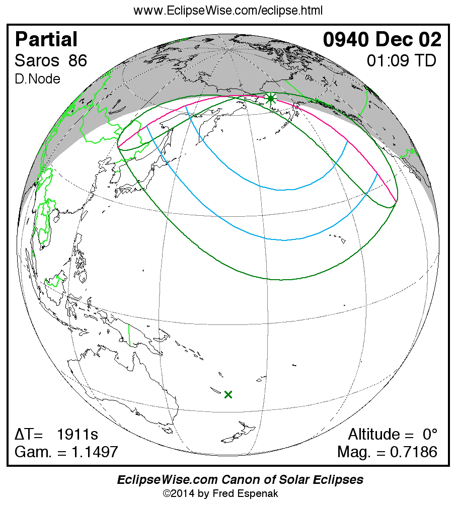 A panorama of all solar eclipses belonging to Saros 86 is presented here. Each map depicts the geographic region of visibility for a single eclipse. For central eclipses, the total or annular path is plotted in either blue (total) or red (annular). The date and time is given for the instant of Greatest Eclipse. Every map serves as a hyperlink to the EclipseWise Prime page for that eclipse where a larger map and complete details for the eclipse can be found. Visit the Key to Solar Eclipse Maps for a detailed explanation of these maps. Near the bottom of the page are a series of hyperlinks for more on solar eclipses.