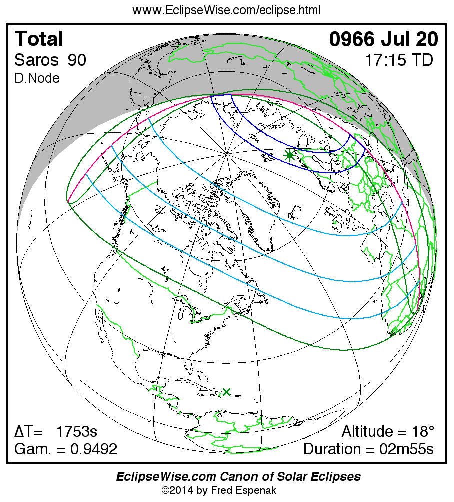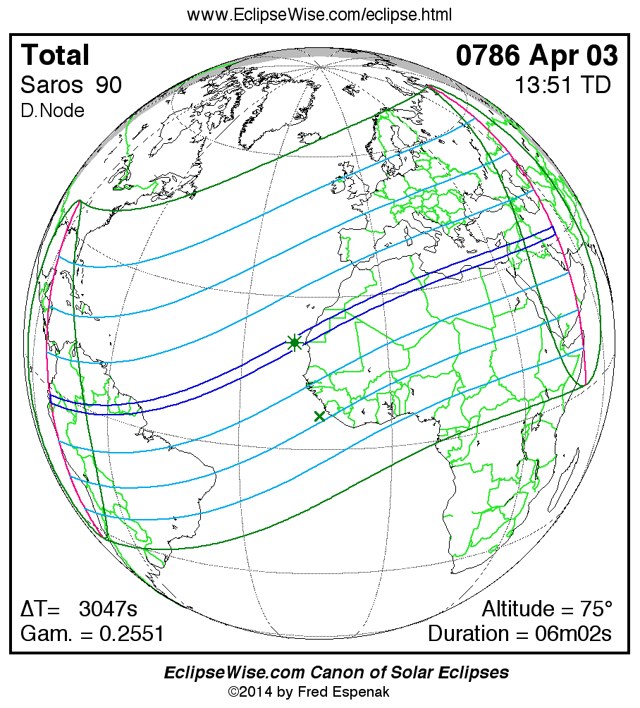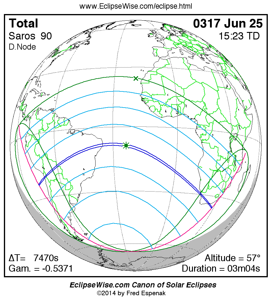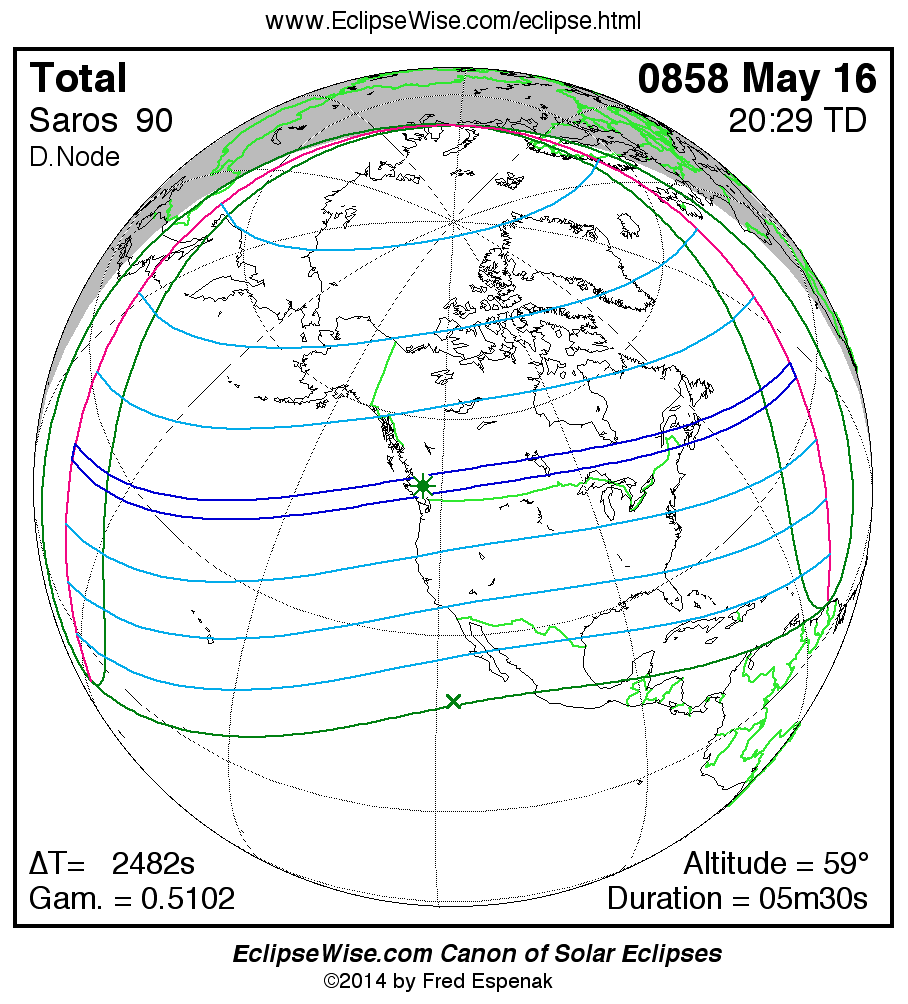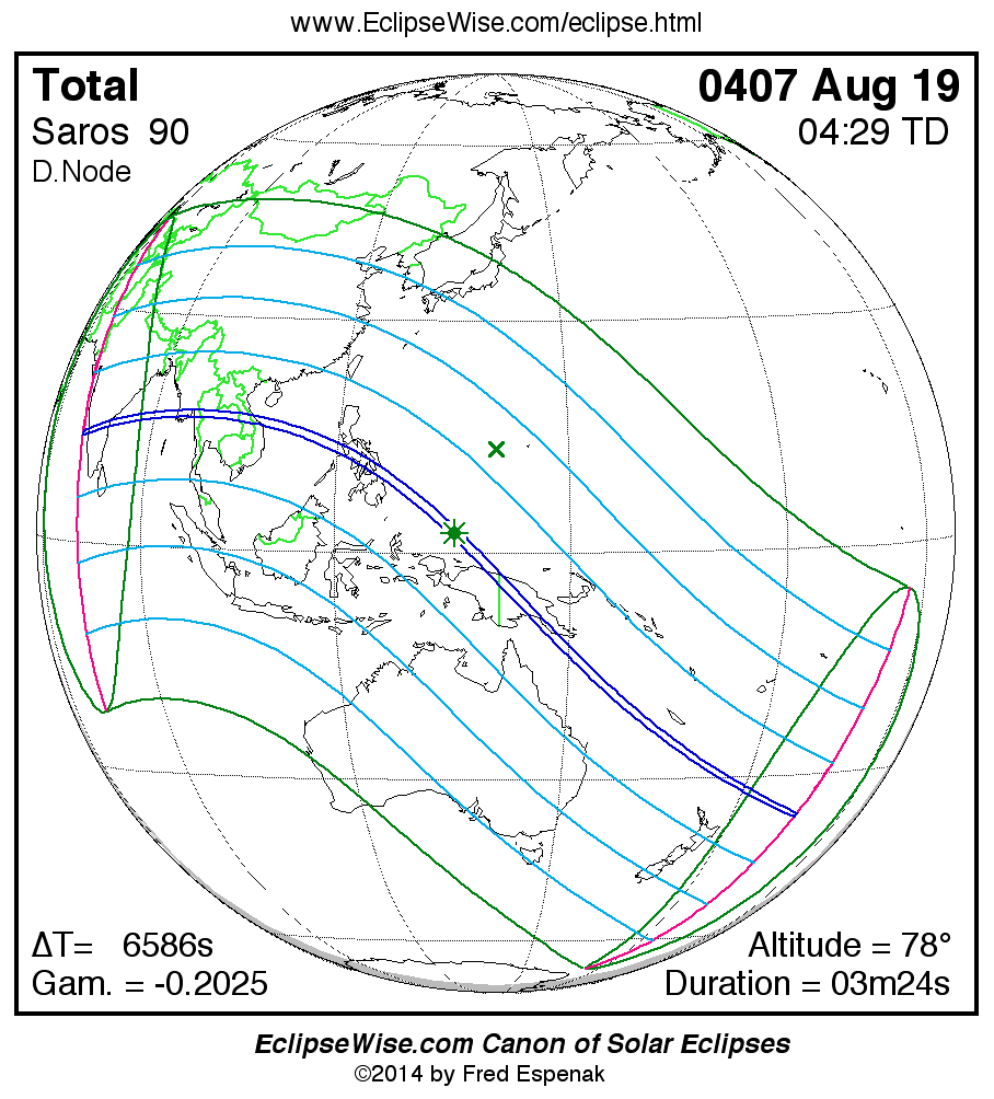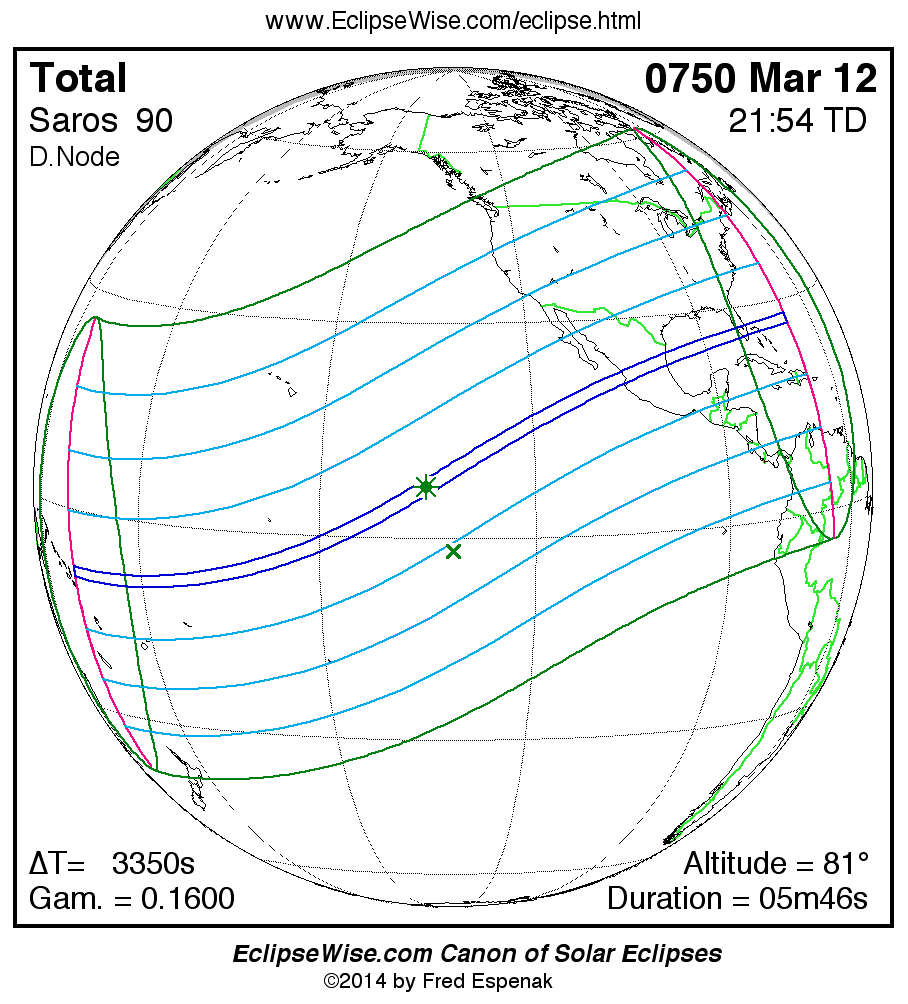 A panorama of all solar eclipses belonging to Saros 90 is presented here. Each map depicts the geographic region of visibility for a single eclipse. For central eclipses, the total or annular path is plotted in either blue (total) or red (annular). The date and time is given for the instant of Greatest Eclipse. Every map serves as a hyperlink to the EclipseWise Prime page for that eclipse where a larger map and complete details for the eclipse can be found. Visit the Key to Solar Eclipse Maps for a detailed explanation of these maps. Near the bottom of the page are a series of hyperlinks for more on solar eclipses.