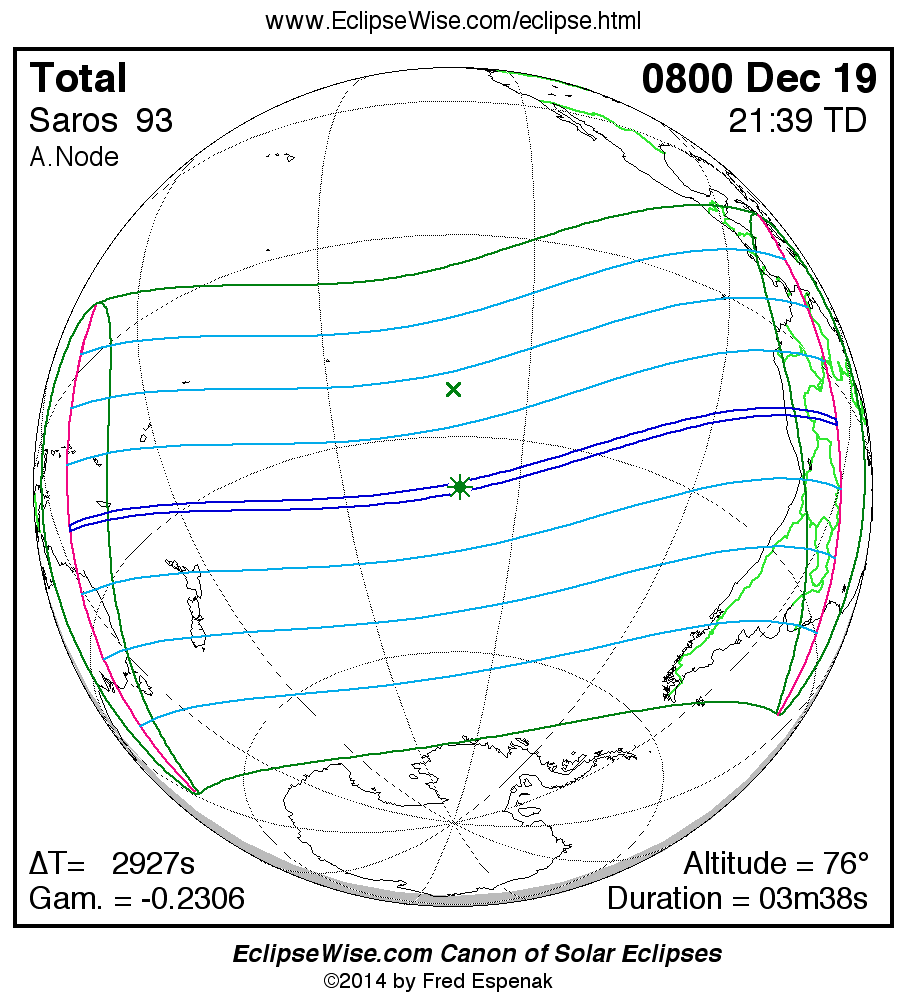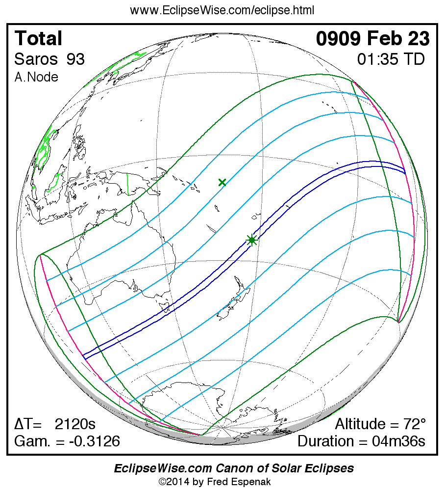 A panorama of all solar eclipses belonging to Saros 93 is presented here. Each map depicts the geographic region of visibility for a single eclipse. For central eclipses, the total or annular path is plotted in either blue (total) or red (annular). The date and time is given for the instant of Greatest Eclipse. Every map serves as a hyperlink to the EclipseWise Prime page for that eclipse where a larger map and complete details for the eclipse can be found. Visit the Key to Solar Eclipse Maps for a detailed explanation of these maps. Near the bottom of the page are a series of hyperlinks for more on solar eclipses.