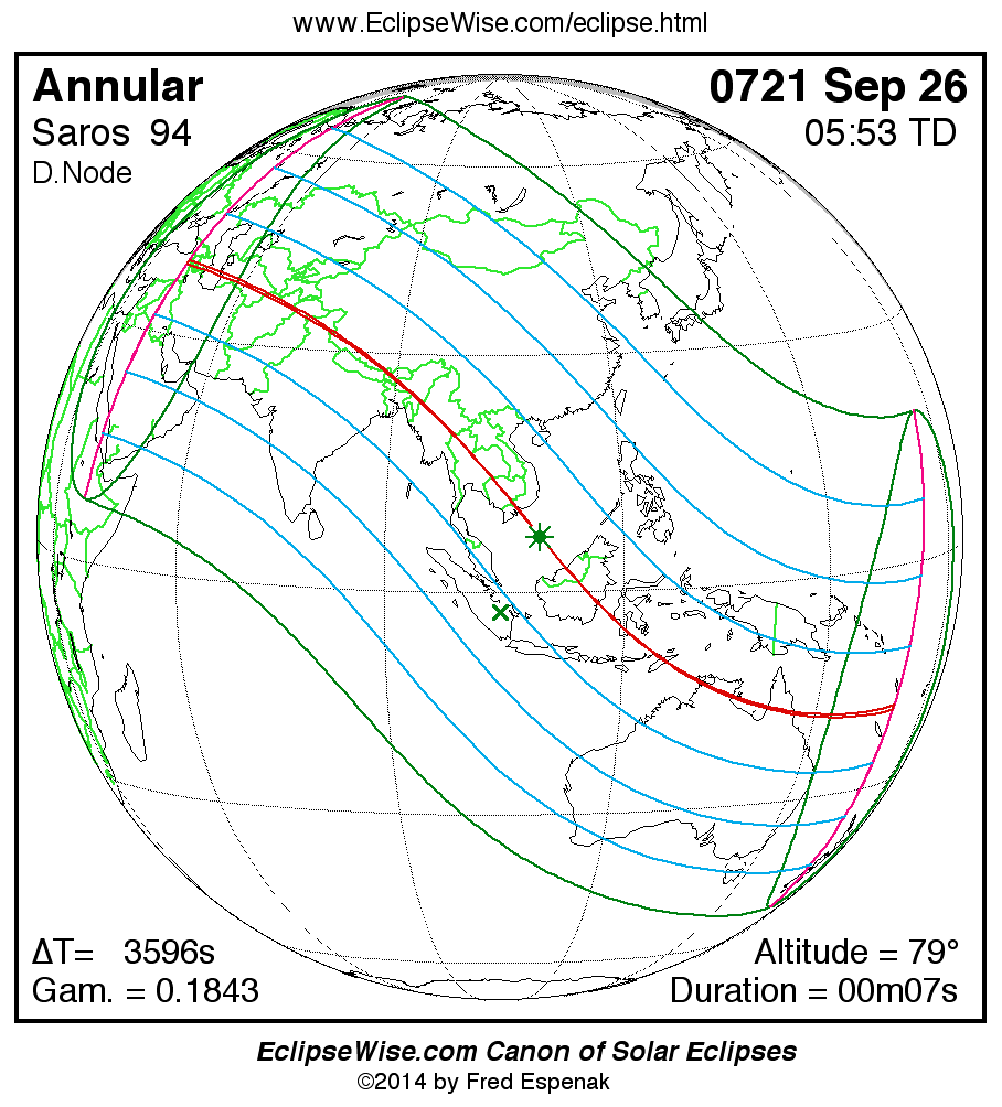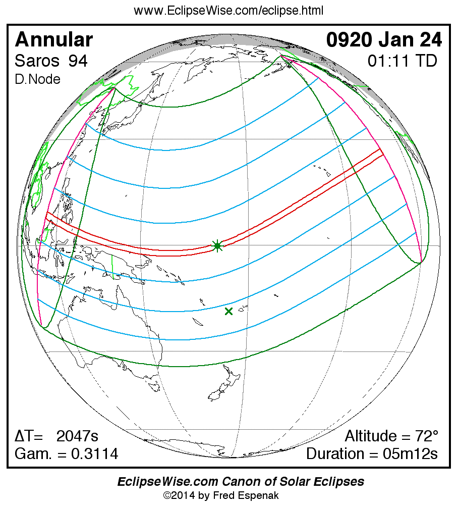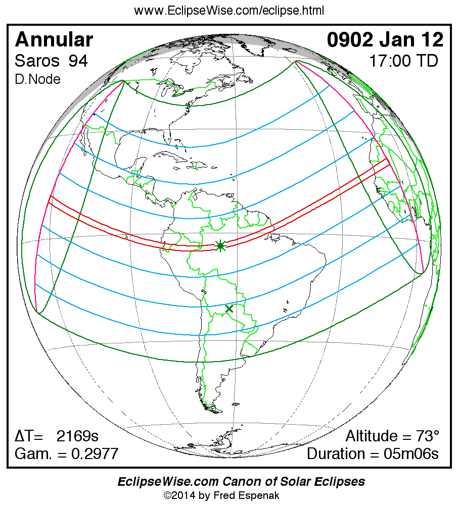 A panorama of all solar eclipses belonging to Saros 94 is presented here. Each map depicts the geographic region of visibility for a single eclipse. For central eclipses, the total or annular path is plotted in either blue (total) or red (annular). The date and time is given for the instant of Greatest Eclipse. Every map serves as a hyperlink to the EclipseWise Prime page for that eclipse where a larger map and complete details for the eclipse can be found. Visit the Key to Solar Eclipse Maps for a detailed explanation of these maps. Near the bottom of the page are a series of hyperlinks for more on solar eclipses.