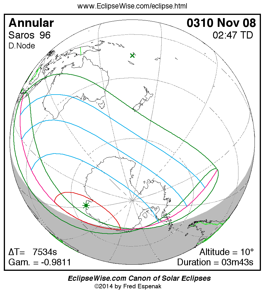 A panorama of all solar eclipses belonging to Saros 96 is presented here. Each map depicts the geographic region of visibility for a single eclipse. For central eclipses, the total or annular path is plotted in either blue (total) or red (annular). The date and time is given for the instant of Greatest Eclipse. Every map serves as a hyperlink to the EclipseWise Prime page for that eclipse where a larger map and complete details for the eclipse can be found. Visit the Key to Solar Eclipse Maps for a detailed explanation of these maps. Near the bottom of the page are a series of hyperlinks for more on solar eclipses.