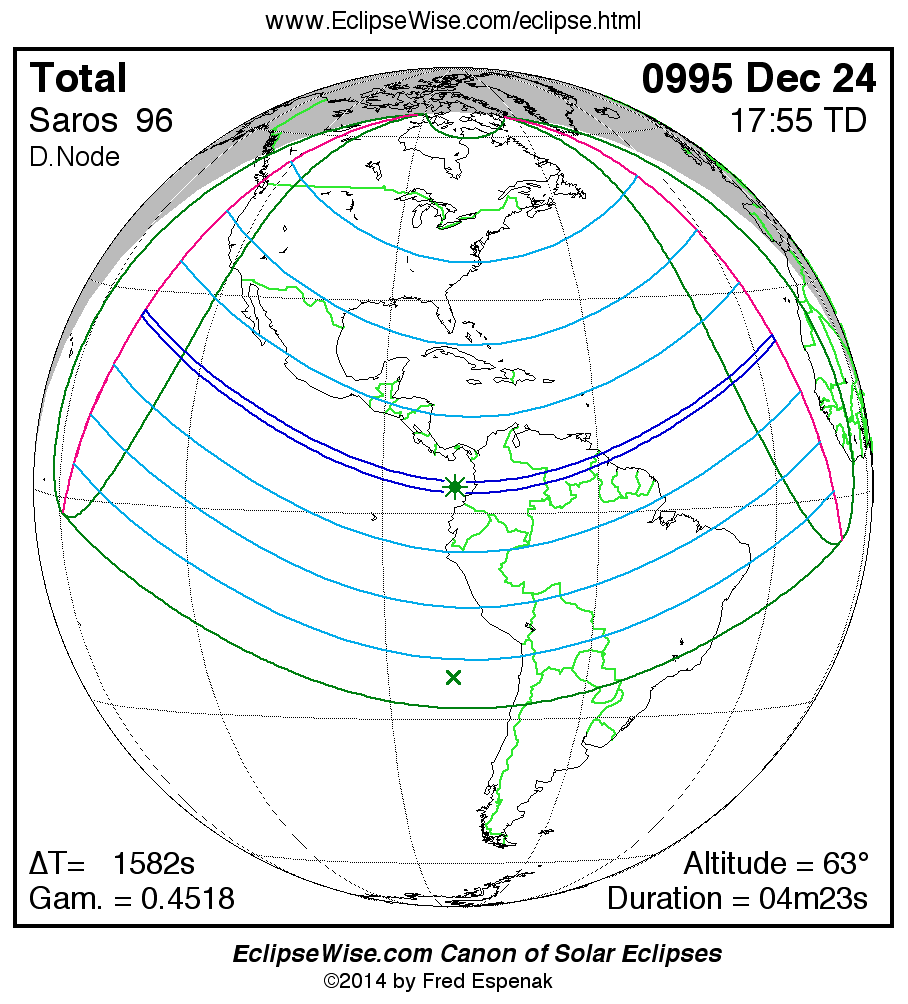 The Saros panorama below is arranged in horizontal rows of 3 eclipses. So one eclipse to the left or right is a difference of 1 Saros cycle, and one eclipse above or below is a difference of 1 exeligmos. By scanning a column of the table, it reveals how the geographic visibility of eclipses separated by an exeligmos slowly changes.