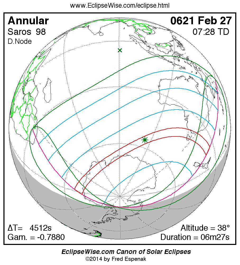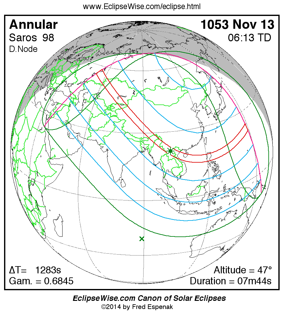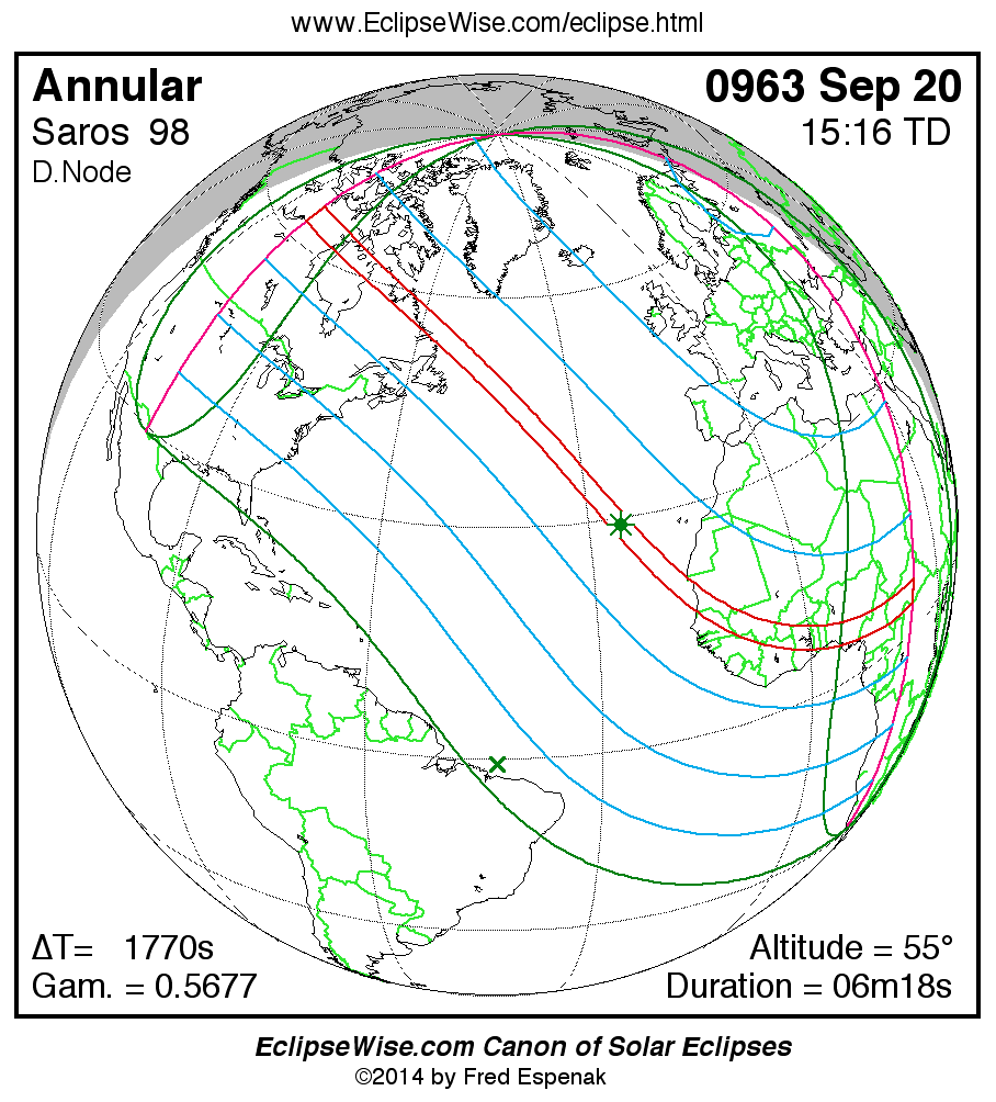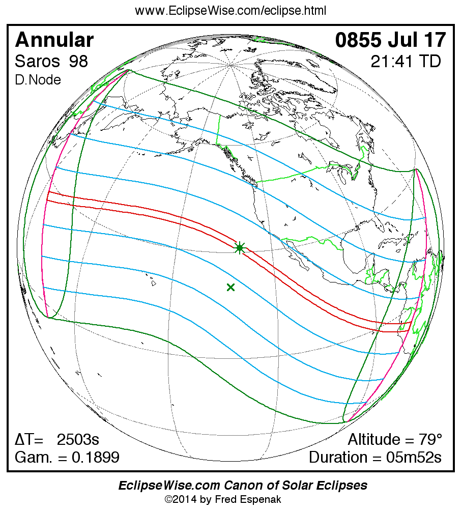 A panorama of all solar eclipses belonging to Saros 98 is presented here. Each map depicts the geographic region of visibility for a single eclipse. For central eclipses, the total or annular path is plotted in either blue (total) or red (annular). The date and time is given for the instant of Greatest Eclipse. Every map serves as a hyperlink to the EclipseWise Prime page for that eclipse where a larger map and complete details for the eclipse can be found. Visit the Key to Solar Eclipse Maps for a detailed explanation of these maps. Near the bottom of the page are a series of hyperlinks for more on solar eclipses.