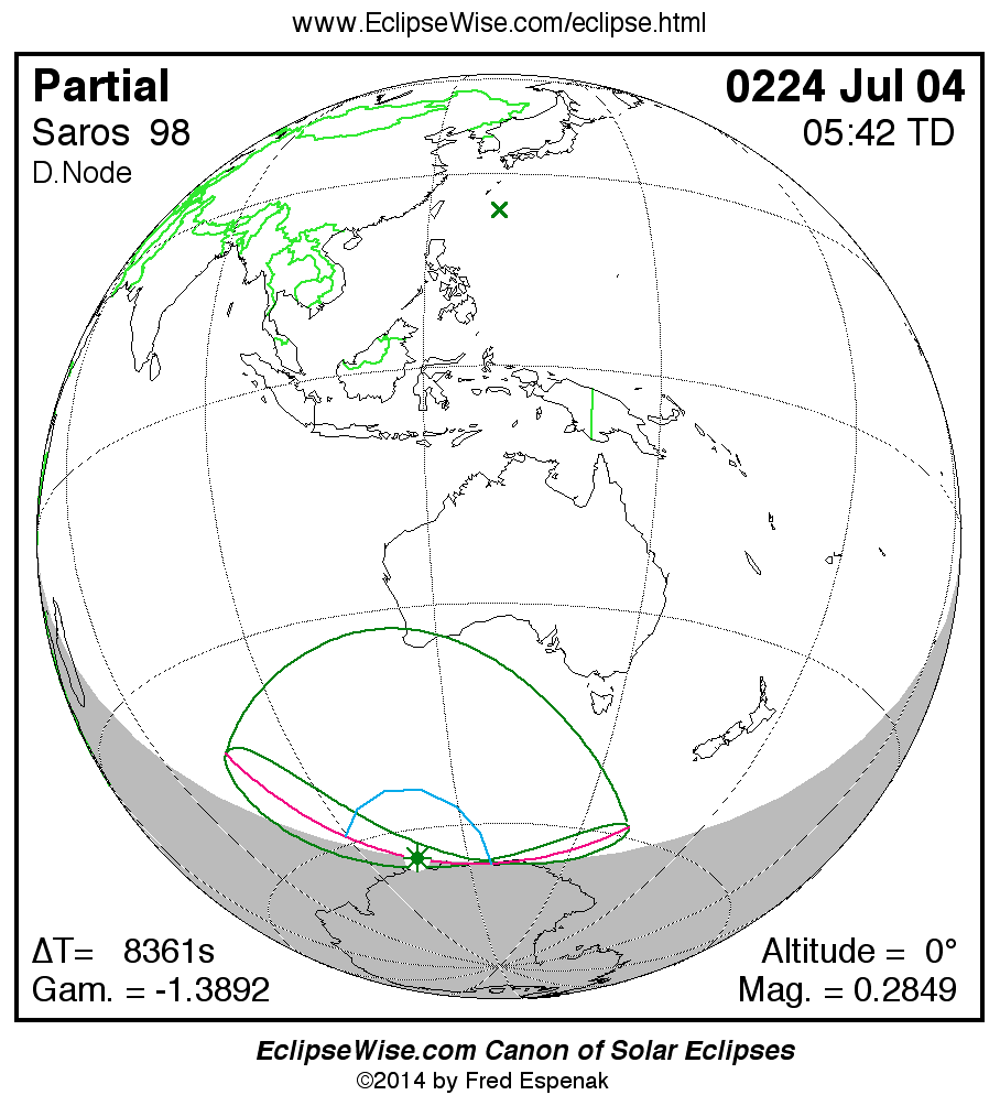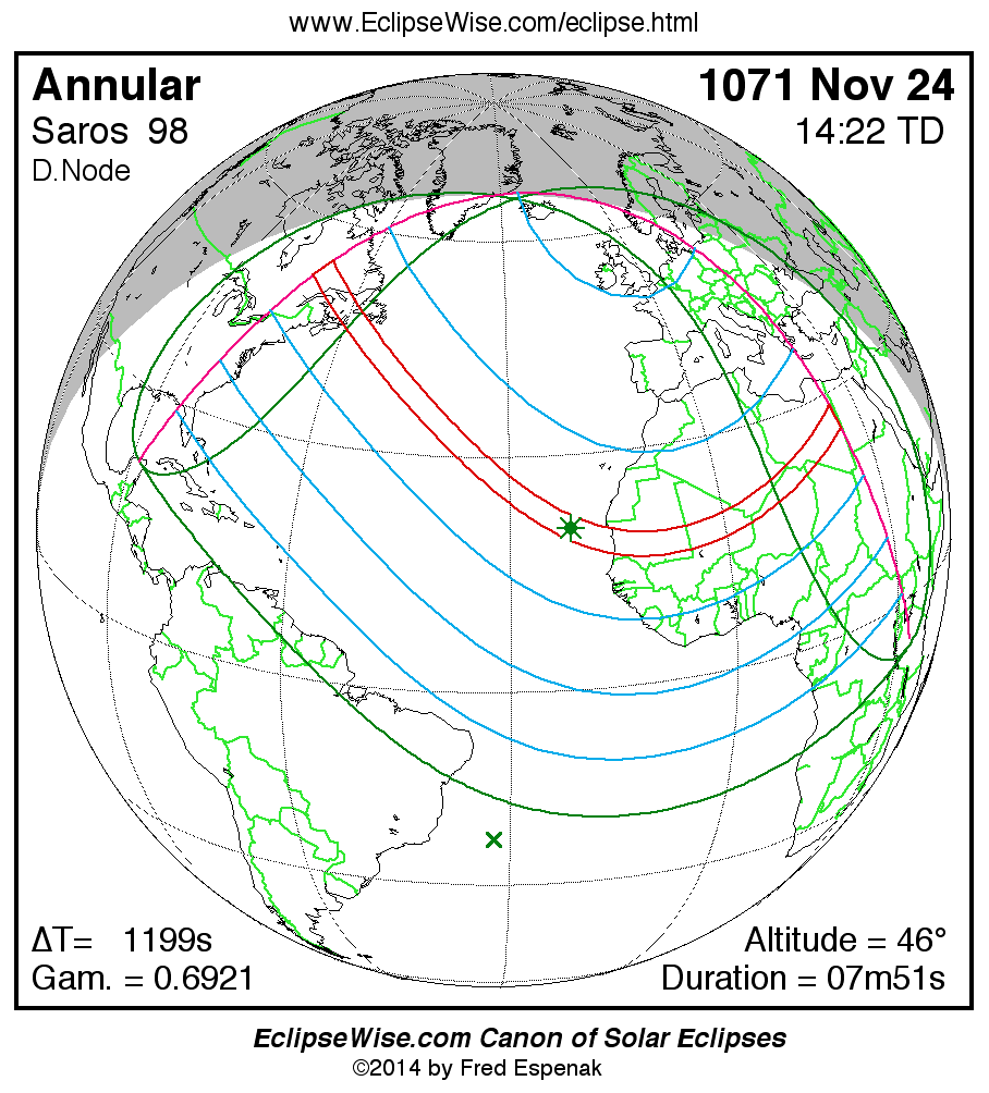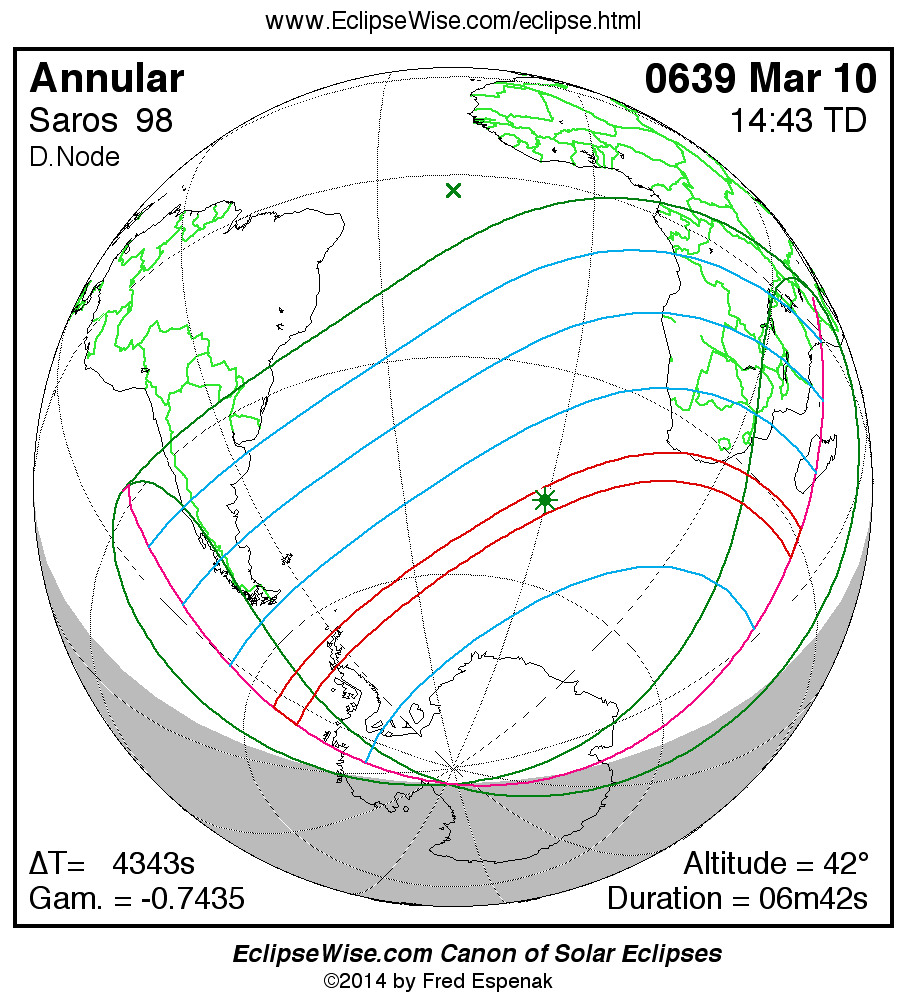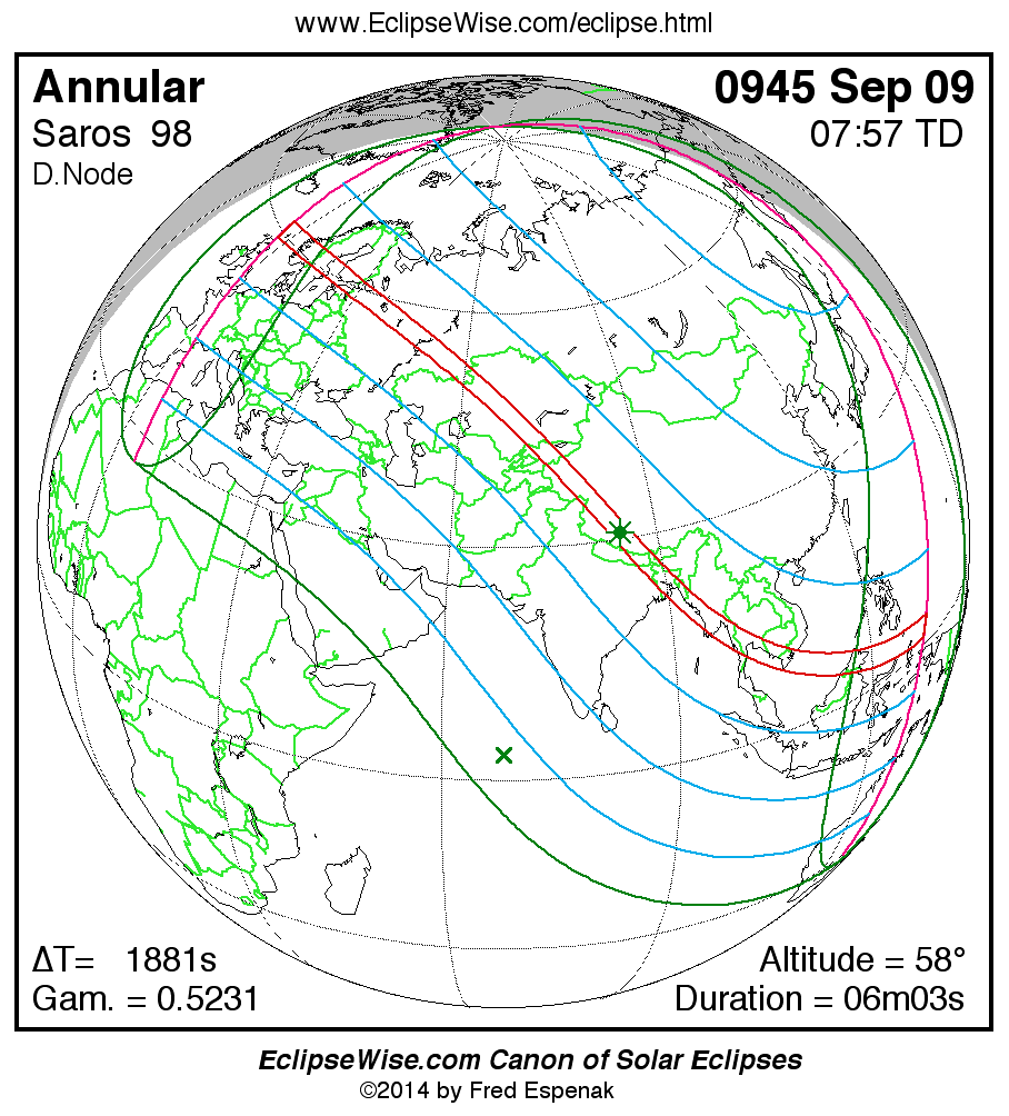 A panorama of all solar eclipses belonging to Saros 98 is presented here. Each map depicts the geographic region of visibility for a single eclipse. For central eclipses, the total or annular path is plotted in either blue (total) or red (annular). The date and time is given for the instant of Greatest Eclipse. Every map serves as a hyperlink to the EclipseWise Prime page for that eclipse where a larger map and complete details for the eclipse can be found. Visit the Key to Solar Eclipse Maps for a detailed explanation of these maps. Near the bottom of the page are a series of hyperlinks for more on solar eclipses.