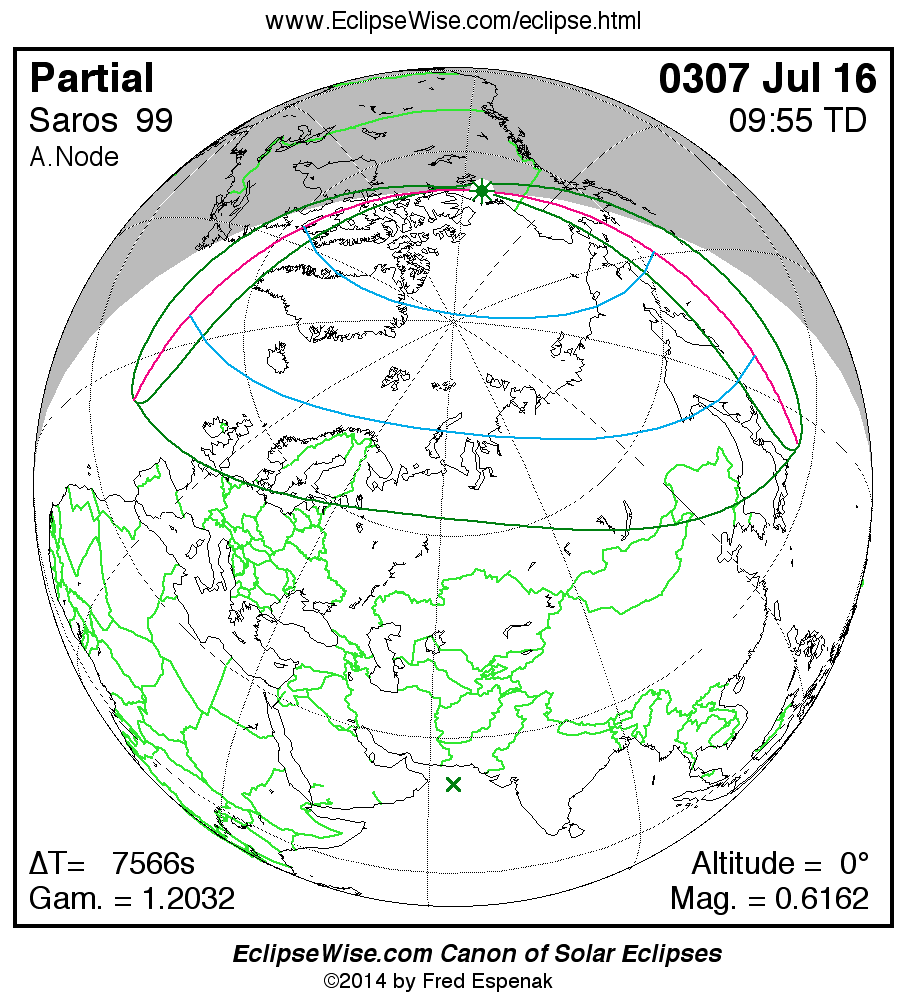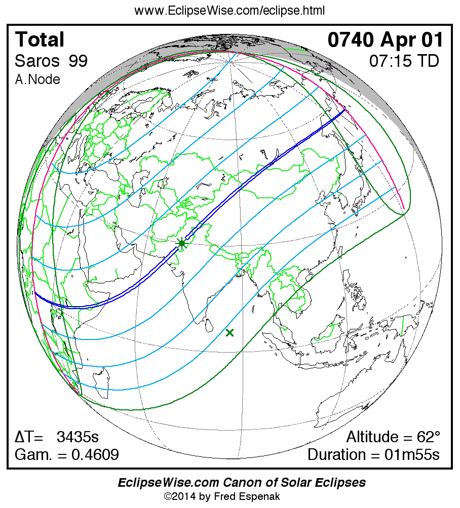A panorama of all solar eclipses belonging to Saros 99 is presented here. Each map depicts the geographic region of visibility for a single eclipse. For central eclipses, the total or annular path is plotted in either blue (total) or red (annular). The date and time is given for the instant of Greatest Eclipse. Every map serves as a hyperlink to the EclipseWise Prime page for that eclipse where a larger map and complete details for the eclipse can be found. Visit the Key to Solar Eclipse Maps for a detailed explanation of these maps. Near the bottom of the page are a series of hyperlinks for more on solar eclipses.