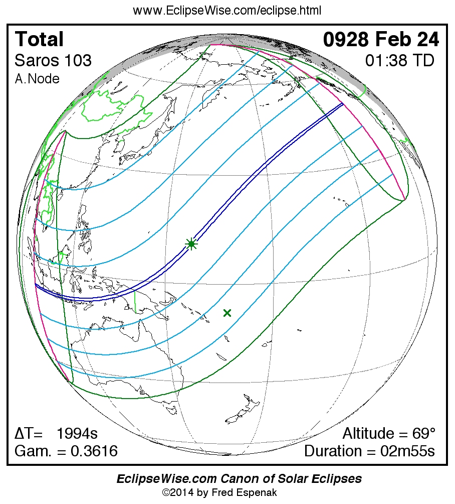 A panorama of all solar eclipses belonging to Saros 103 is presented here. Each map depicts the geographic region of visibility for a single eclipse. For central eclipses, the total or annular path is plotted in either blue (total) or red (annular). The date and time is given for the instant of Greatest Eclipse. Every map serves as a hyperlink to the EclipseWise Prime page for that eclipse where a larger map and complete details for the eclipse can be found. Visit the Key to Solar Eclipse Maps for a detailed explanation of these maps. Near the bottom of the page are a series of hyperlinks for more on solar eclipses.