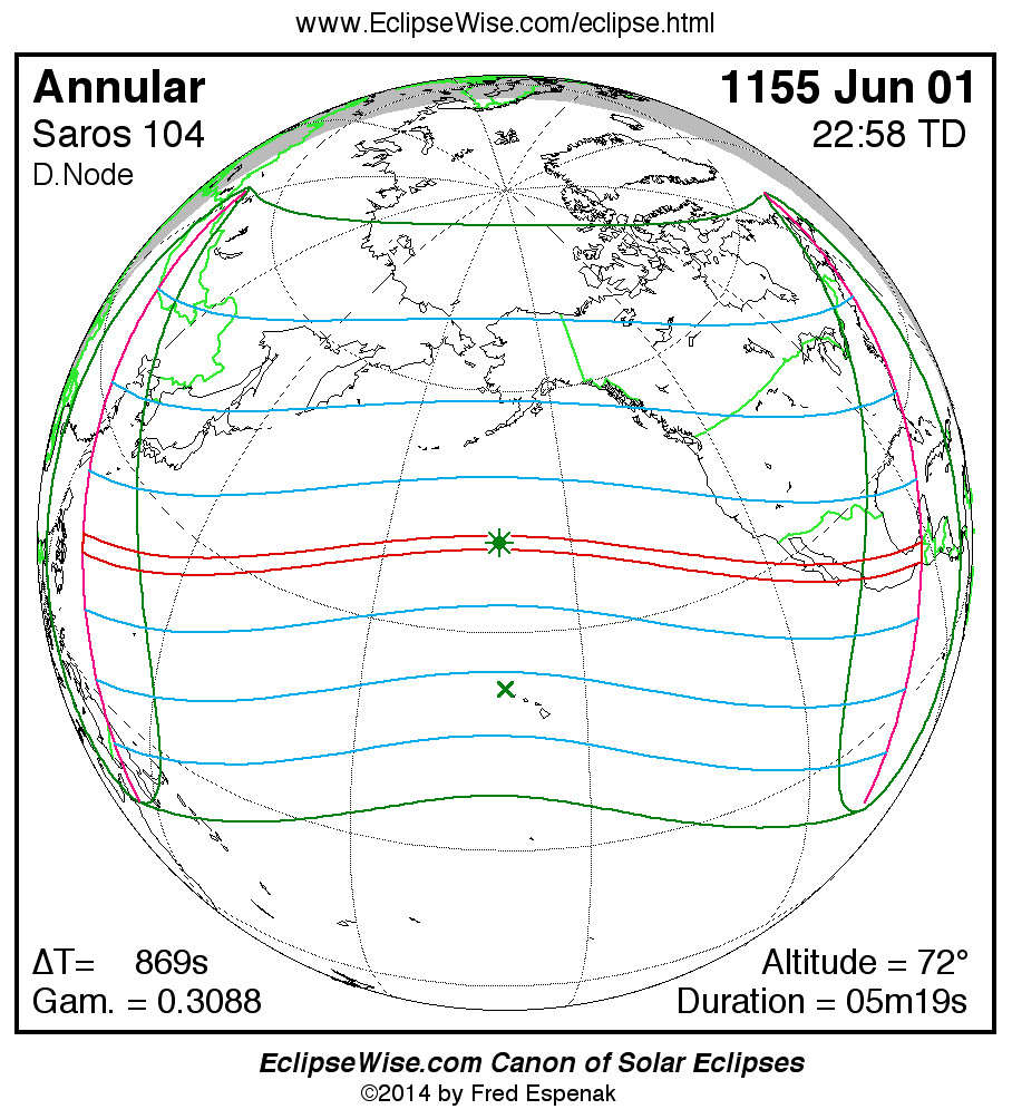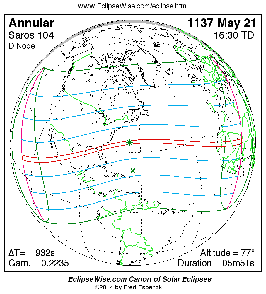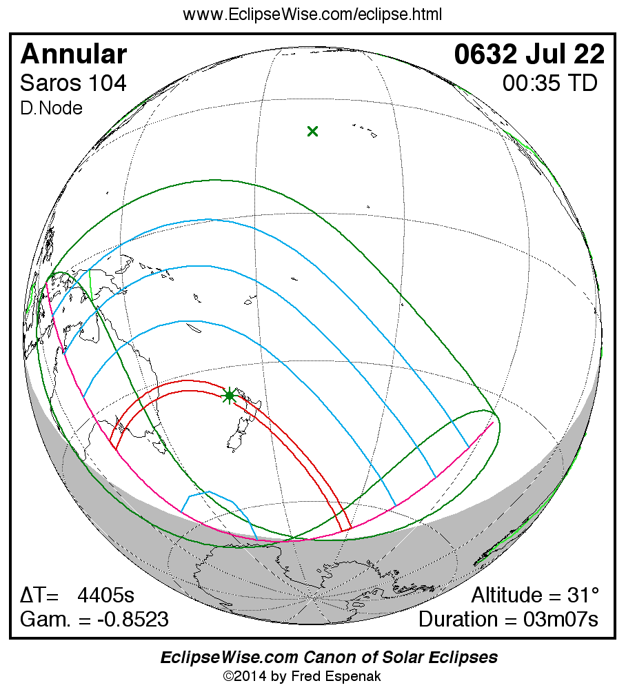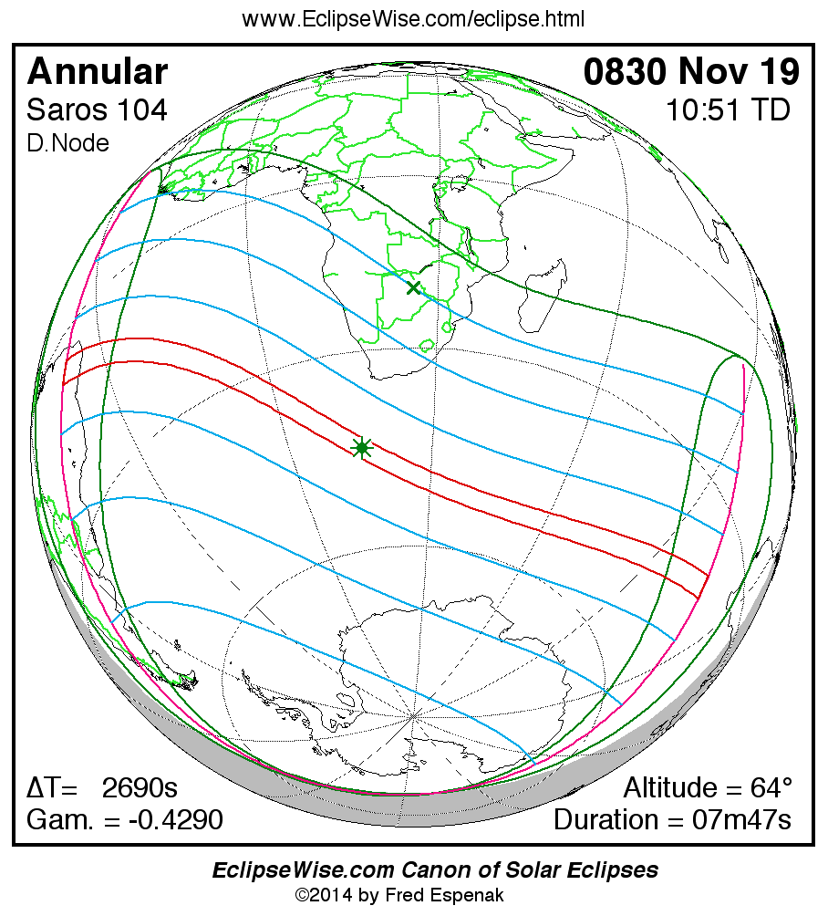 A panorama of all solar eclipses belonging to Saros 104 is presented here. Each map depicts the geographic region of visibility for a single eclipse. For central eclipses, the total or annular path is plotted in either blue (total) or red (annular). The date and time is given for the instant of Greatest Eclipse. Every map serves as a hyperlink to the EclipseWise Prime page for that eclipse where a larger map and complete details for the eclipse can be found. Visit the Key to Solar Eclipse Maps for a detailed explanation of these maps. Near the bottom of the page are a series of hyperlinks for more on solar eclipses.