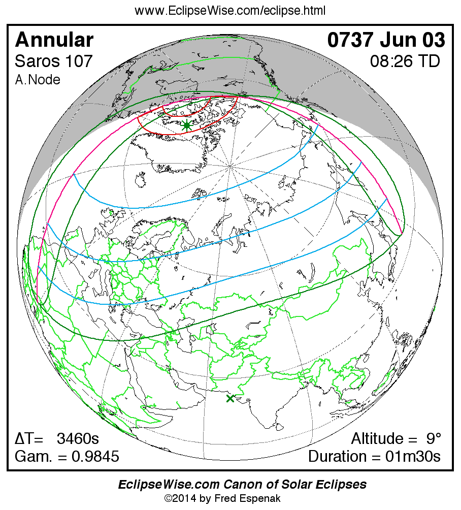 A panorama of all solar eclipses belonging to Saros 107 is presented here. Each map depicts the geographic region of visibility for a single eclipse. For central eclipses, the total or annular path is plotted in either blue (total) or red (annular). The date and time is given for the instant of Greatest Eclipse. Every map serves as a hyperlink to the EclipseWise Prime page for that eclipse where a larger map and complete details for the eclipse can be found. Visit the Key to Solar Eclipse Maps for a detailed explanation of these maps. Near the bottom of the page are a series of hyperlinks for more on solar eclipses.