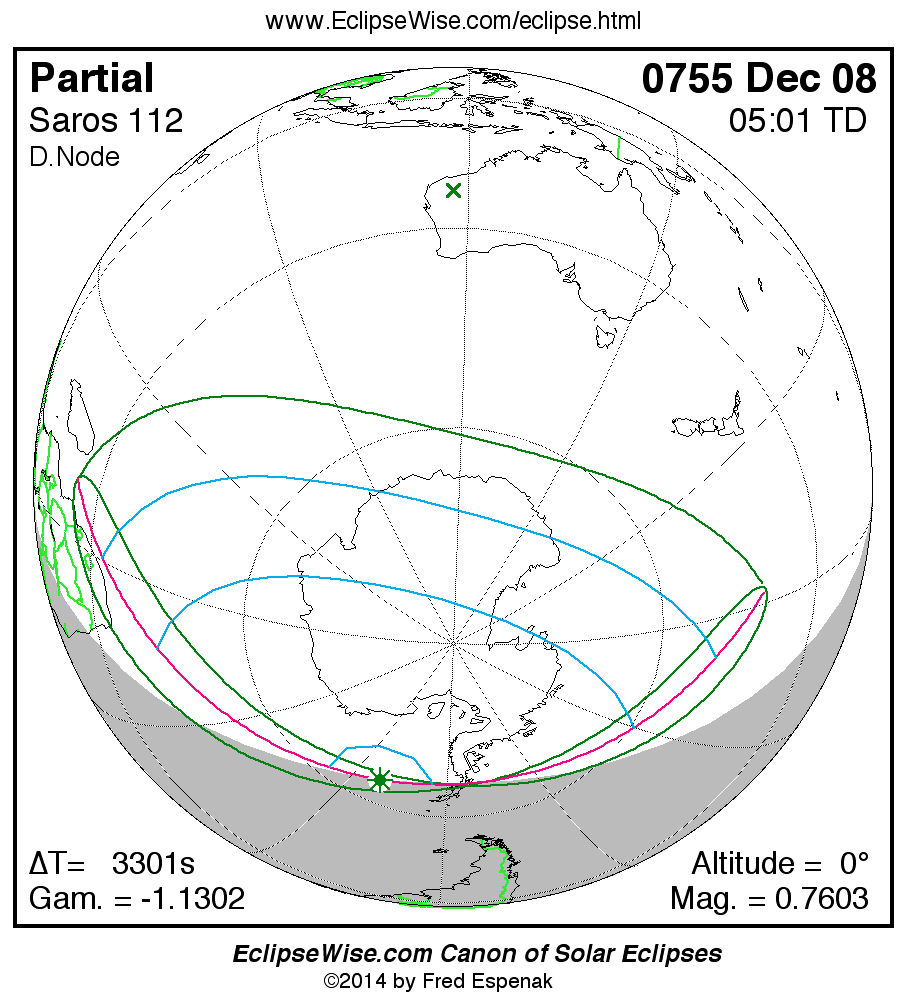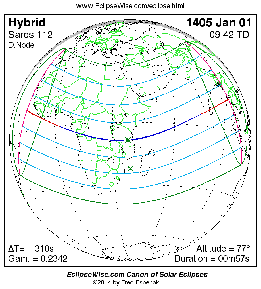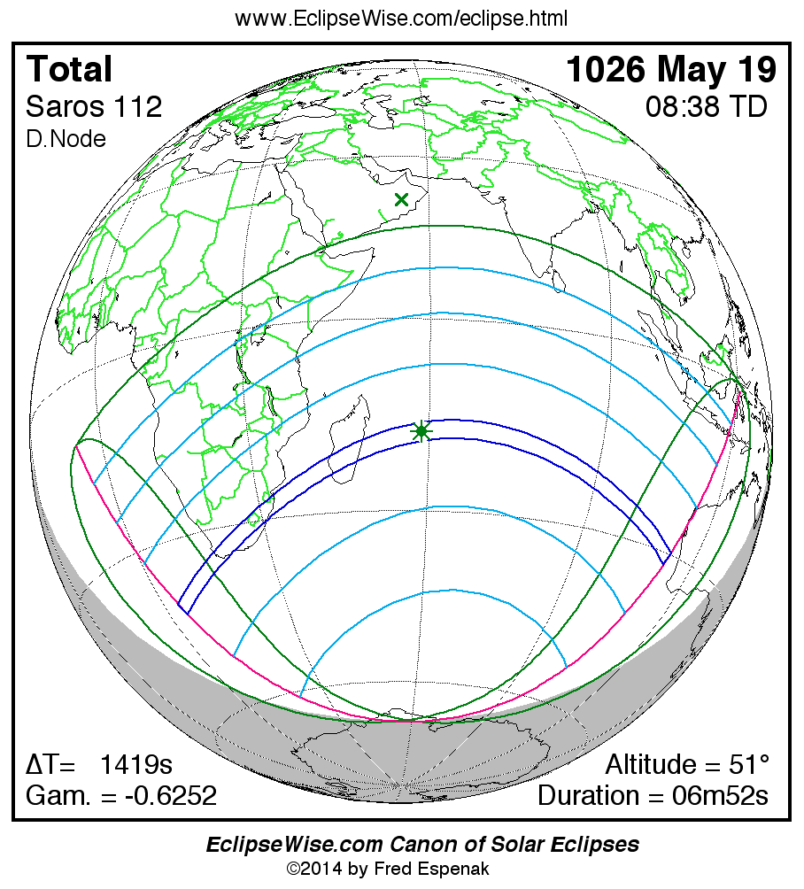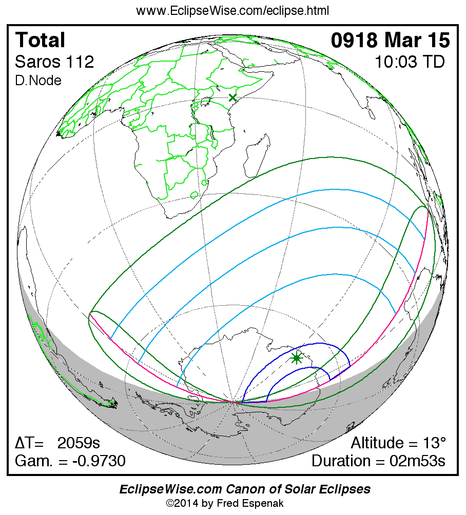 A panorama of all solar eclipses belonging to Saros 112 is presented here. Each map depicts the geographic region of visibility for a single eclipse. For central eclipses, the total or annular path is plotted in either blue (total) or red (annular). The date and time is given for the instant of Greatest Eclipse. Every map serves as a hyperlink to the EclipseWise Prime page for that eclipse where a larger map and complete details for the eclipse can be found. Visit the Key to Solar Eclipse Maps for a detailed explanation of these maps. Near the bottom of the page are a series of hyperlinks for more on solar eclipses.