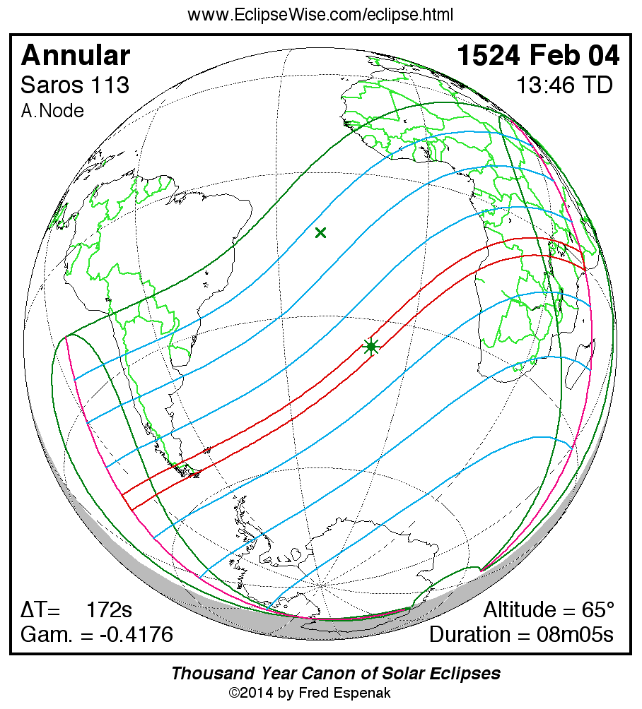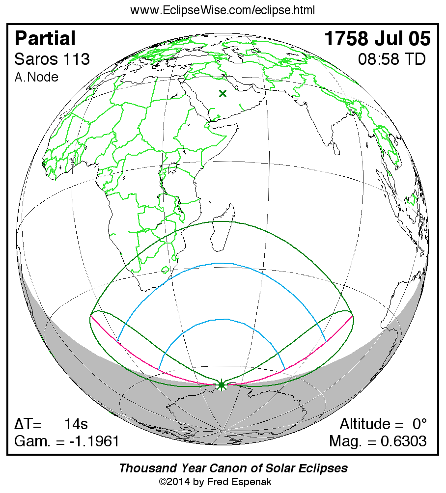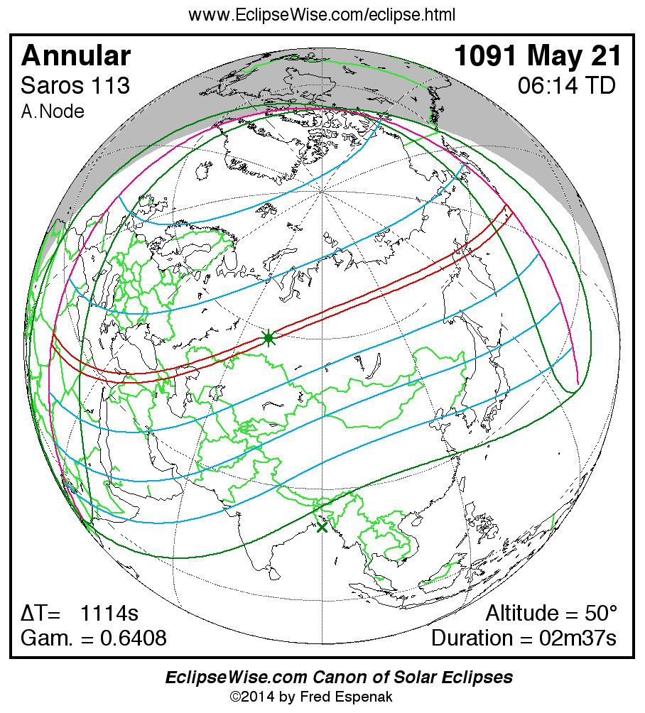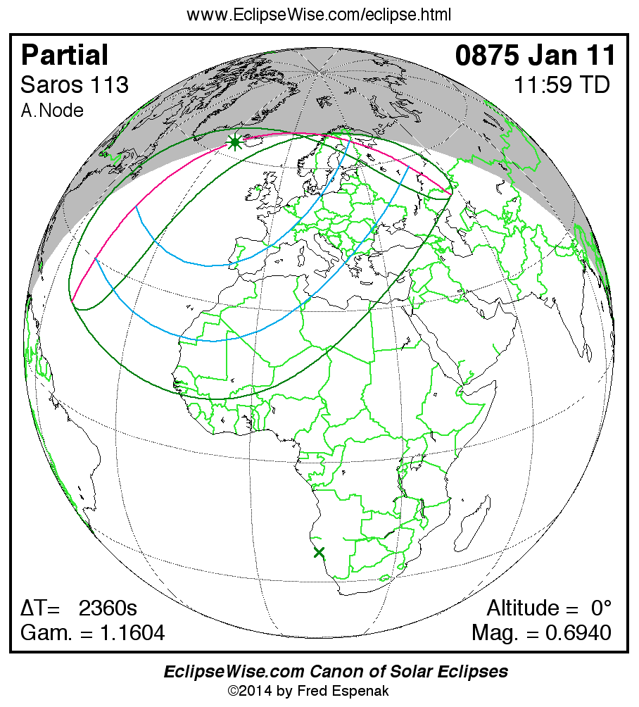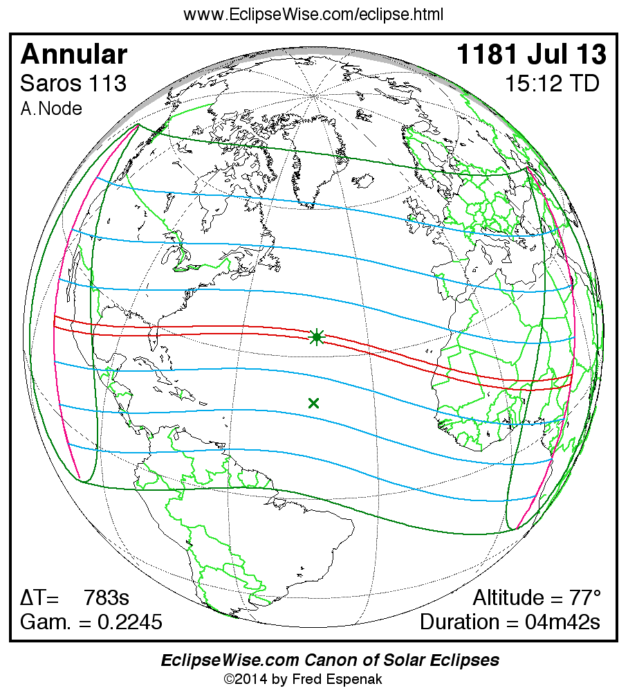 A panorama of all solar eclipses belonging to Saros 113 is presented here. Each map depicts the geographic region of visibility for a single eclipse. For central eclipses, the total or annular path is plotted in either blue (total) or red (annular). The date and time is given for the instant of Greatest Eclipse. Every map serves as a hyperlink to the EclipseWise Prime page for that eclipse where a larger map and complete details for the eclipse can be found. Visit the Key to Solar Eclipse Maps for a detailed explanation of these maps. Near the bottom of the page are a series of hyperlinks for more on solar eclipses.
