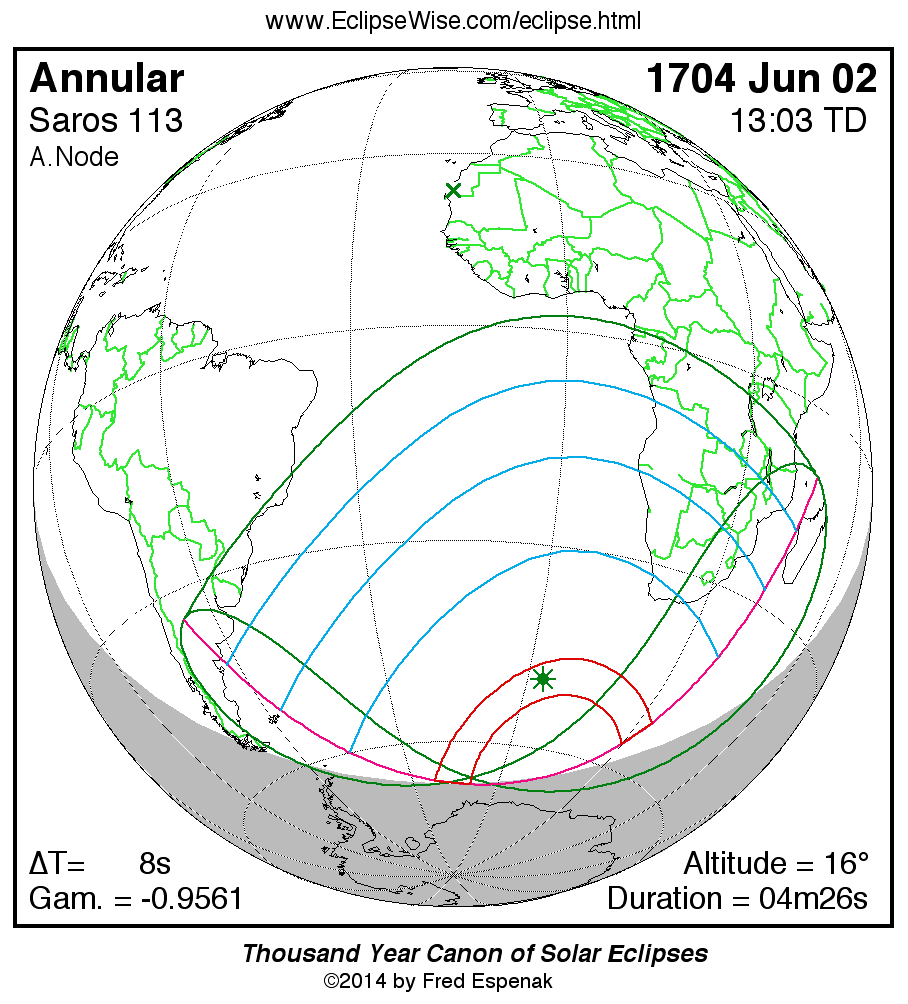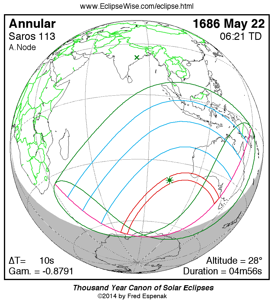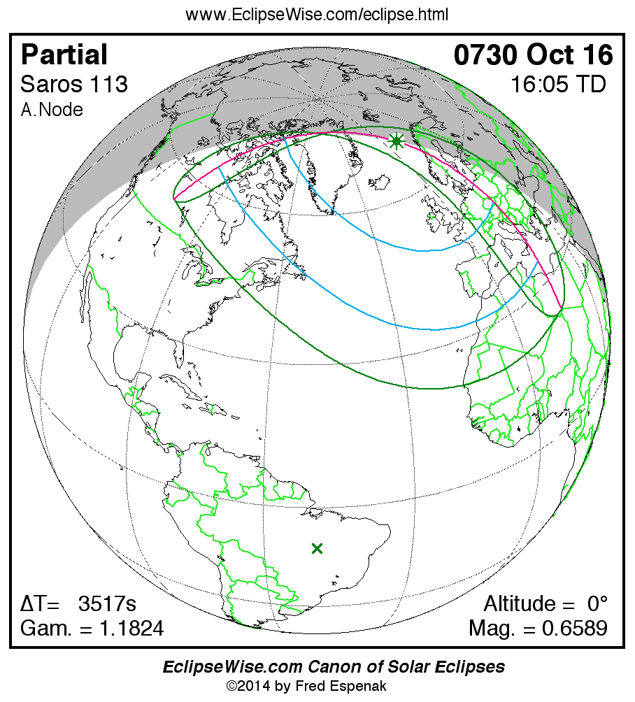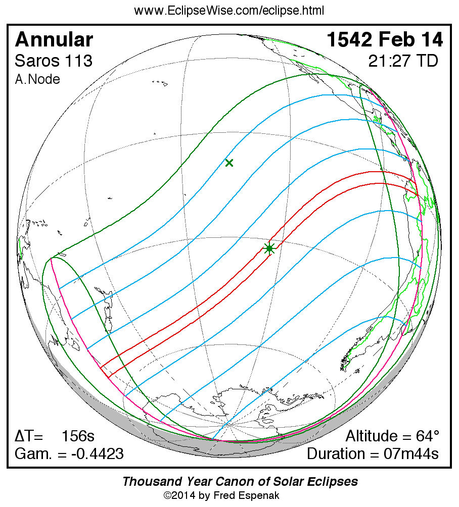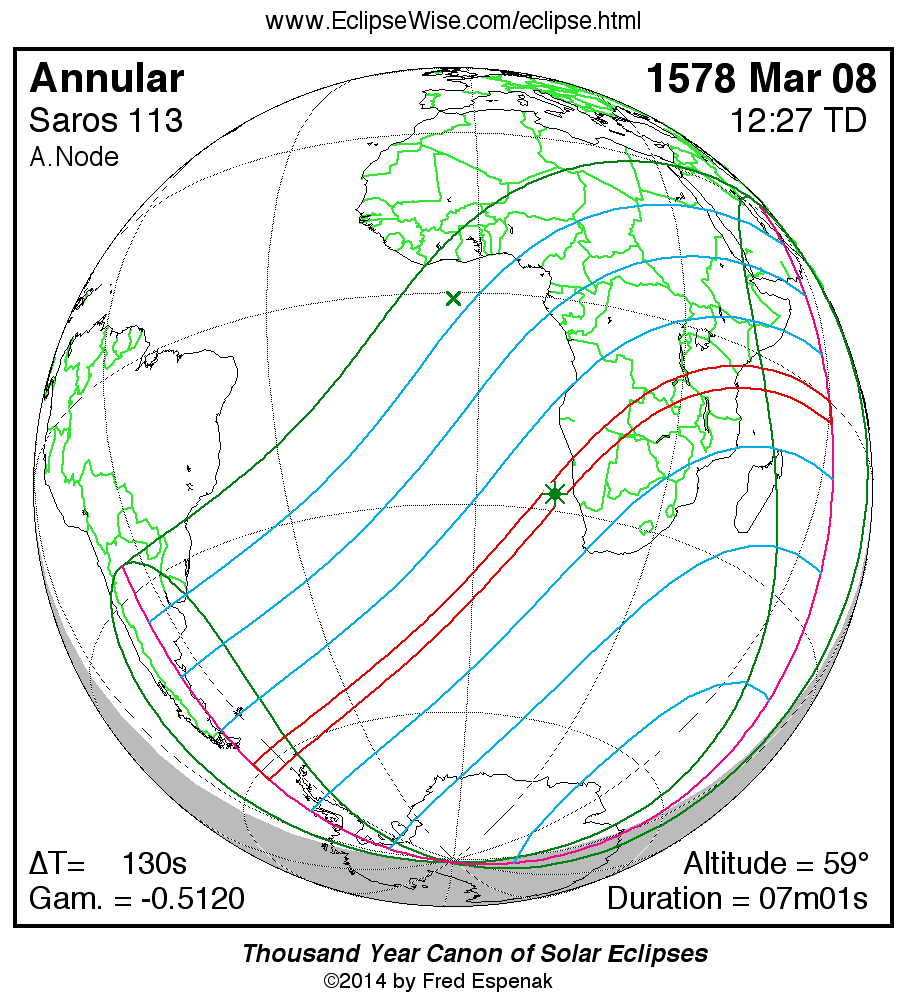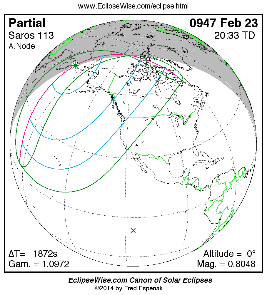 A panorama of all solar eclipses belonging to Saros 113 is presented here. Each map depicts the geographic region of visibility for a single eclipse. For central eclipses, the total or annular path is plotted in either blue (total) or red (annular). The date and time is given for the instant of Greatest Eclipse. Every map serves as a hyperlink to the EclipseWise Prime page for that eclipse where a larger map and complete details for the eclipse can be found. Visit the Key to Solar Eclipse Maps for a detailed explanation of these maps. Near the bottom of the page are a series of hyperlinks for more on solar eclipses.