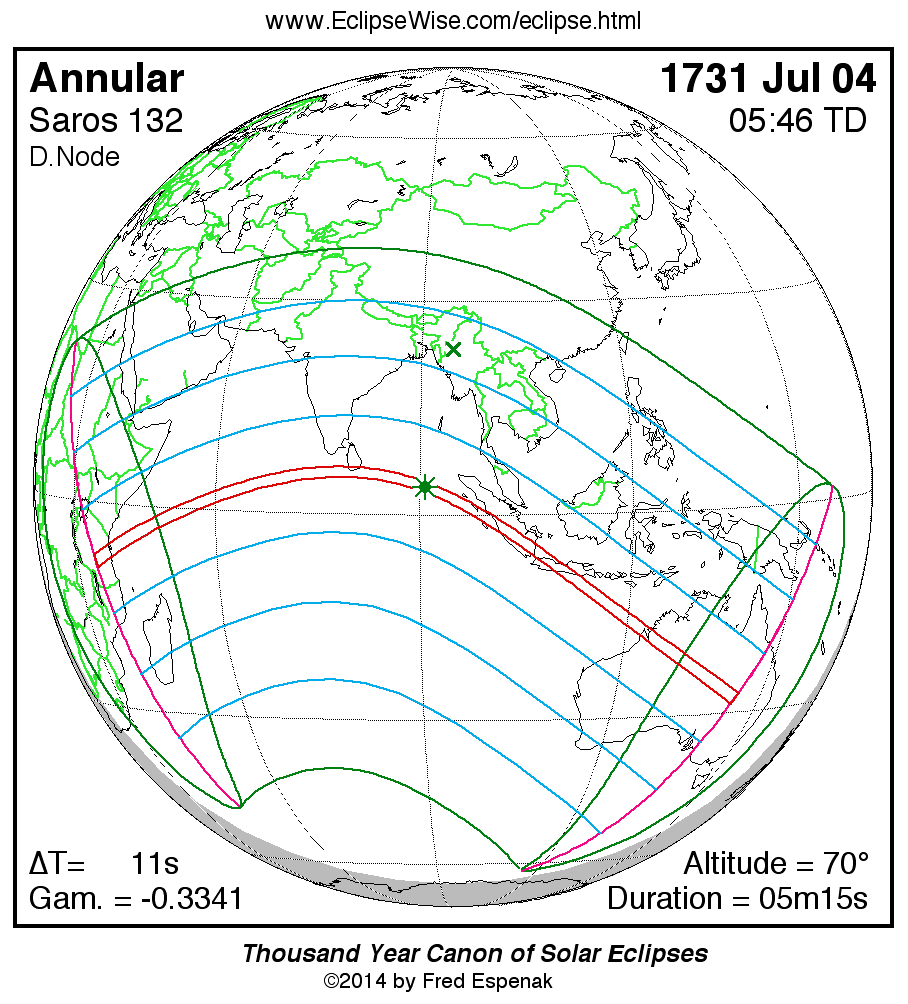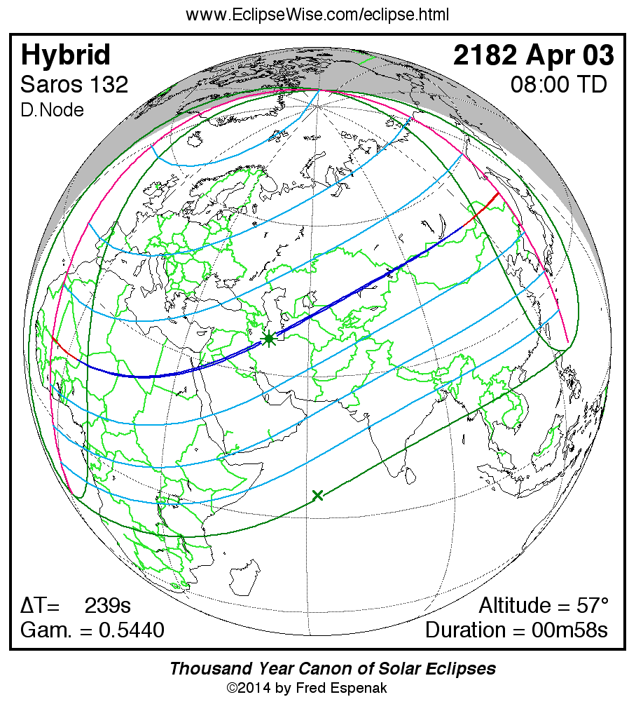 A panorama of all solar eclipses belonging to Saros 132 is presented here. Each map depicts the geographic region of visibility for a single eclipse. For central eclipses, the total or annular path is plotted in either blue (total) or red (annular). The date and time is given for the instant of Greatest Eclipse. Every map serves as a hyperlink to the EclipseWise Prime page for that eclipse where a larger map and complete details for the eclipse can be found. Visit the Key to Solar Eclipse Maps for a detailed explanation of these maps. Near the bottom of the page are a series of hyperlinks for more on solar eclipses.