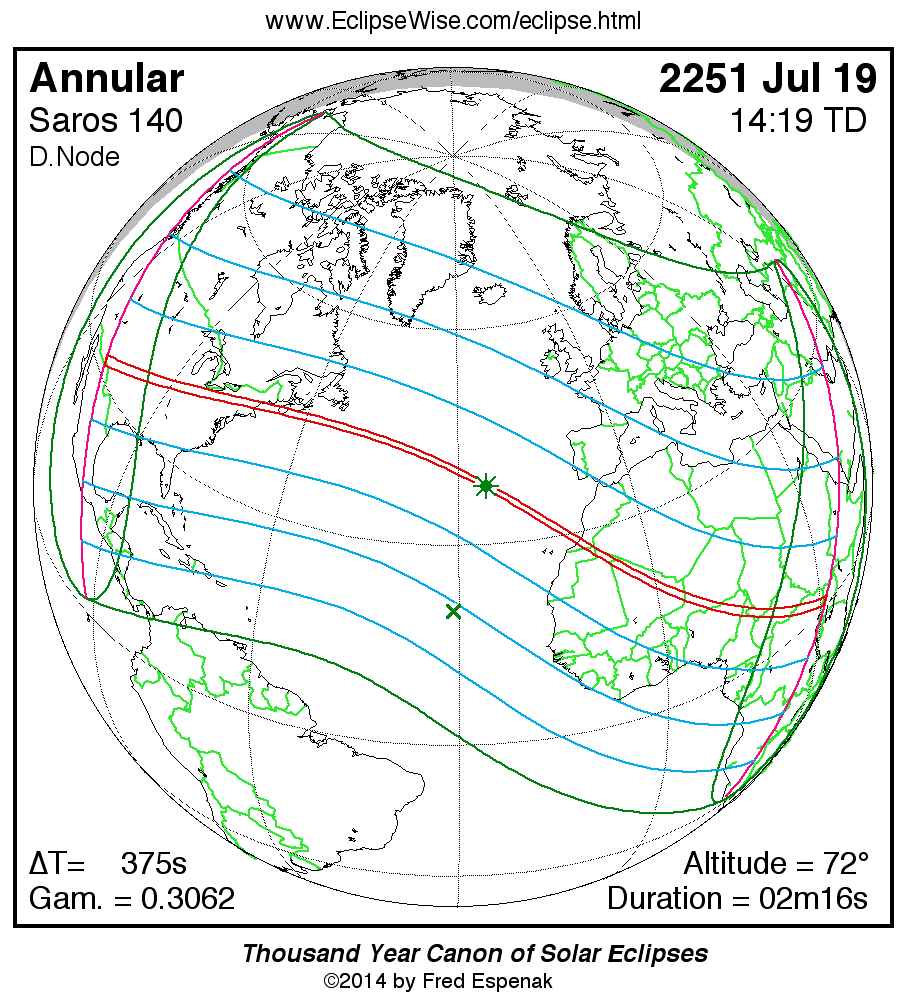 A panorama of all solar eclipses belonging to Saros 140 is presented here. Each map depicts the geographic region of visibility for a single eclipse. For central eclipses, the total or annular path is plotted in either blue (total) or red (annular). The date and time is given for the instant of Greatest Eclipse. Every map serves as a hyperlink to the EclipseWise Prime page for that eclipse where a larger map and complete details for the eclipse can be found. Visit the Key to Solar Eclipse Maps for a detailed explanation of these maps. Near the bottom of the page are a series of hyperlinks for more on solar eclipses.