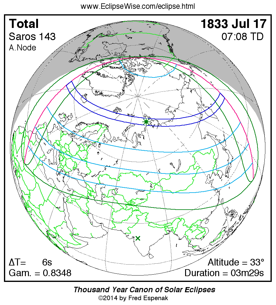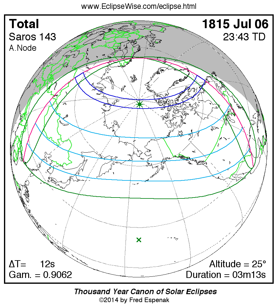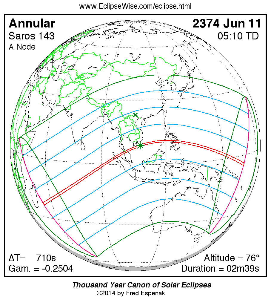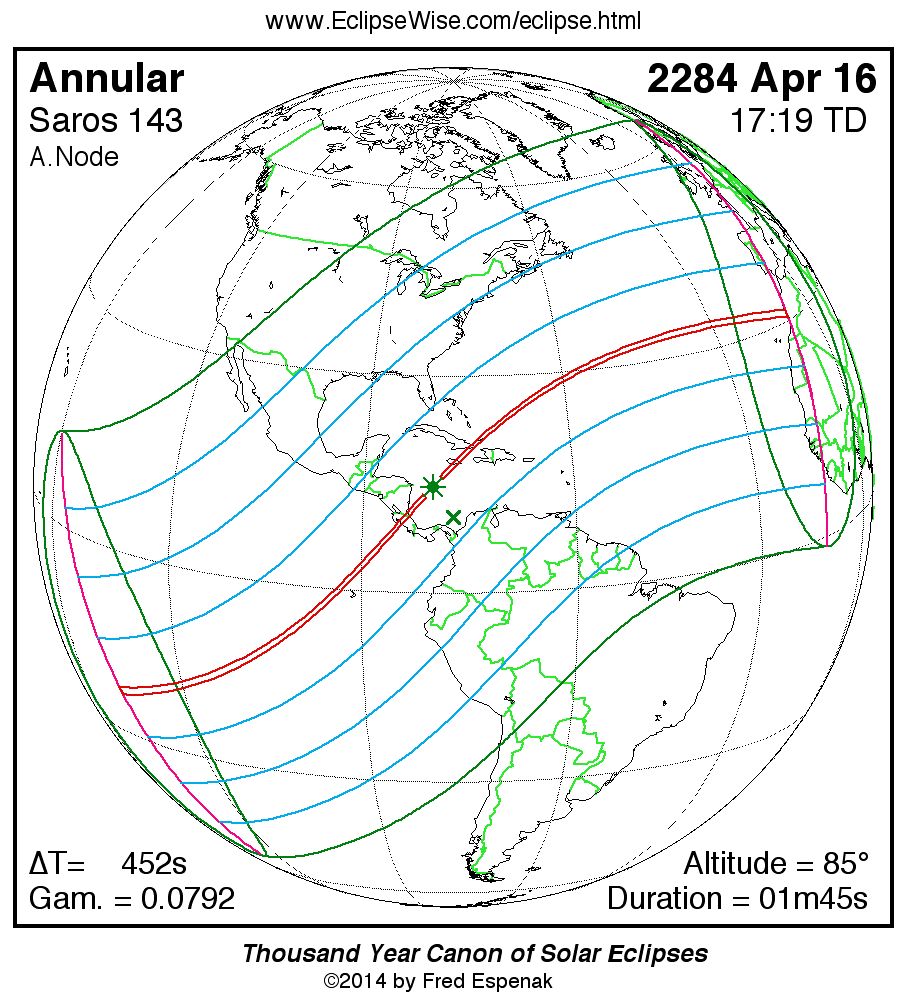 A panorama of all solar eclipses belonging to Saros 143 is presented here. Each map depicts the geographic region of visibility for a single eclipse. For central eclipses, the total or annular path is plotted in either blue (total) or red (annular). The date and time is given for the instant of Greatest Eclipse. Every map serves as a hyperlink to the EclipseWise Prime page for that eclipse where a larger map and complete details for the eclipse can be found. Visit the Key to Solar Eclipse Maps for a detailed explanation of these maps. Near the bottom of the page are a series of hyperlinks for more on solar eclipses.