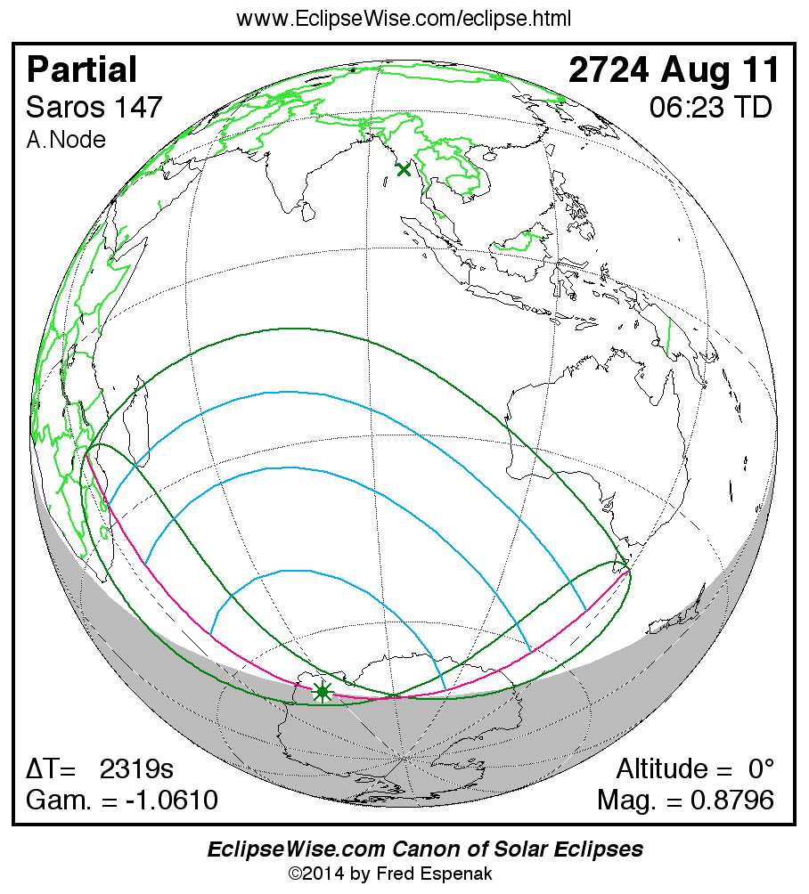 A panorama of all solar eclipses belonging to Saros 147 is presented here. Each map depicts the geographic region of visibility for a single eclipse. For central eclipses, the total or annular path is plotted in either blue (total) or red (annular). The date and time is given for the instant of Greatest Eclipse. Every map serves as a hyperlink to the EclipseWise Prime page for that eclipse where a larger map and complete details for the eclipse can be found. Visit the Key to Solar Eclipse Maps for a detailed explanation of these maps. Near the bottom of the page are a series of hyperlinks for more on solar eclipses.