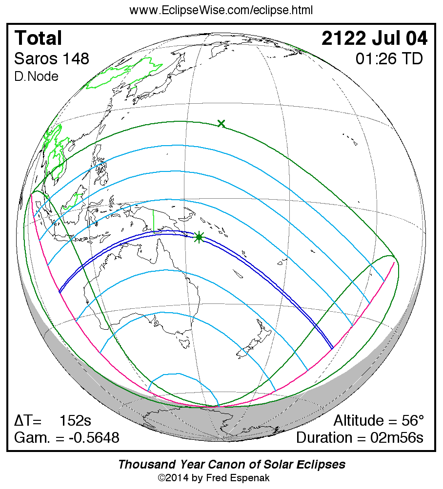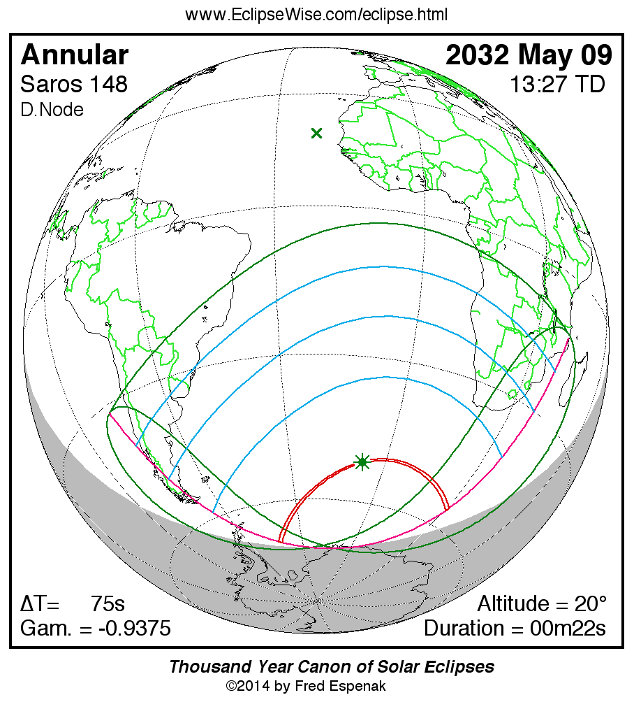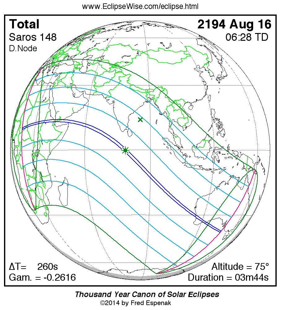 A panorama of all solar eclipses belonging to Saros 148 is presented here. Each map depicts the geographic region of visibility for a single eclipse. For central eclipses, the total or annular path is plotted in either blue (total) or red (annular). The date and time is given for the instant of Greatest Eclipse. Every map serves as a hyperlink to the EclipseWise Prime page for that eclipse where a larger map and complete details for the eclipse can be found. Visit the Key to Solar Eclipse Maps for a detailed explanation of these maps. Near the bottom of the page are a series of hyperlinks for more on solar eclipses.