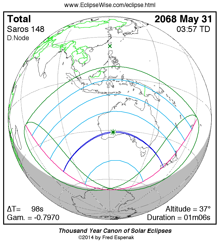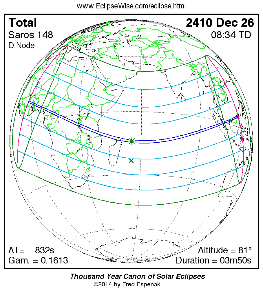 The Saros panorama below is arranged in horizontal rows of 3 eclipses. So one eclipse to the left or right is a difference of 1 Saros cycle, and one eclipse above or below is a difference of 1 exeligmos. By scanning a column of the table, it reveals how the geographic visibility of eclipses separated by an exeligmos slowly changes.