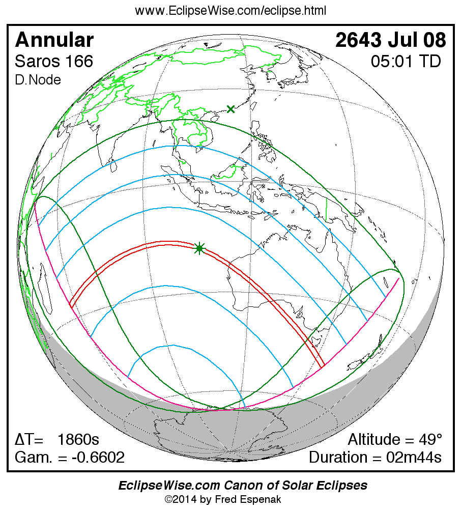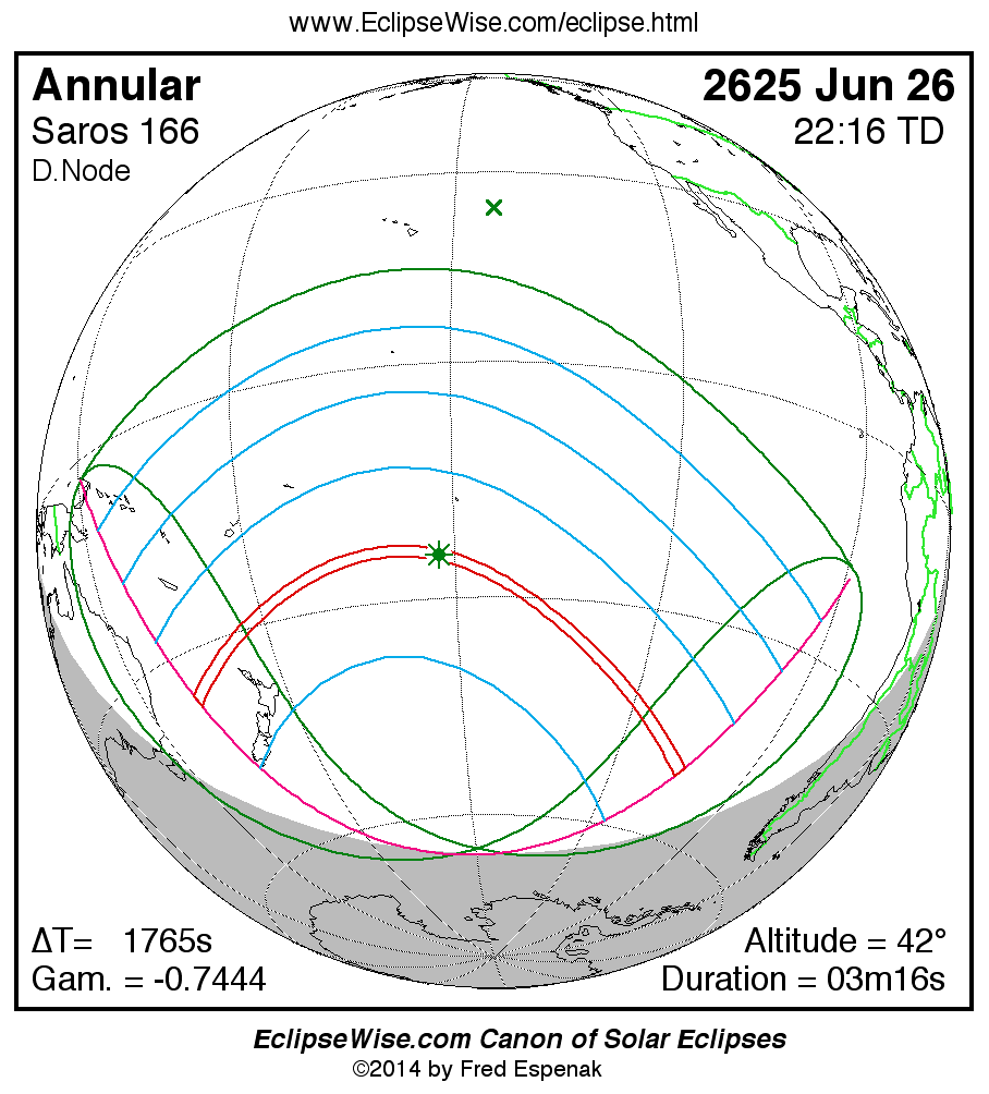 A panorama of all solar eclipses belonging to Saros 166 is presented here. Each map depicts the geographic region of visibility for a single eclipse. For central eclipses, the total or annular path is plotted in either blue (total) or red (annular). The date and time is given for the instant of Greatest Eclipse. Every map serves as a hyperlink to the EclipseWise Prime page for that eclipse where a larger map and complete details for the eclipse can be found. Visit the Key to Solar Eclipse Maps for a detailed explanation of these maps. Near the bottom of the page are a series of hyperlinks for more on solar eclipses.